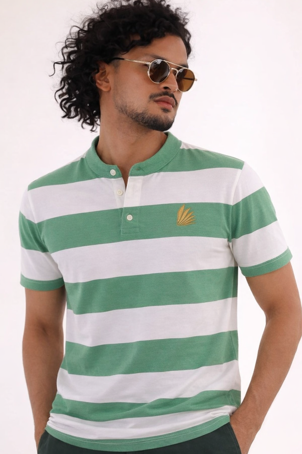 Make a fresh style statement with this green and white striped polo shirt, designed for comfort and effortless sophistication. Crafted from premium 100% cotton pique fabric, it offers a soft, breathable feel that keeps you cool and confident all day long.