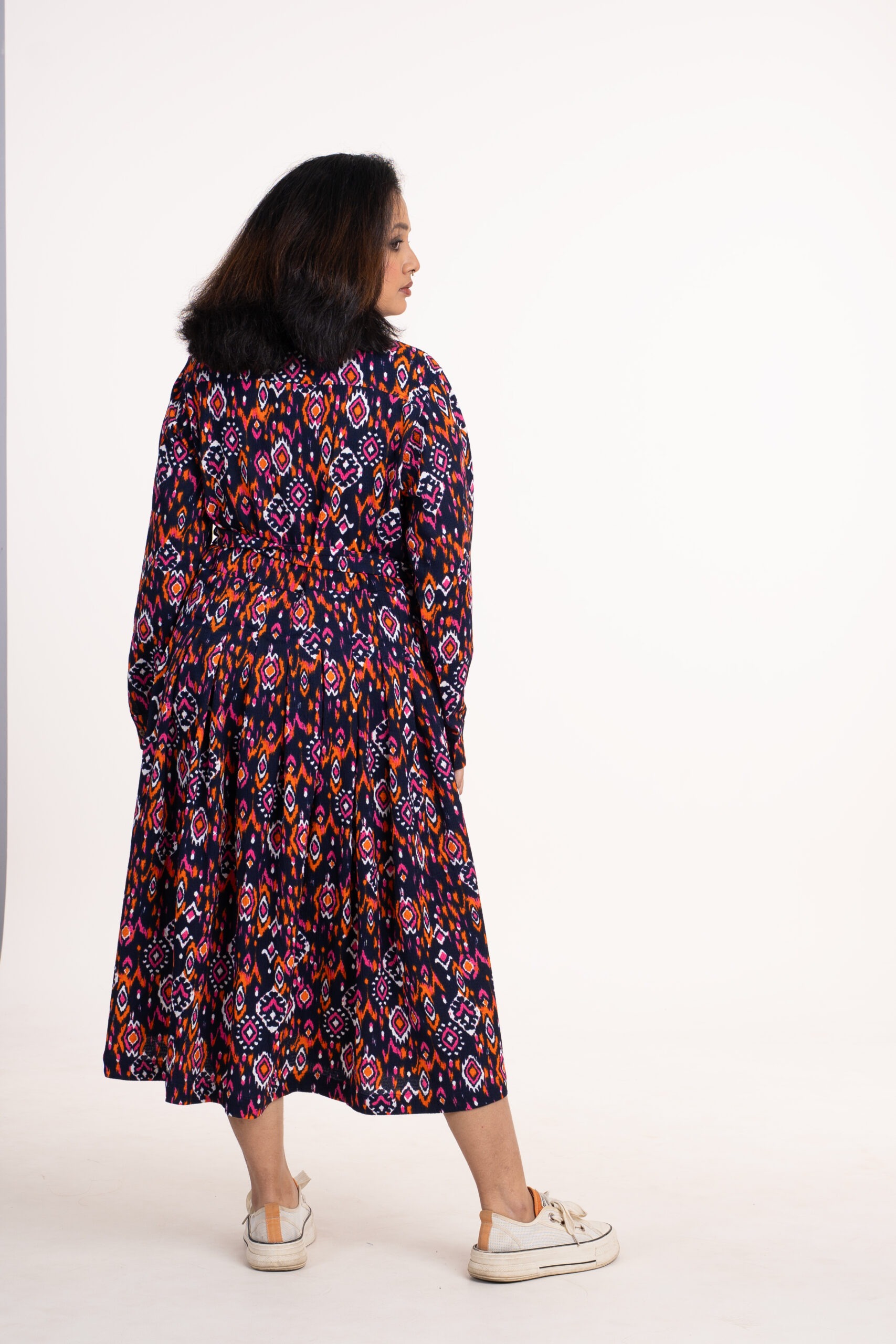 The kurti features an all-over multicolor ikat-inspired pattern set against a deep navy base, creating a bold yet balanced visual appeal. The long sleeves provide modest coverage while maintaining a contemporary silhouette. A matching fabric waist tie belt defines the shape and allows adjustable styling according to comfort and preference.