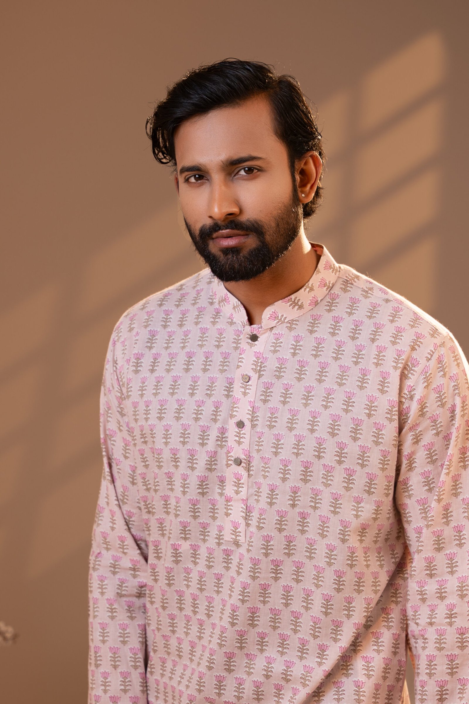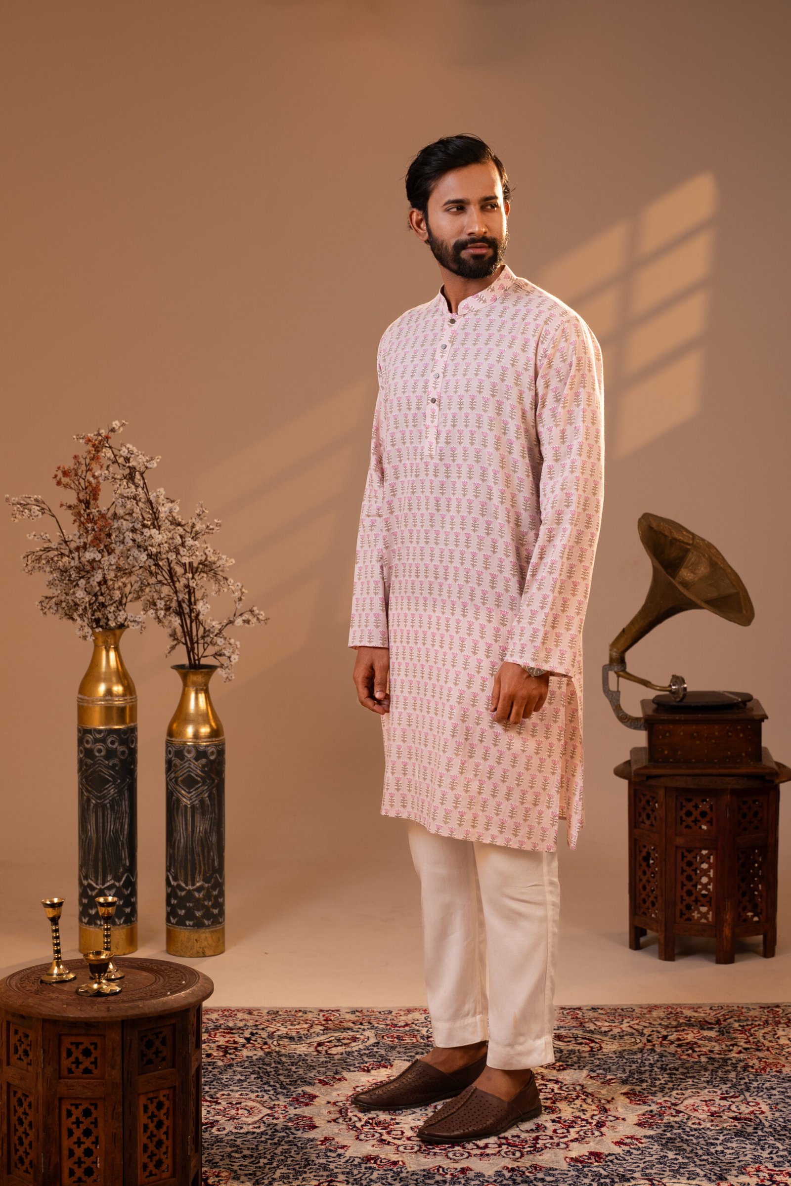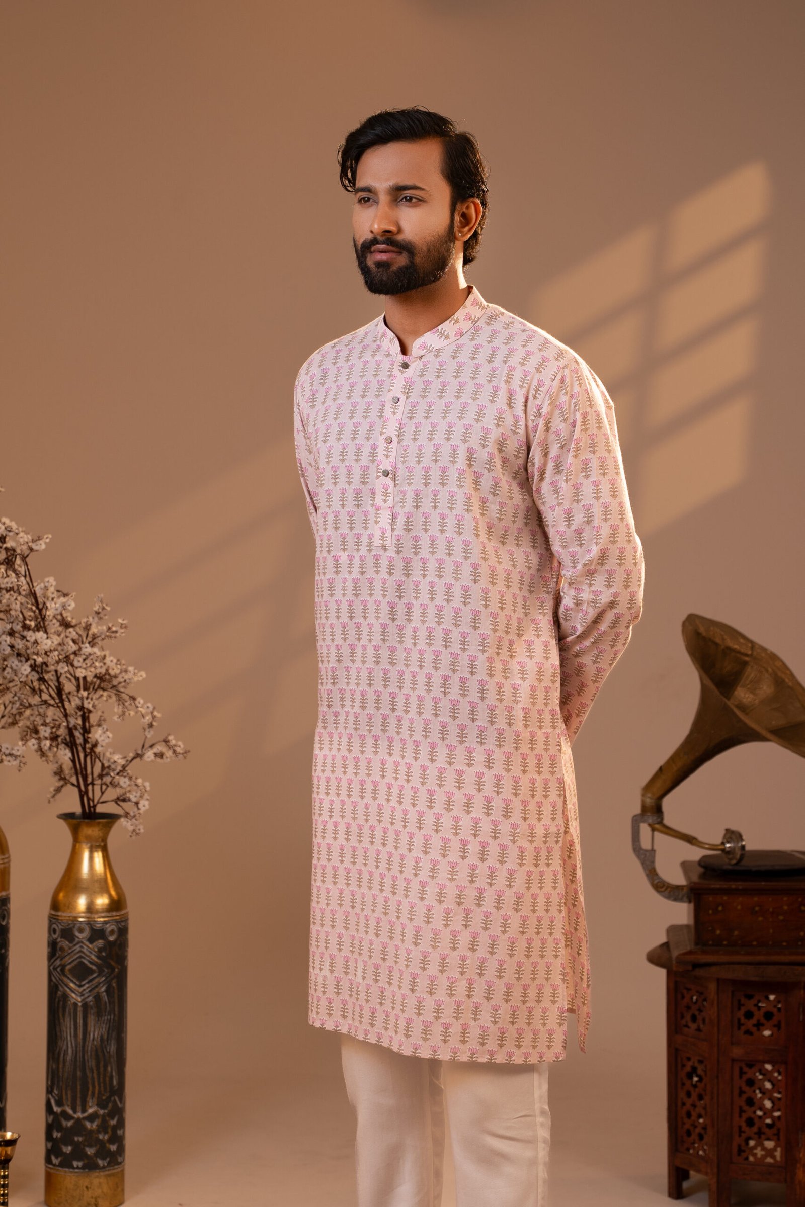 The clean mandarin collar and minimal front placket maintain simplicity allowing the intricate print to take center stage. Crafted from lightweight breathable fabric this Panjabi ensures comfort during long festive gatherings and outdoor celebrations.
