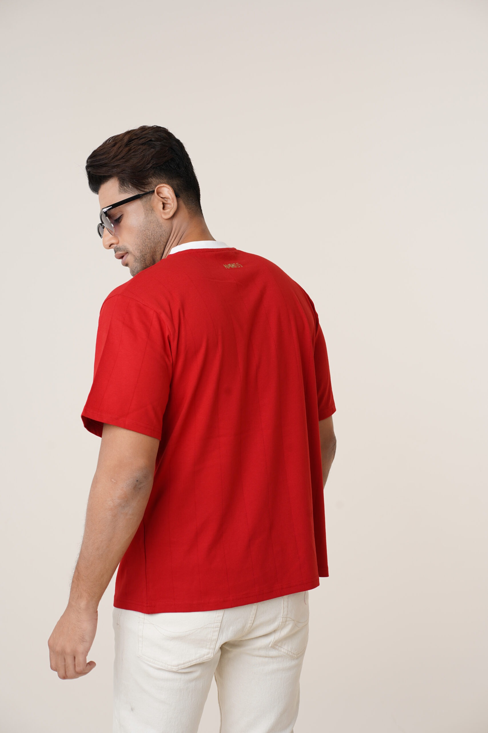 The bold red tone is complemented by a clean white crew neckline for a modern, sporty contrast. Finished with the iconic AMRISS emblem on the chest, this T-shirt reflects premium craftsmanship and refined simplicity.