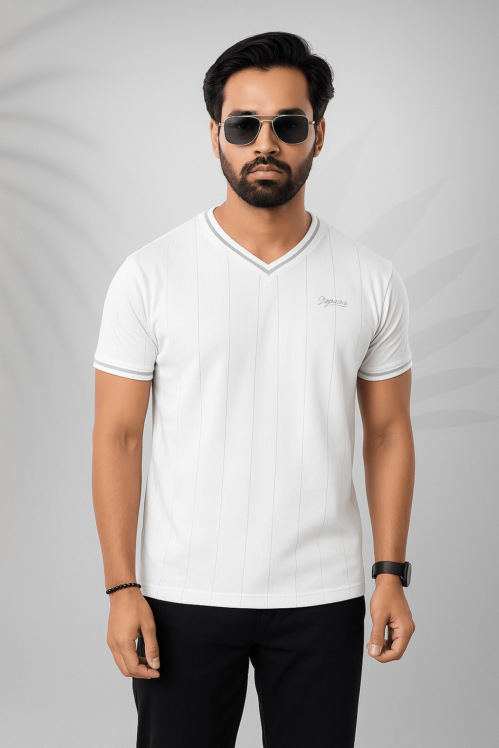 Elevate your casual look with this premium drop needle V-neck T-shirt. Crafted from soft, breathable cotton-blend fabric, it features a subtle vertical texture that adds depth and sophistication to your everyday style. The finely ribbed neckline and sleeve edges come with a contrasting trim for a refined touch.