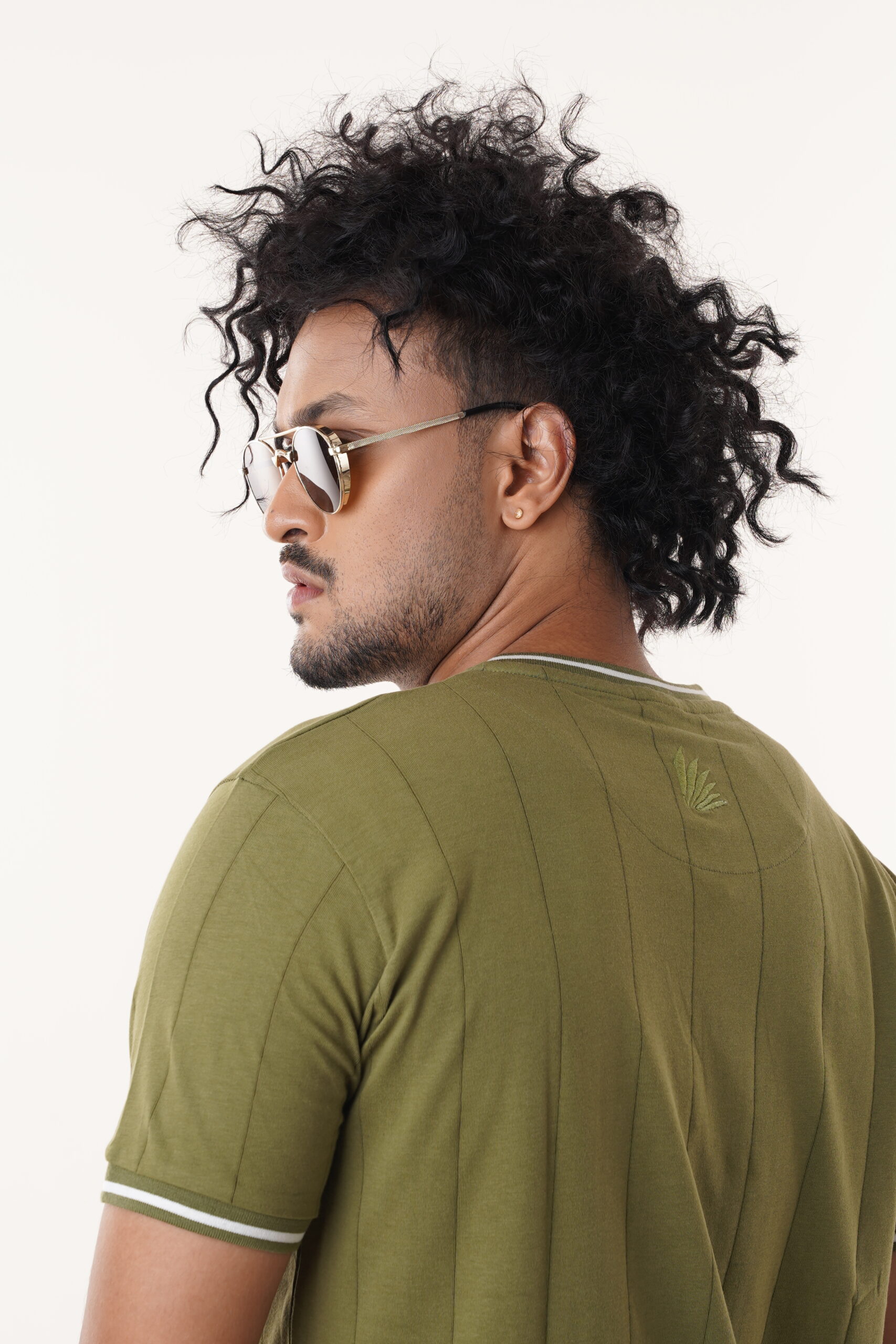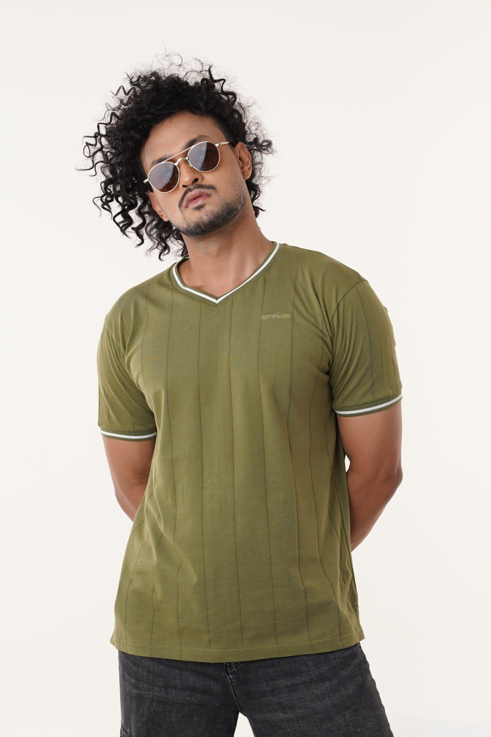 Relaxed Fit V-neck New Design Amriss Signature Drop Needle Olive T-Shirt for Men