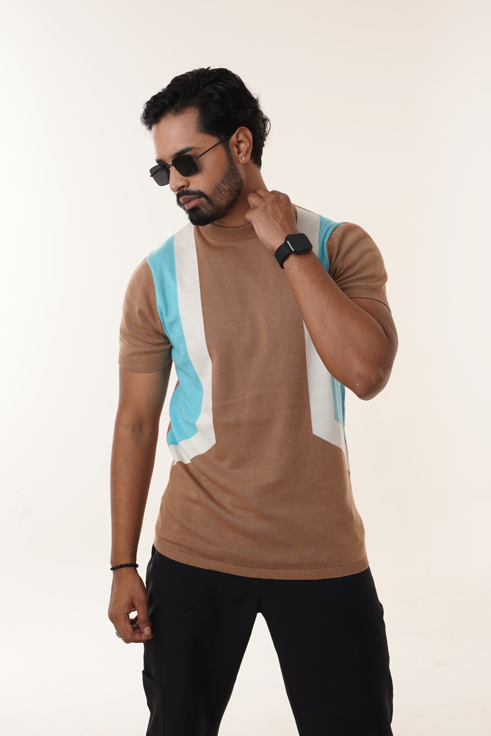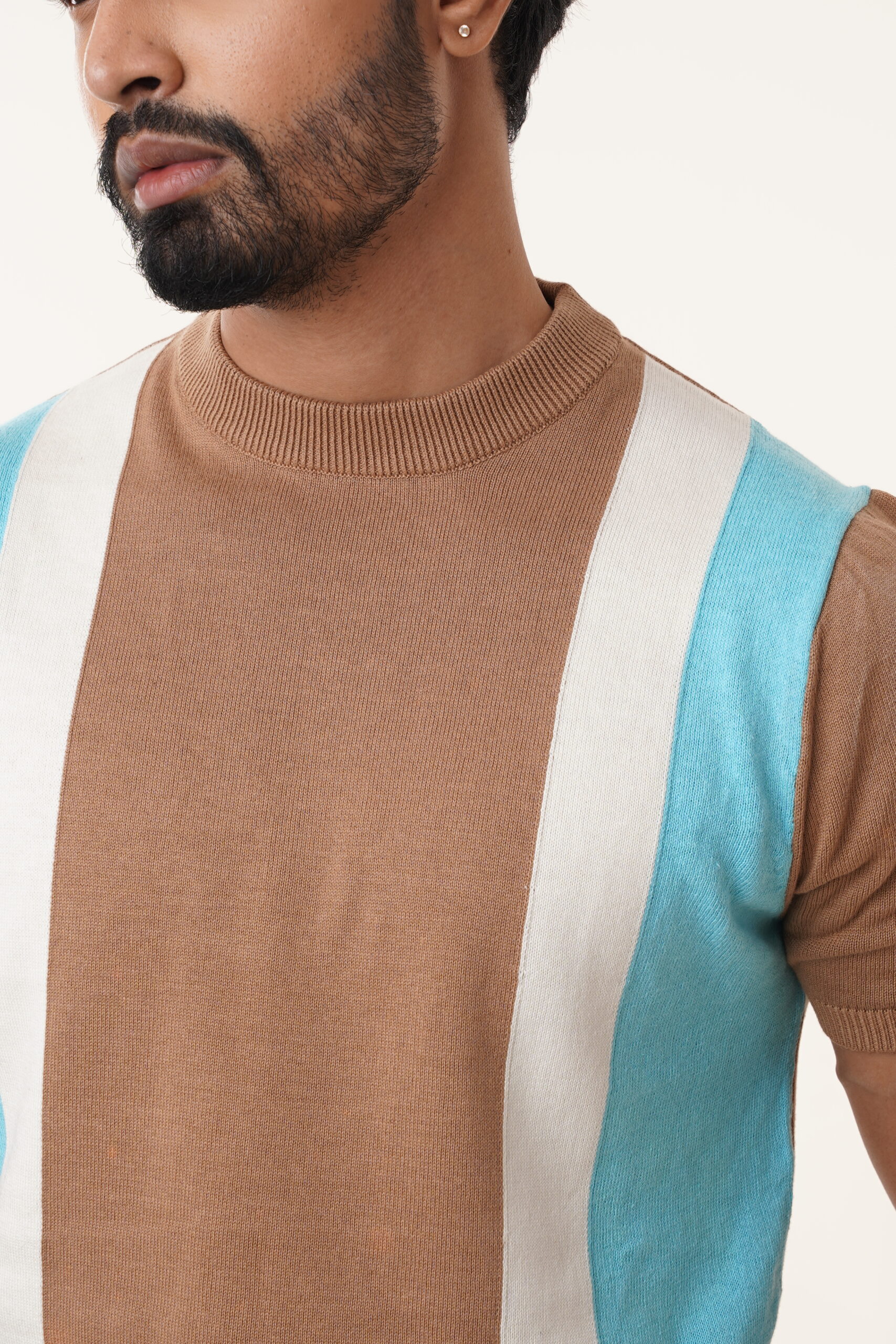 Signature Men’s T-shirt Stretchable Texture Sky Blue & White Vertical Panels Short Sleeve Knitwear Tees