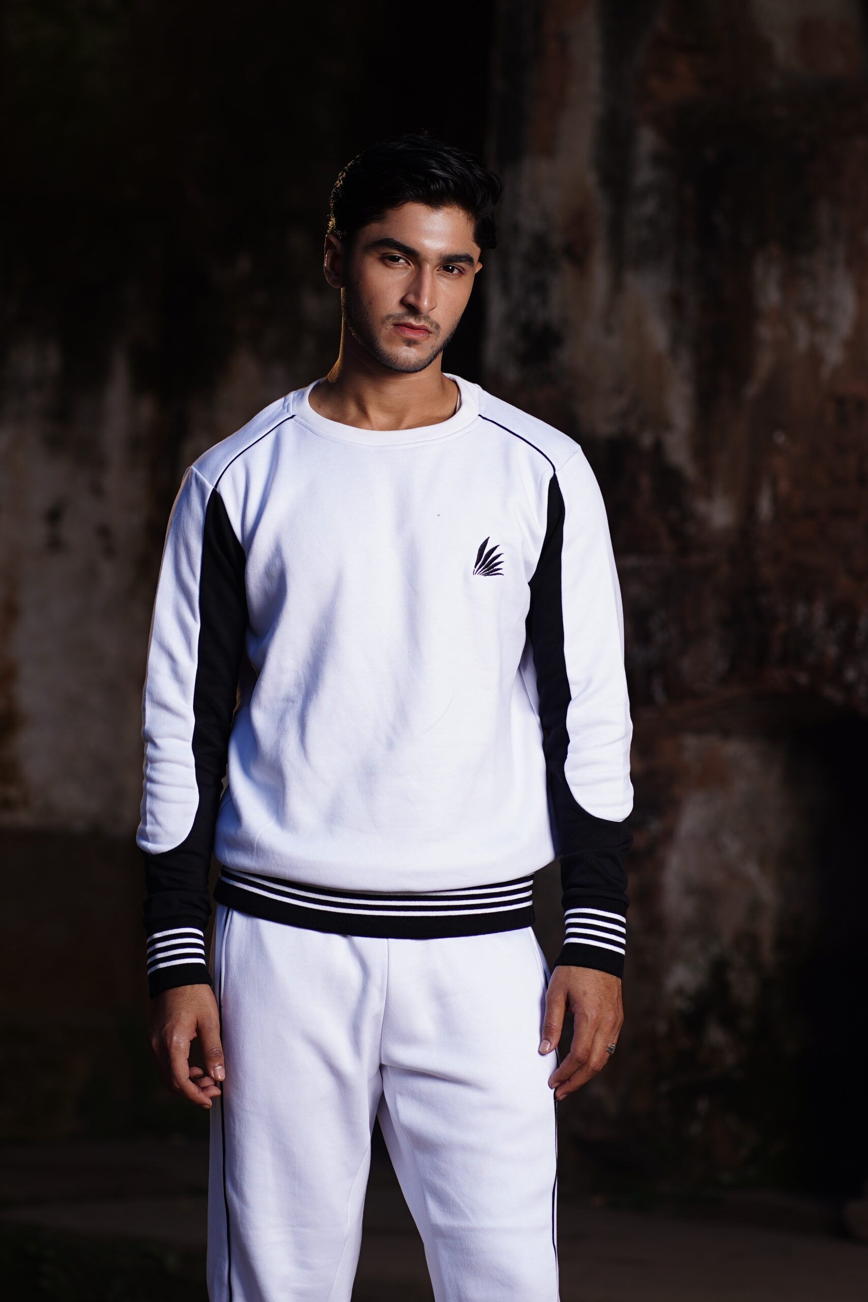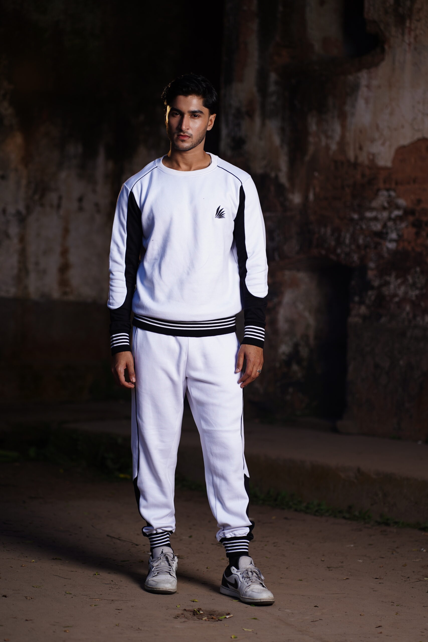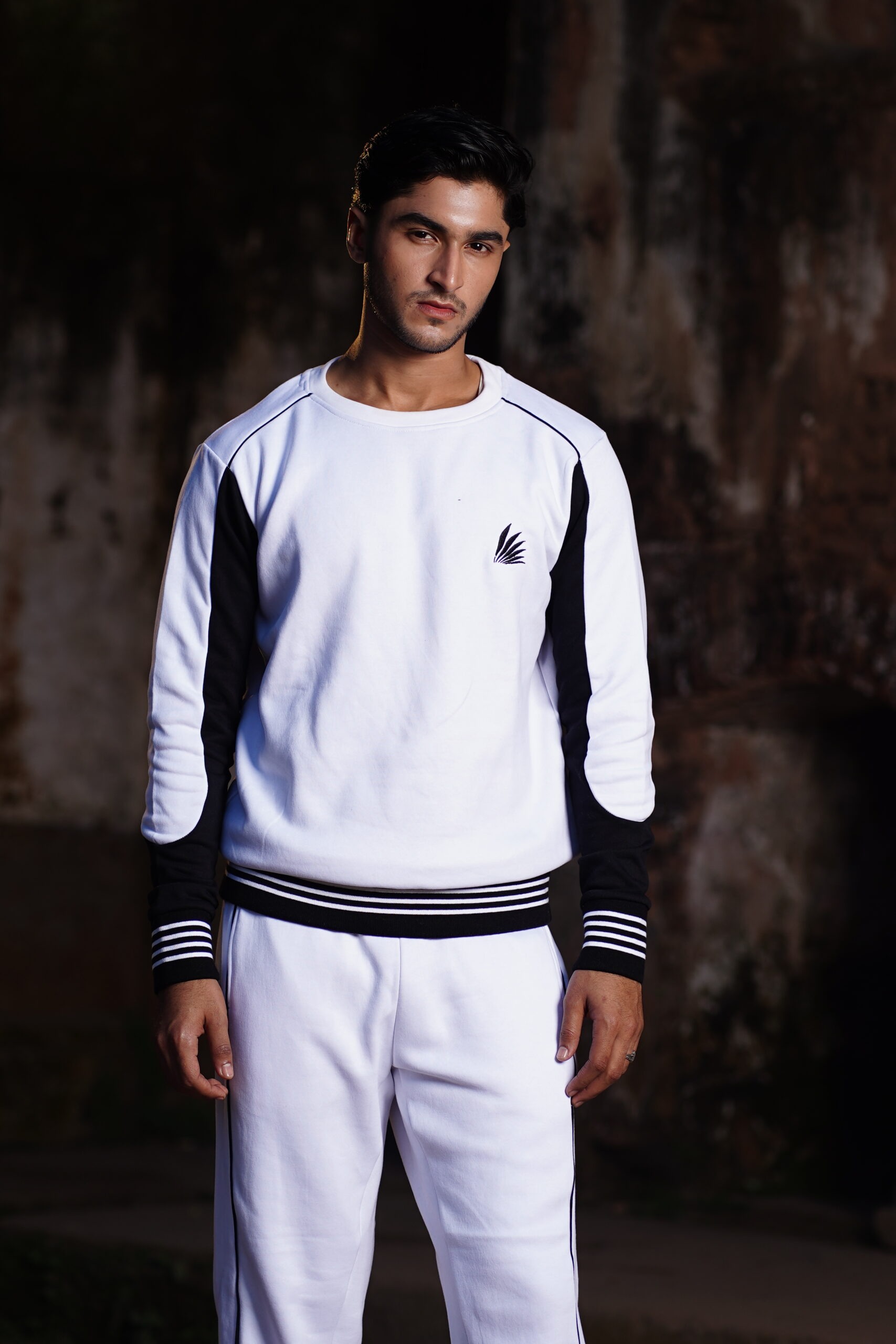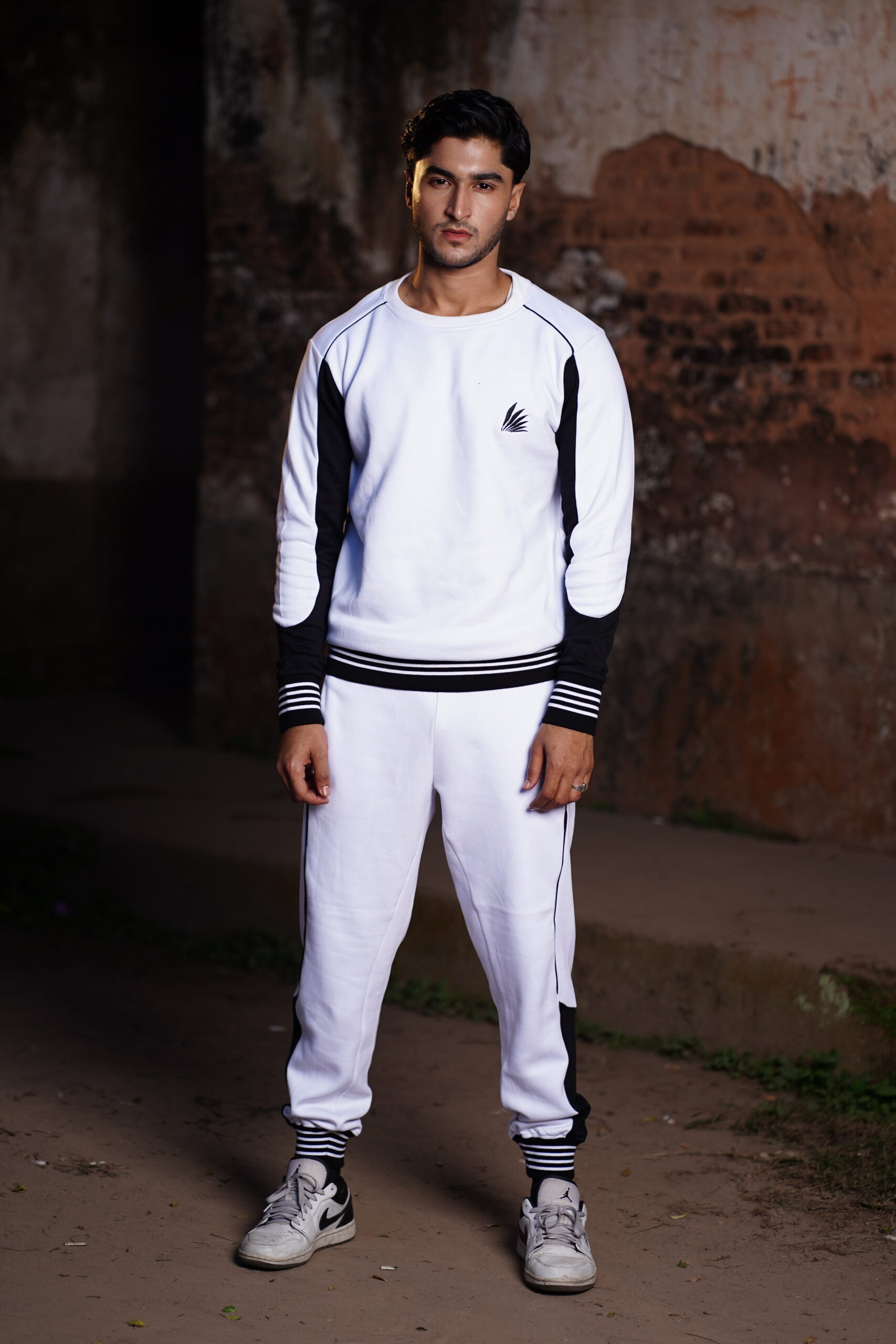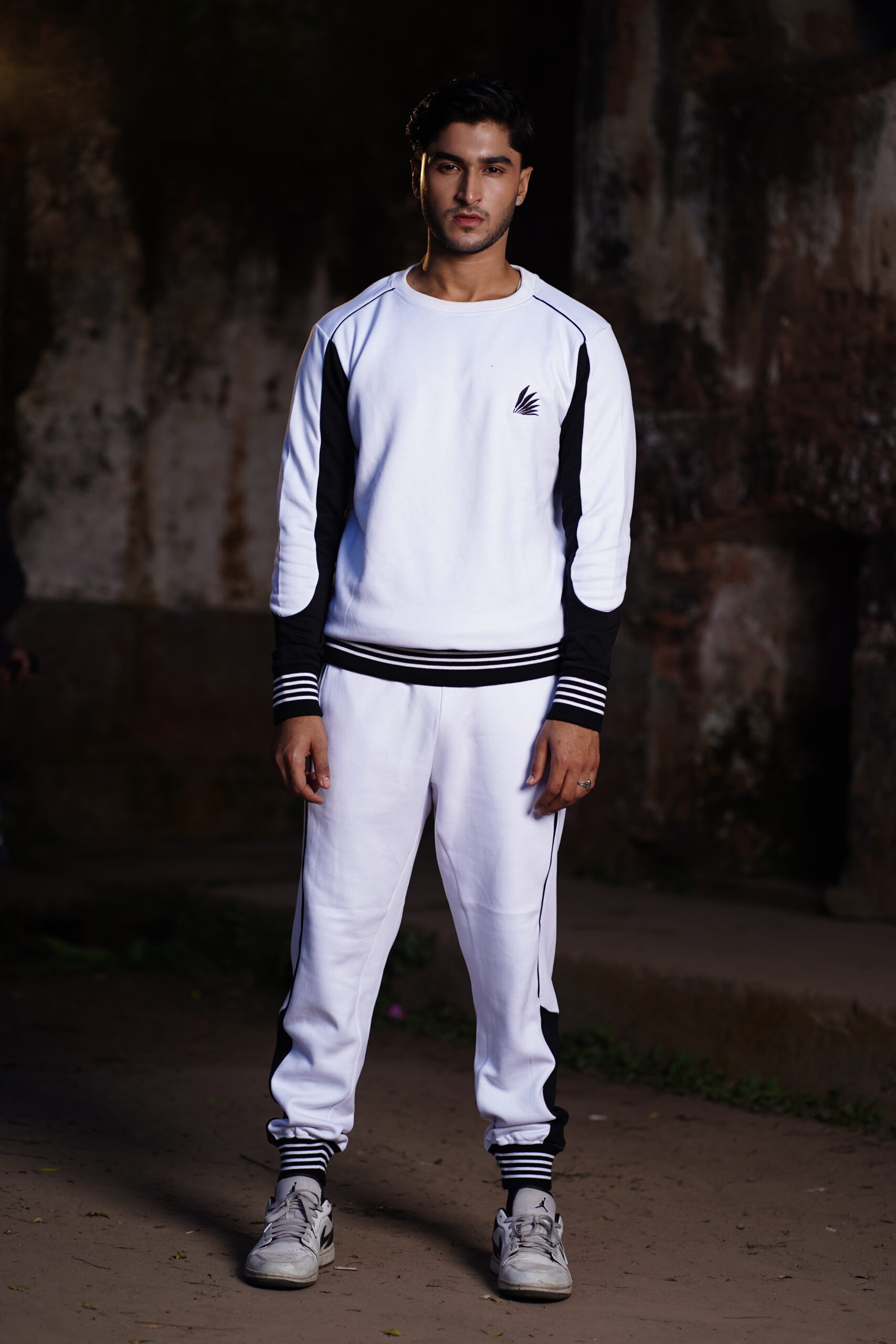 Amriss Activewear Men’s White & Black Color Block Premium Fleece Sweatshirt & Jogger Set