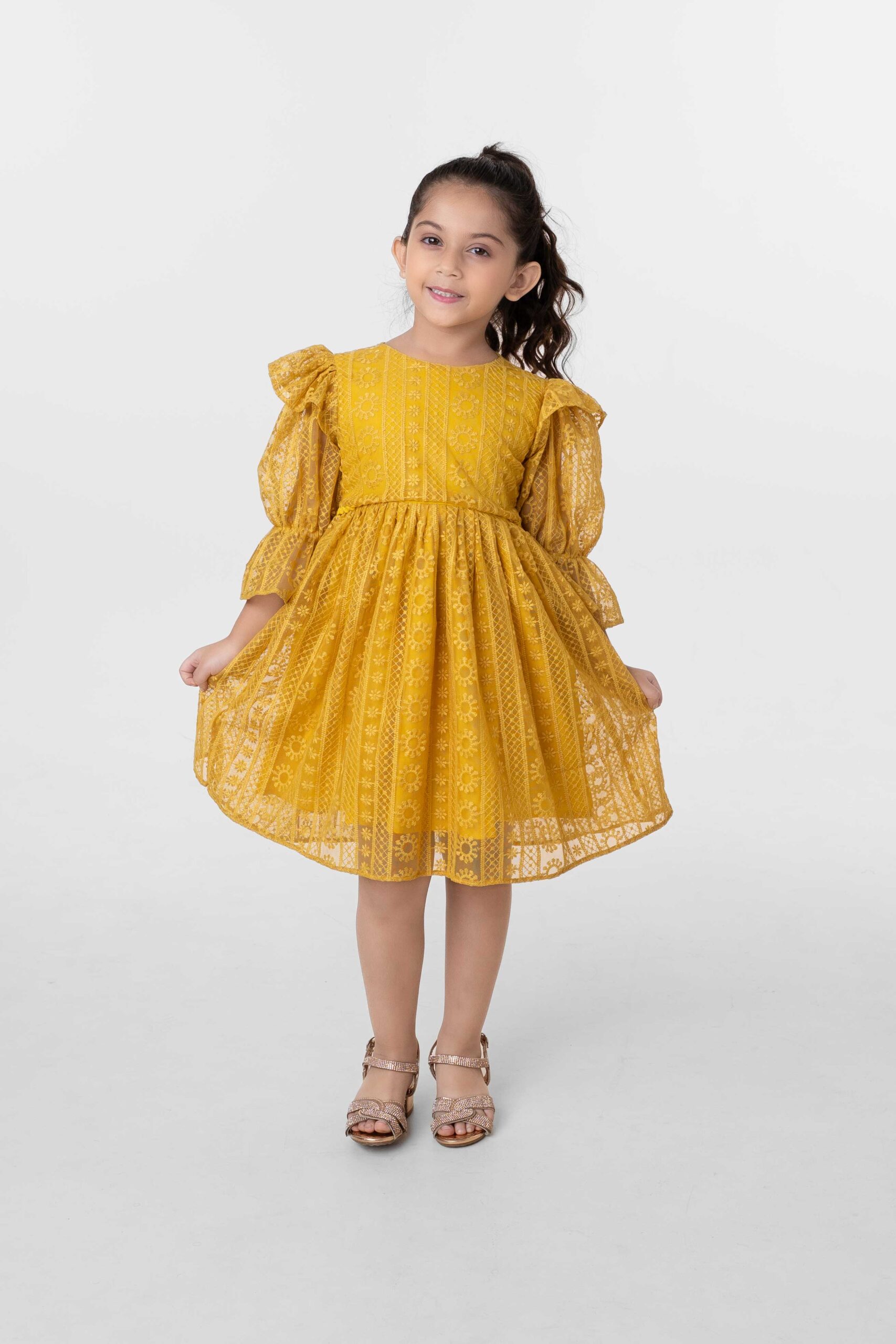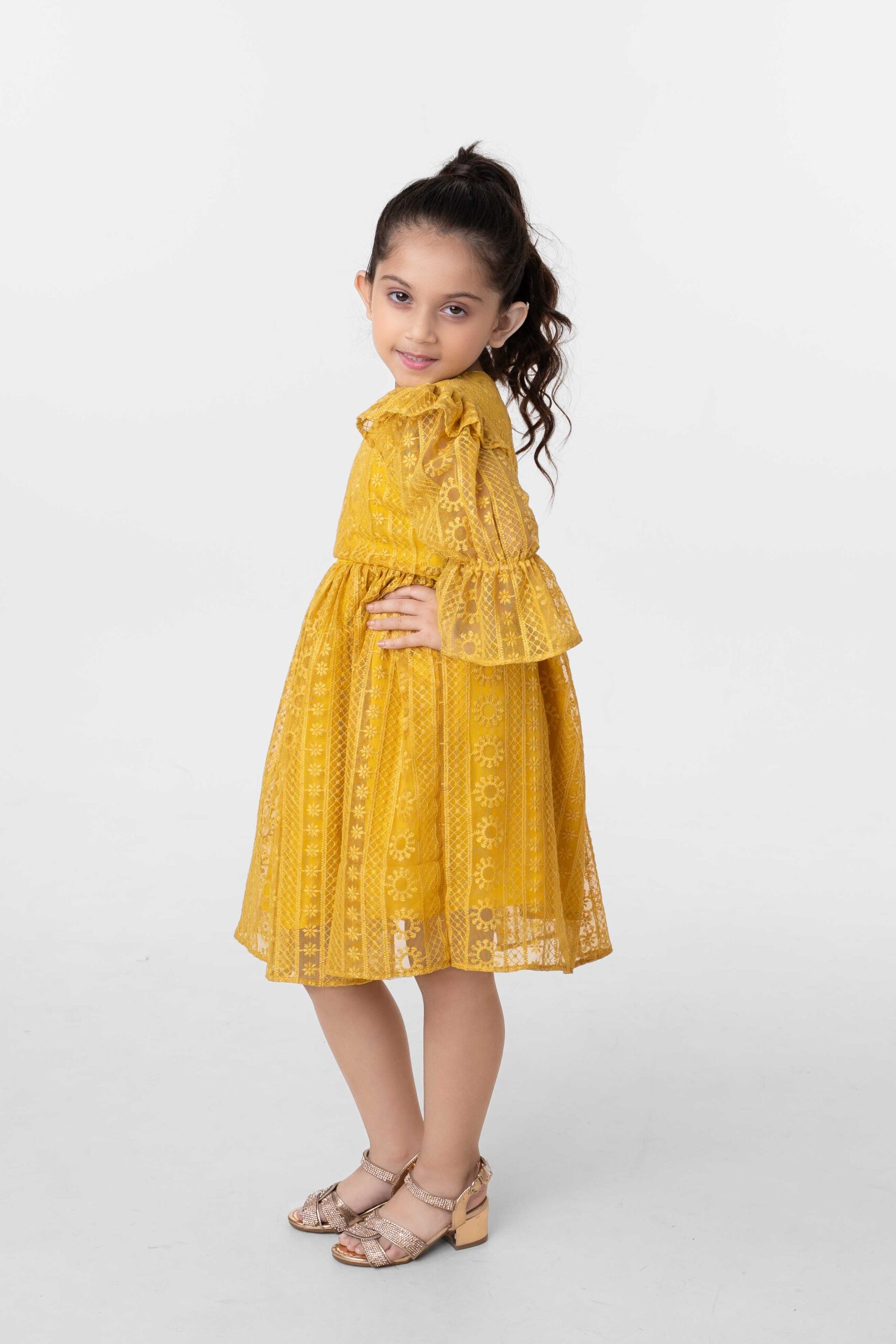 Premium Embroidered Lace with Soft Inner Lining Floral Lace Pattern Amriss Girls Yellow Frock