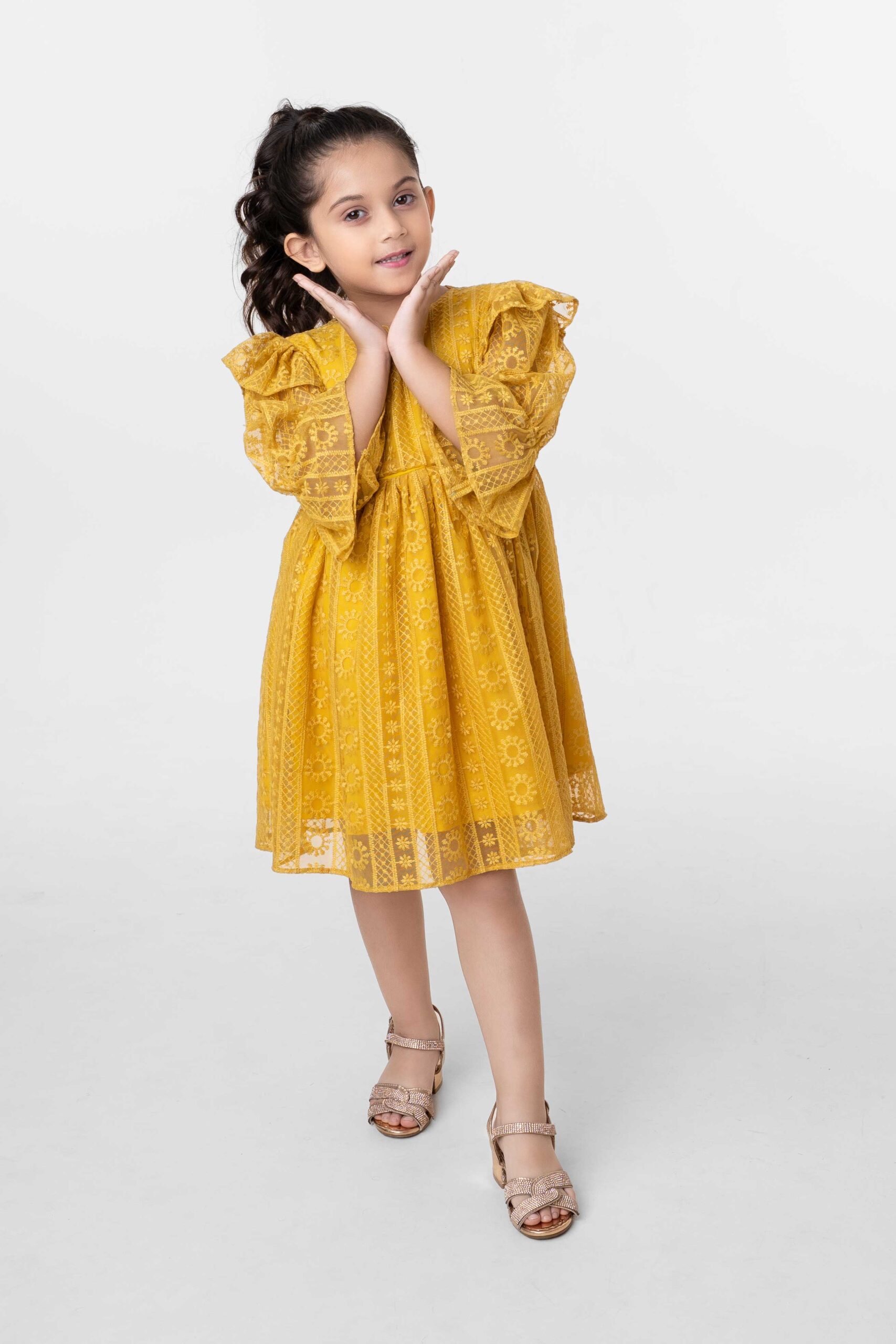 The Amriss Kids Yellow Lace Frock features detailed floral lace, soft flowy movement and a bright playful tone that makes every little girl feel confident and beautiful.