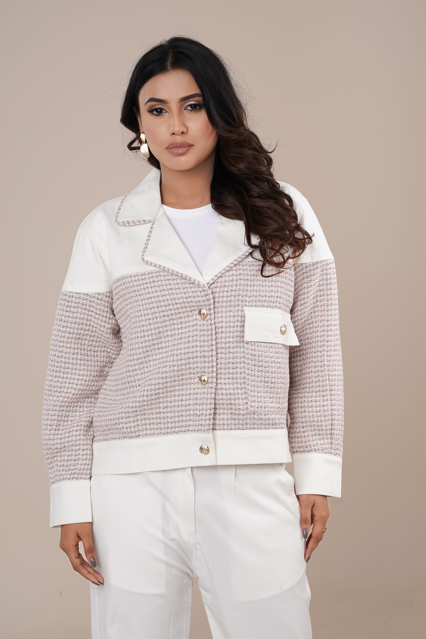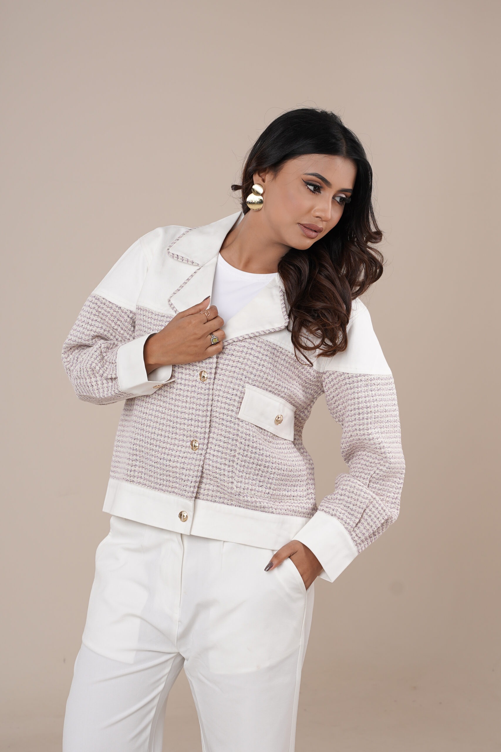 Step into effortless elegance with the Amriss Premium Tweed Jacket Set, a beautifully crafted co-ord designed for women who love refined, modern luxury. Featuring a soft blush-beige tweed texture paired with crisp white detailing, this jacket set blends sophistication with everyday comfort. The premium gold-tone buttons, structured pockets, and contrast collar add a polished designer finish that instantly elevates your style.