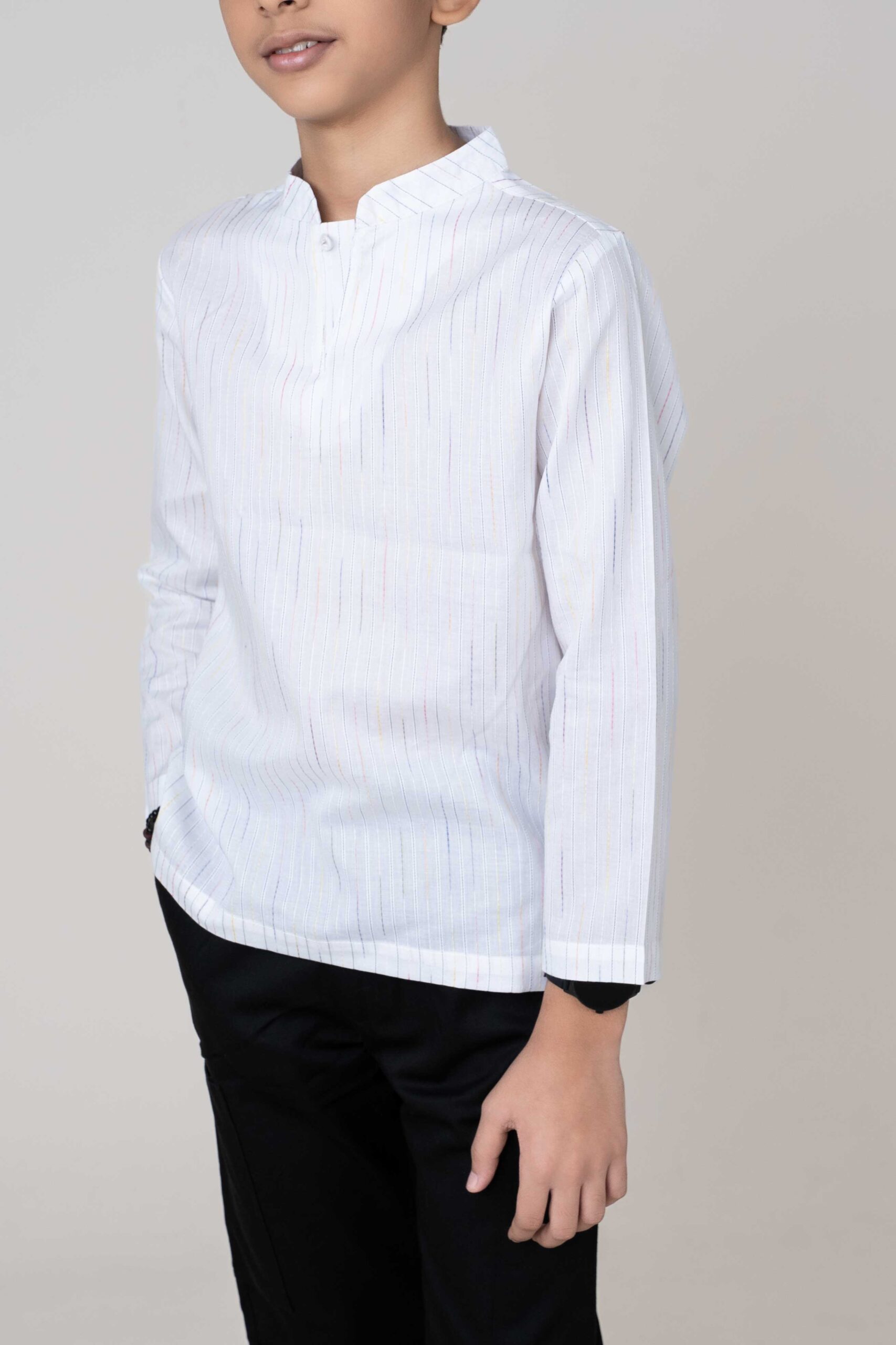 This Boys White Cotton Fotua is designed for comfort, style and everyday elegance. Crafted from a breathable cotton blend with soft multicolor woven stripes, it offers a fresh, polished look that works for festivals, family gatherings, school events and casual days out. The mandarin collar and long sleeves give it a traditional touch while the lightweight fabric keeps kids comfortable through the day. A simple, stylish and versatile fotua perfect for every occasion.