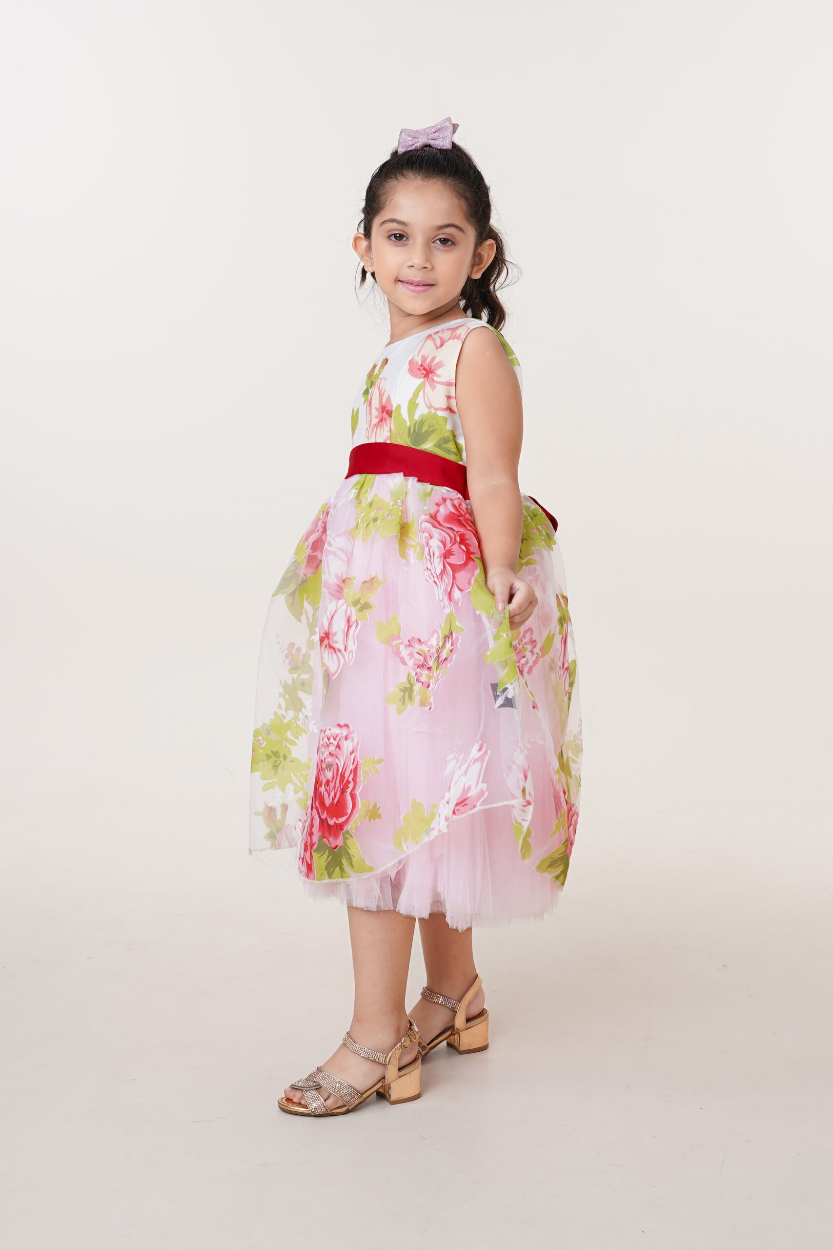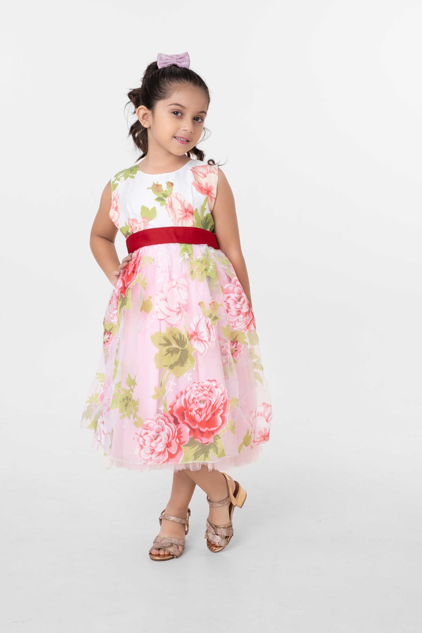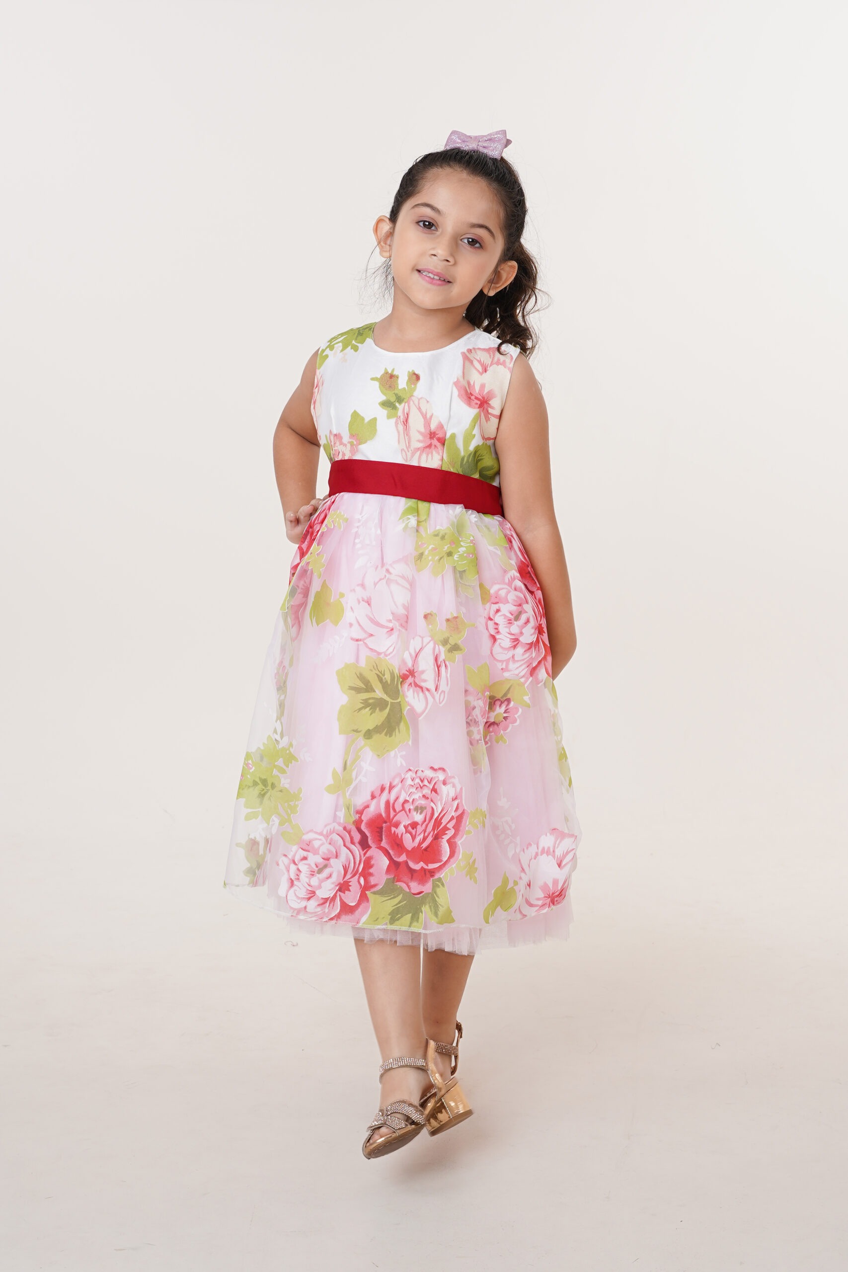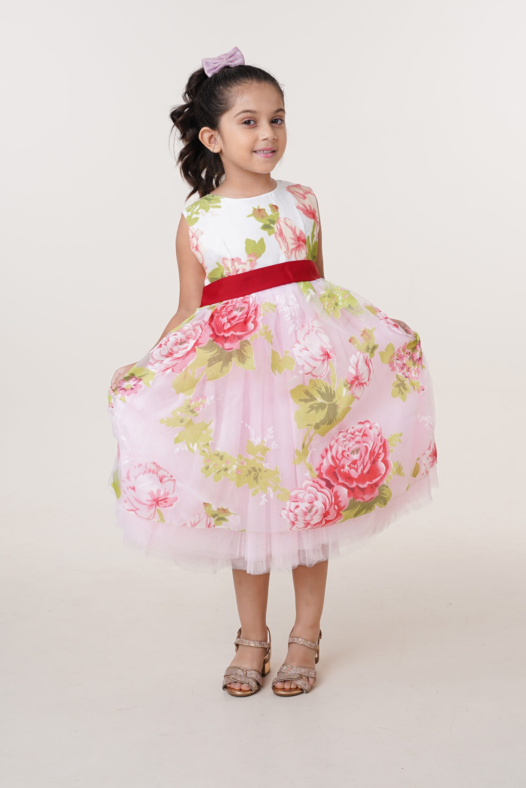 Amriss Kids Elegant Pink Flower Print Birthday & Special Occasion Gown Girl’s Floral Party Frock