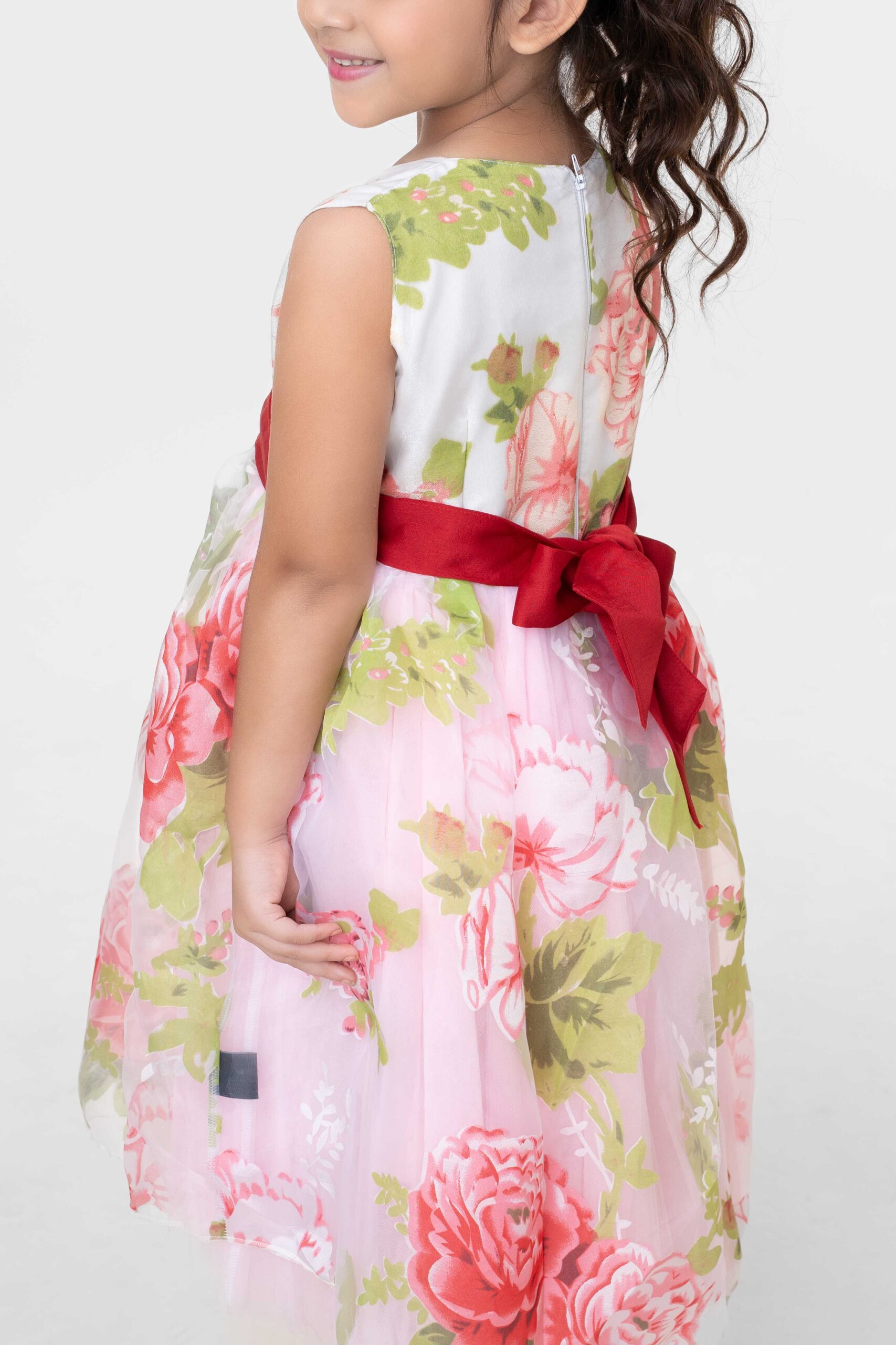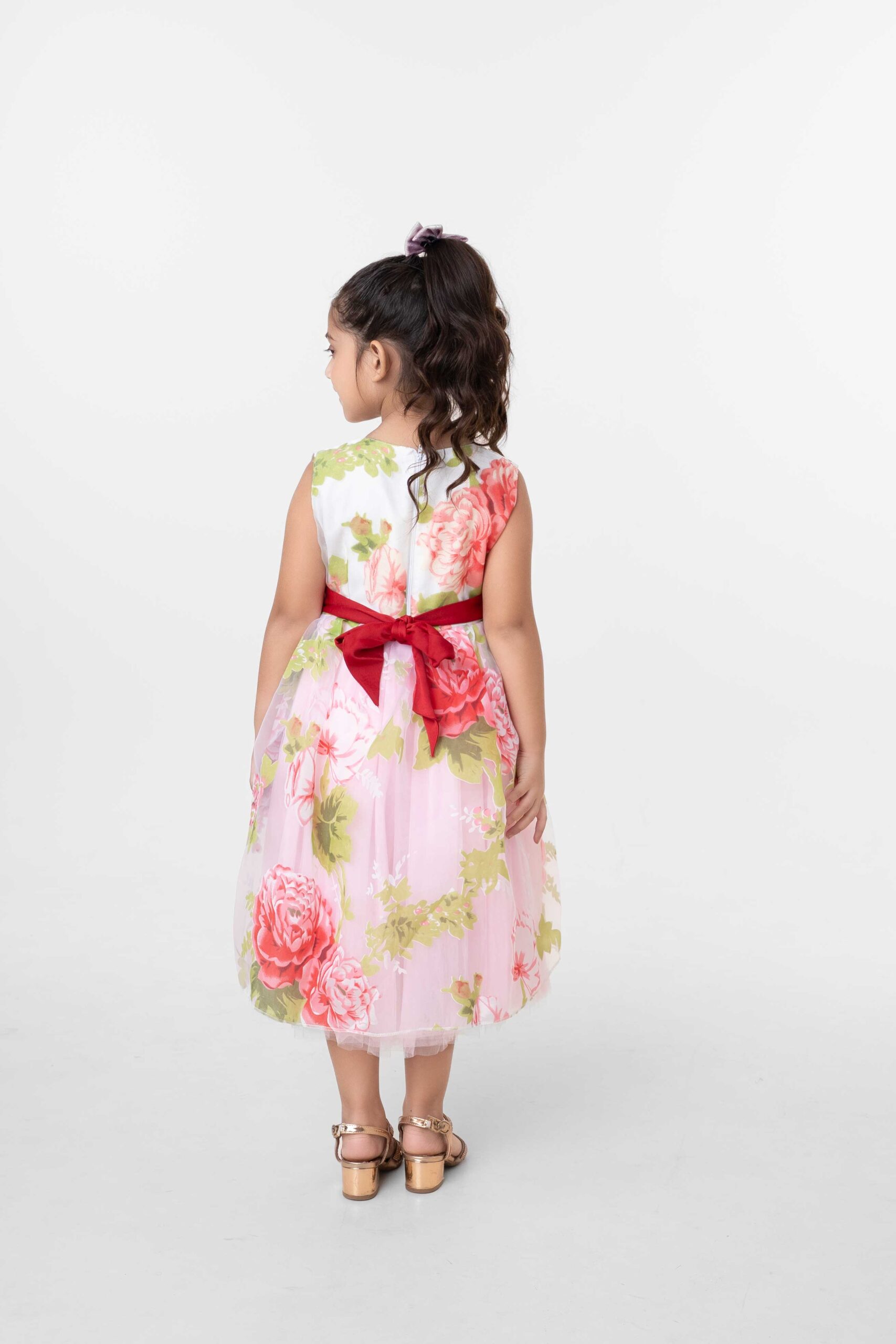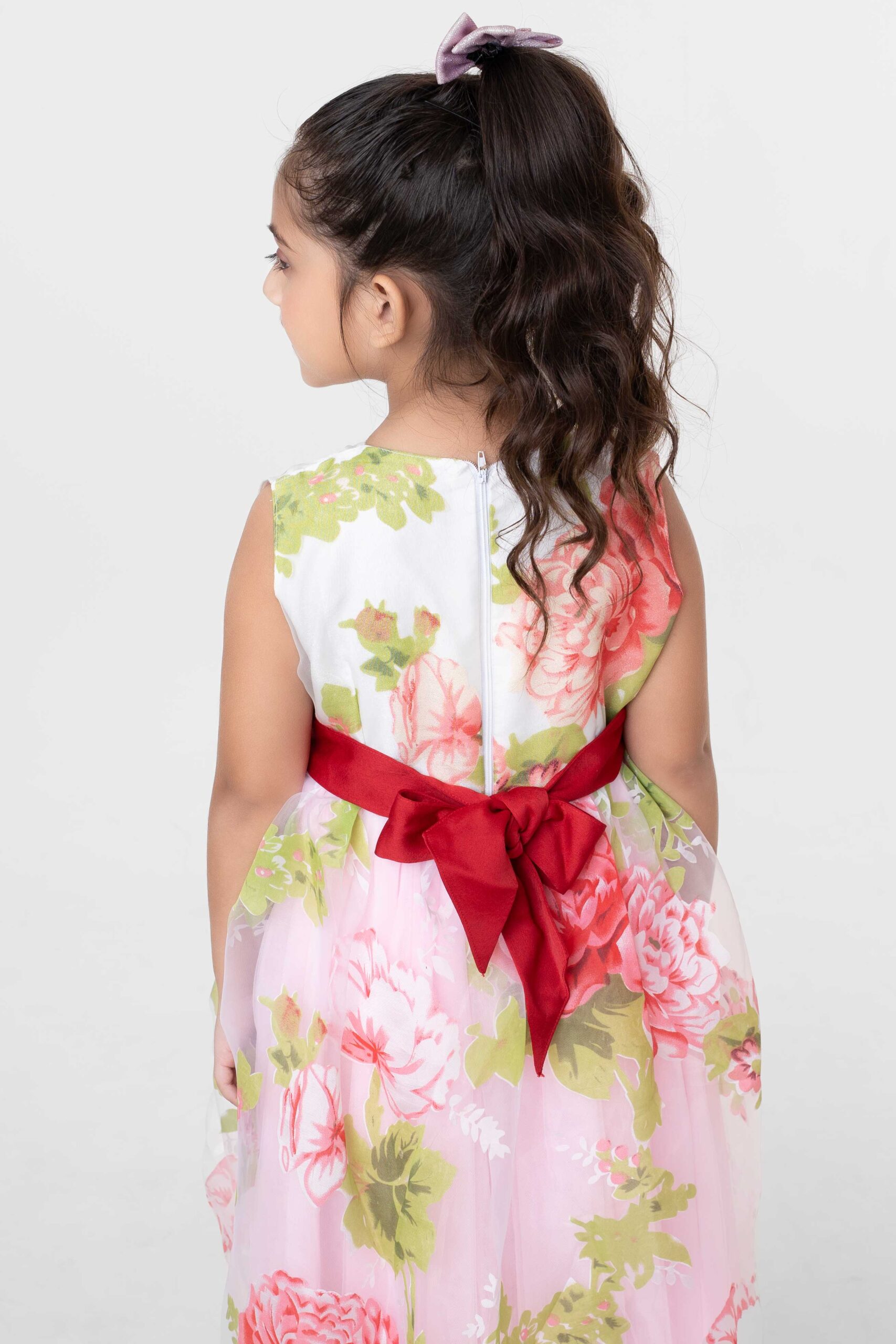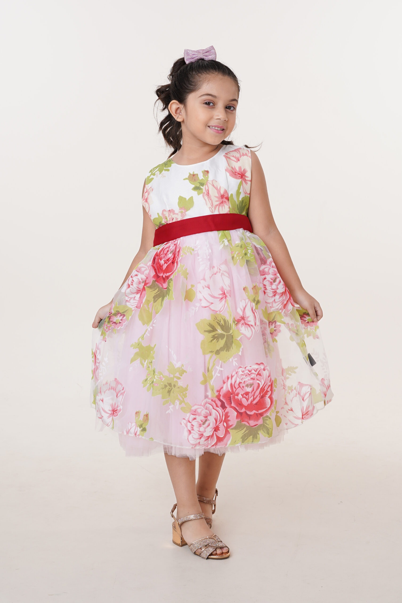Amriss Kids Elegant Pink Flower Print Birthday & Special Occasion Gown Girl’s Floral Party Frock