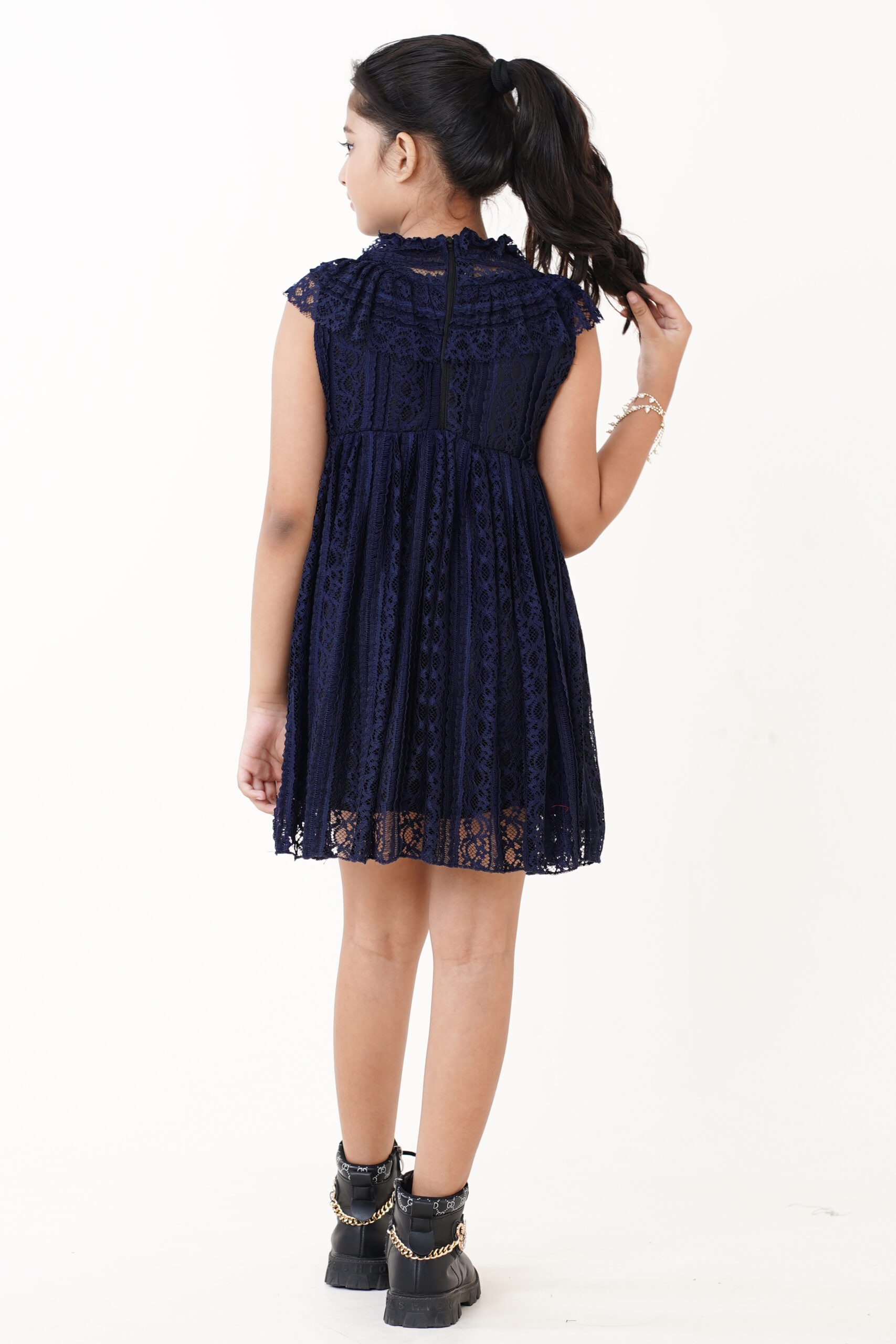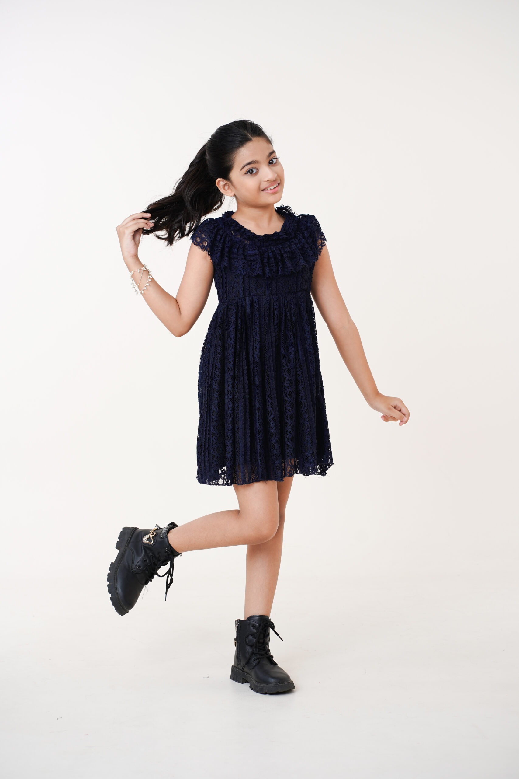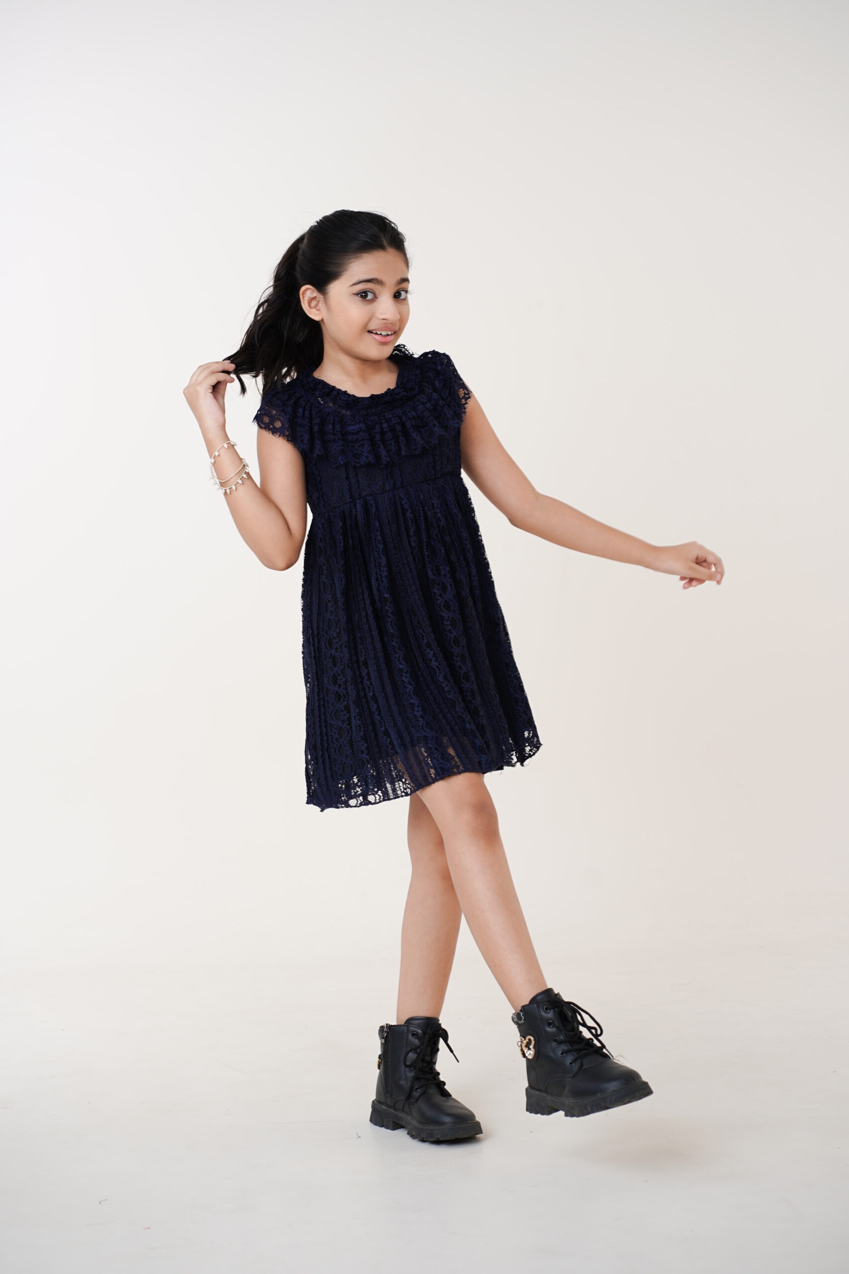 “Girls Navy Blue Lace Party Frock” – A refined blend of texture and elegance. The rich lace fabric adds timeless charm, while the flared cut gives the dress a playful, youthful movement. Designed to make every girl feel special and confident.