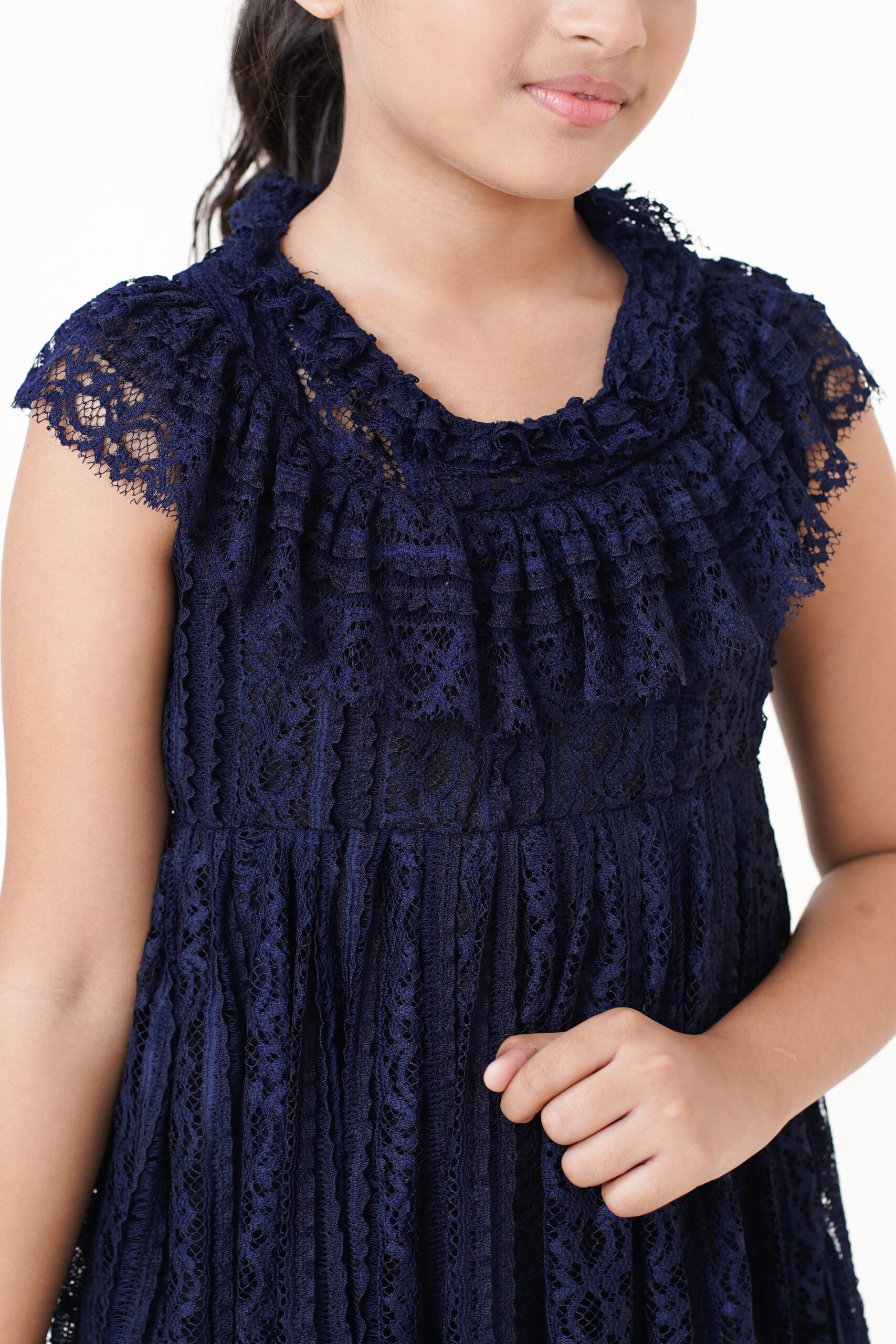 AMRISS Kids Fashion Wear Girl’s Navy Blue Lace Party Frock Elegant Floral Net Birthday & Special Occasion Outfit Dress