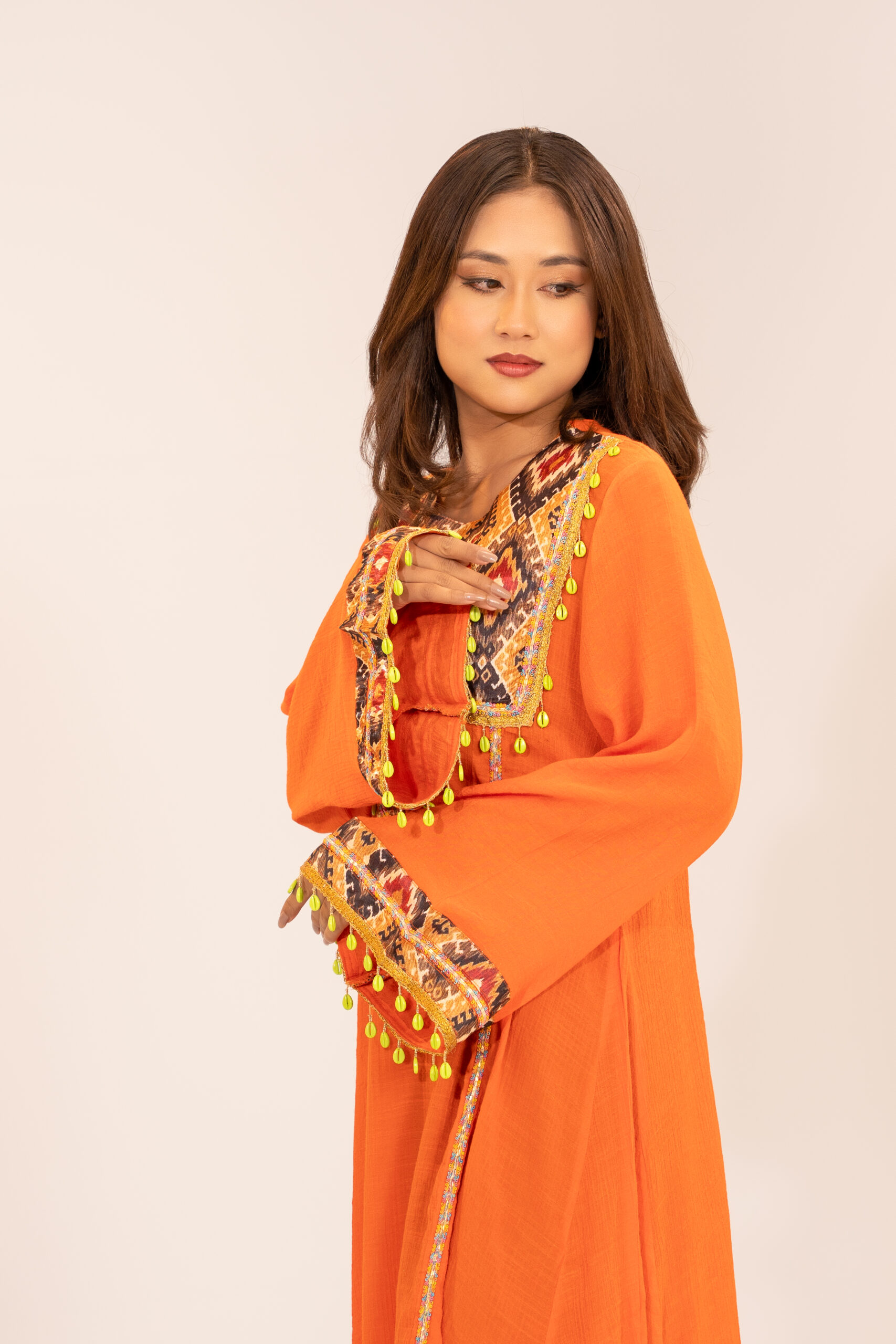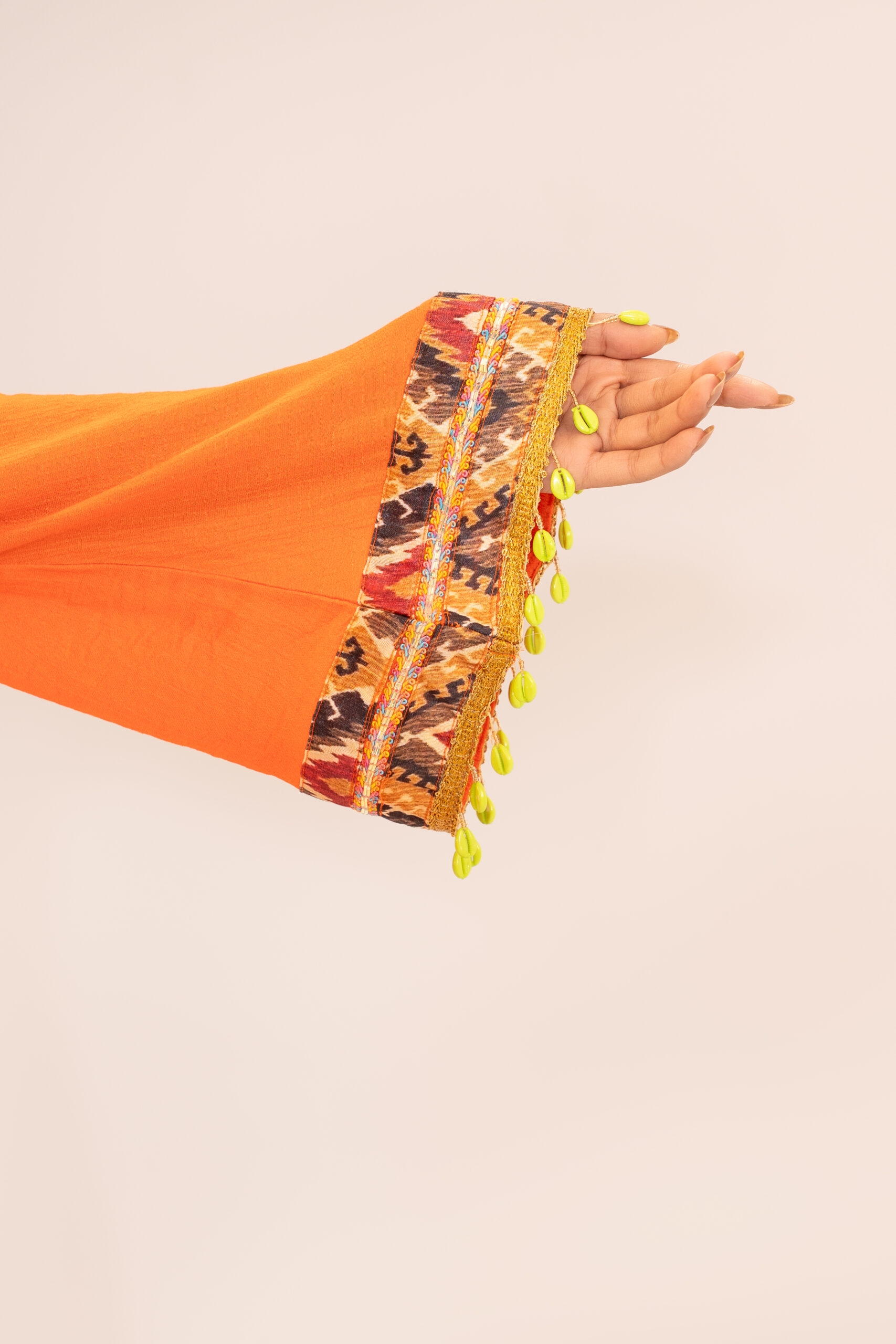 Elevate your festive wardrobe with the Women’s Exclusive Design Orange Tunic Style Long Kameez with Embroidered Details and Kari Work. This stunning piece blends vibrant color, premium craftsmanship, and rich traditional artistry to create a look that feels luxurious yet effortless. The elegant embroidered neckline, intricate Kari work, and unique sleeve embellishments come together to offer a statement outfit perfect for festivals, celebrations, and family gatherings.
