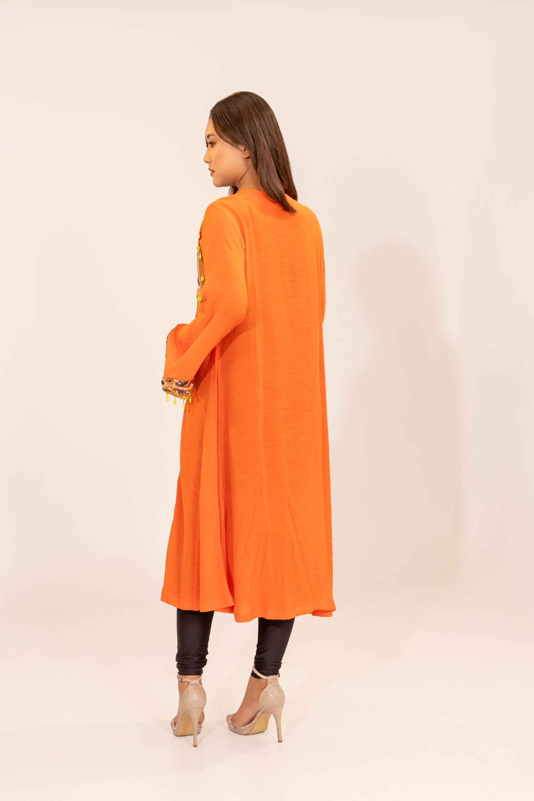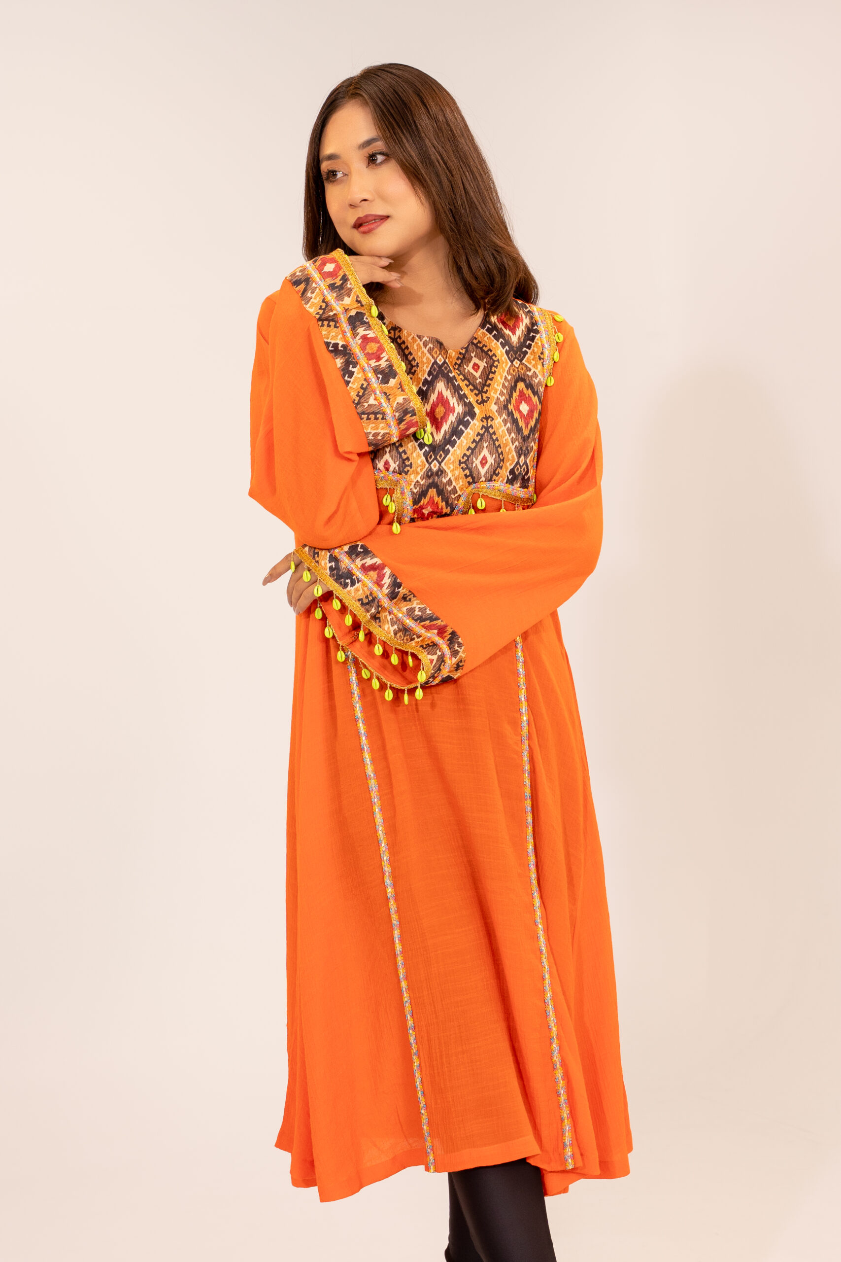 Women’s Exclusive Design Orange Tunic Style Long Kameez with Embroidered Details and Kari Work