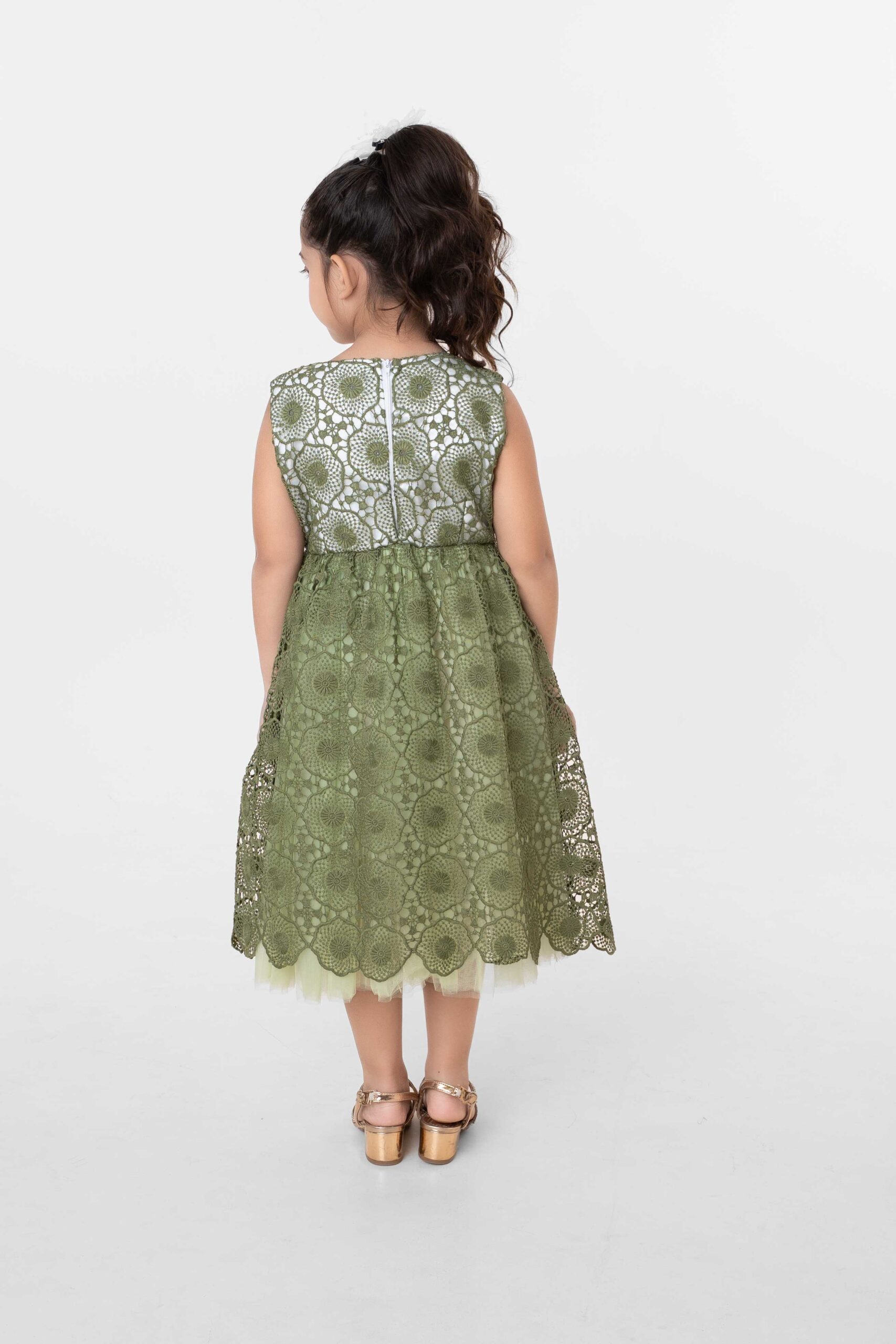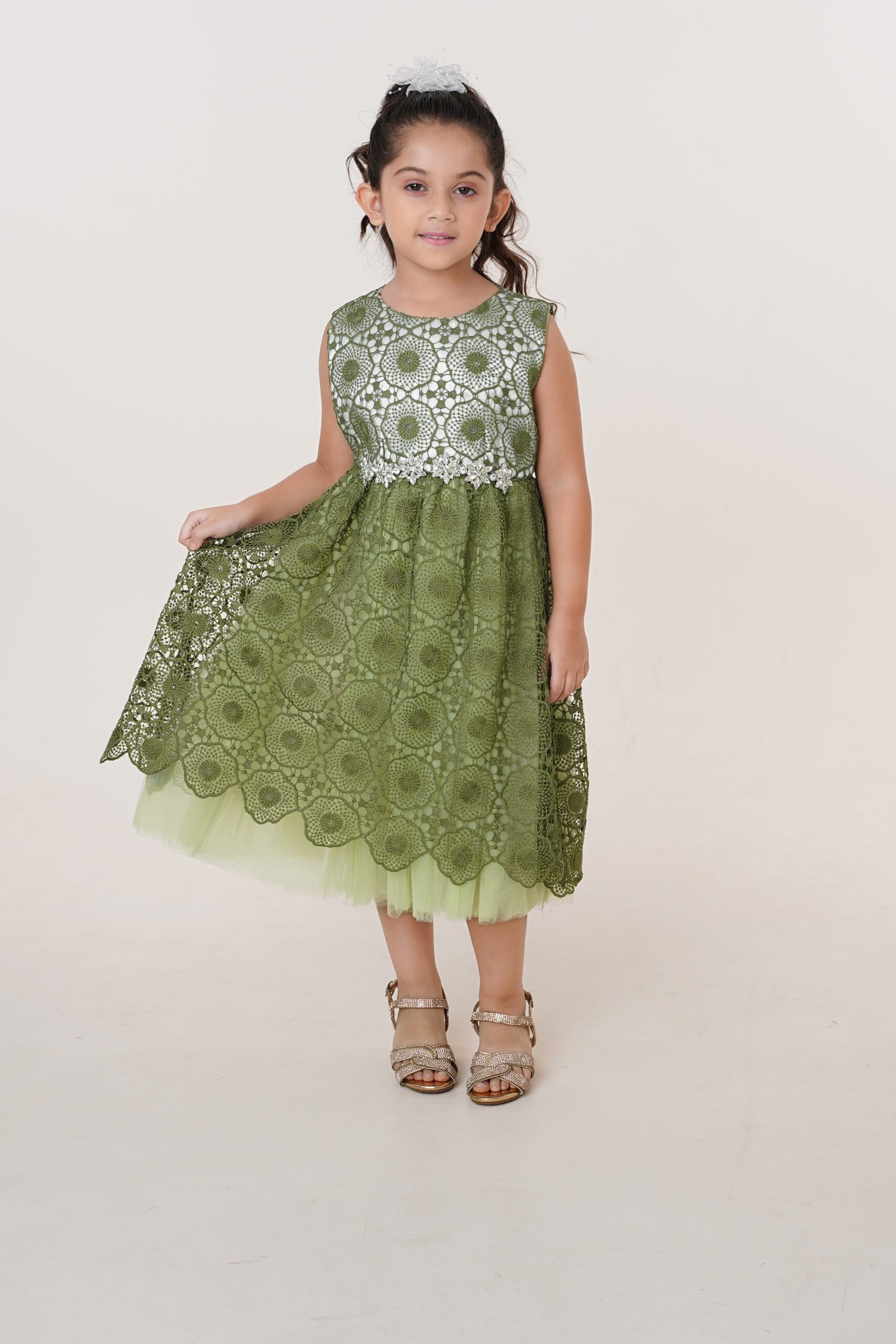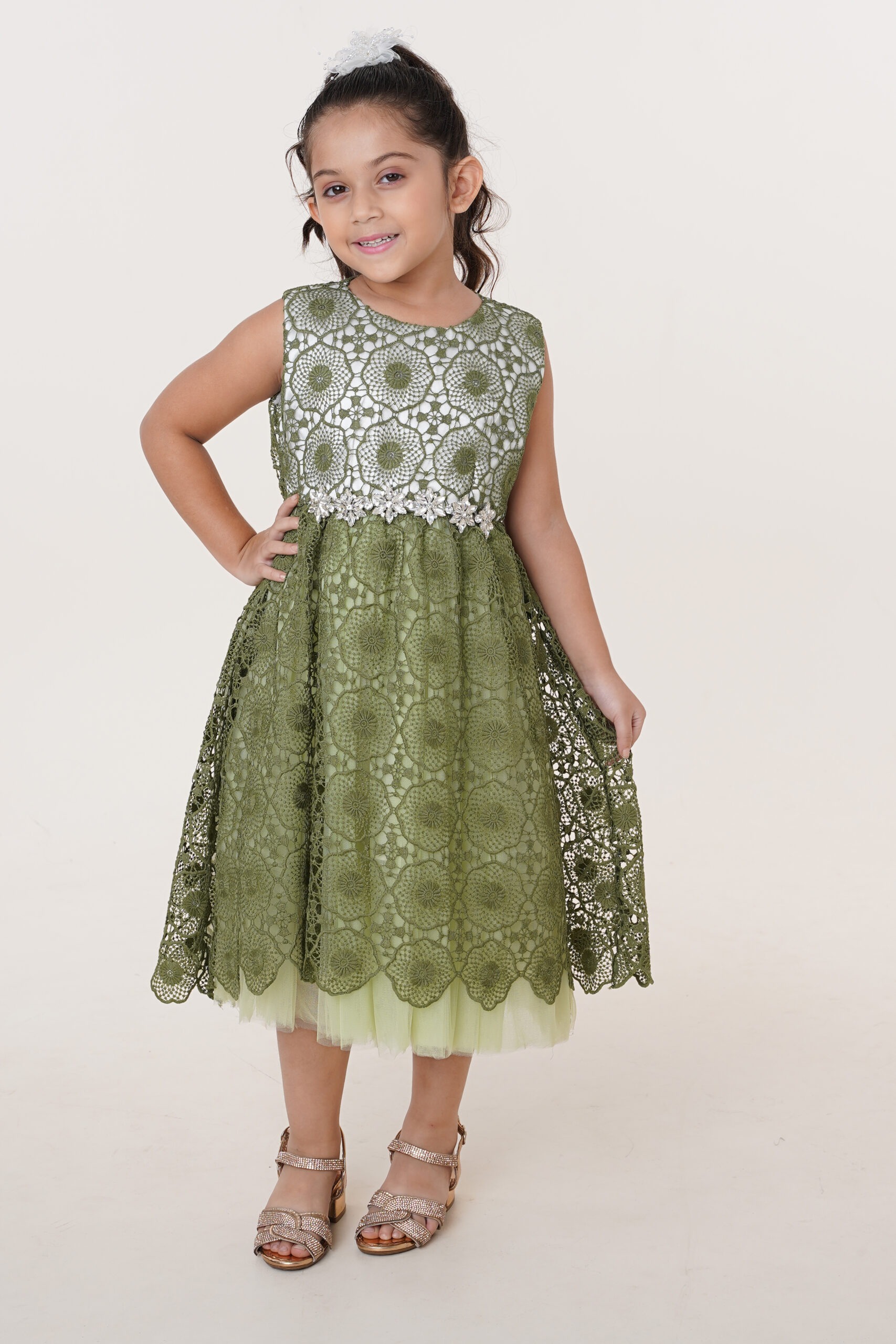 Amriss Premium Olive Green Lace Party Frock for Girls Elegant Floral Lace Kids Birthday Gift Dress