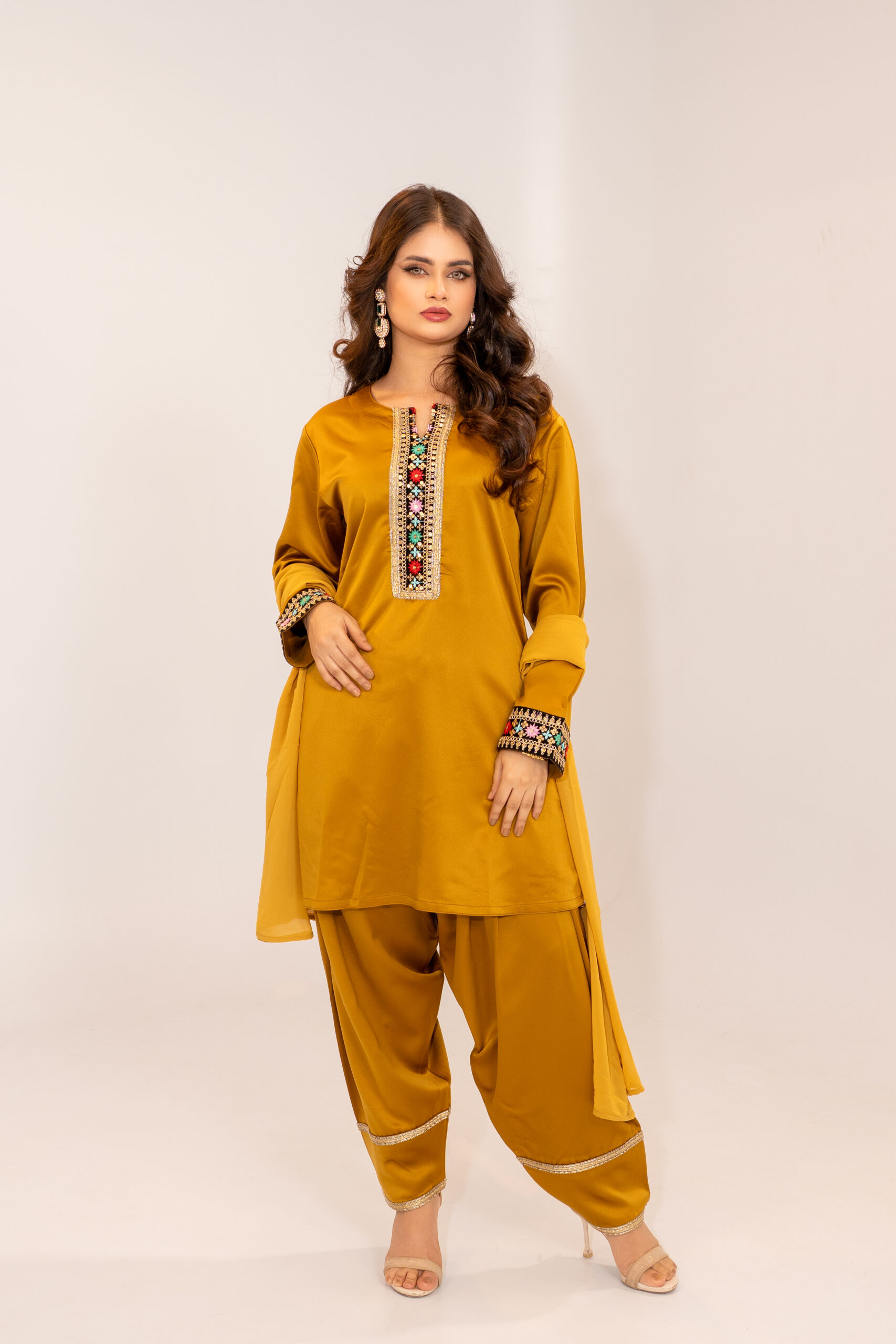 The mustard-colored kameez features vibrant multicolor embroidery along the neckline and cuffs, adding a rich ethnic charm. Paired with matching dhoti-style pants for ease and elegance, and a lightweight chiffon dupatta that completes the regal look with effortless flow.