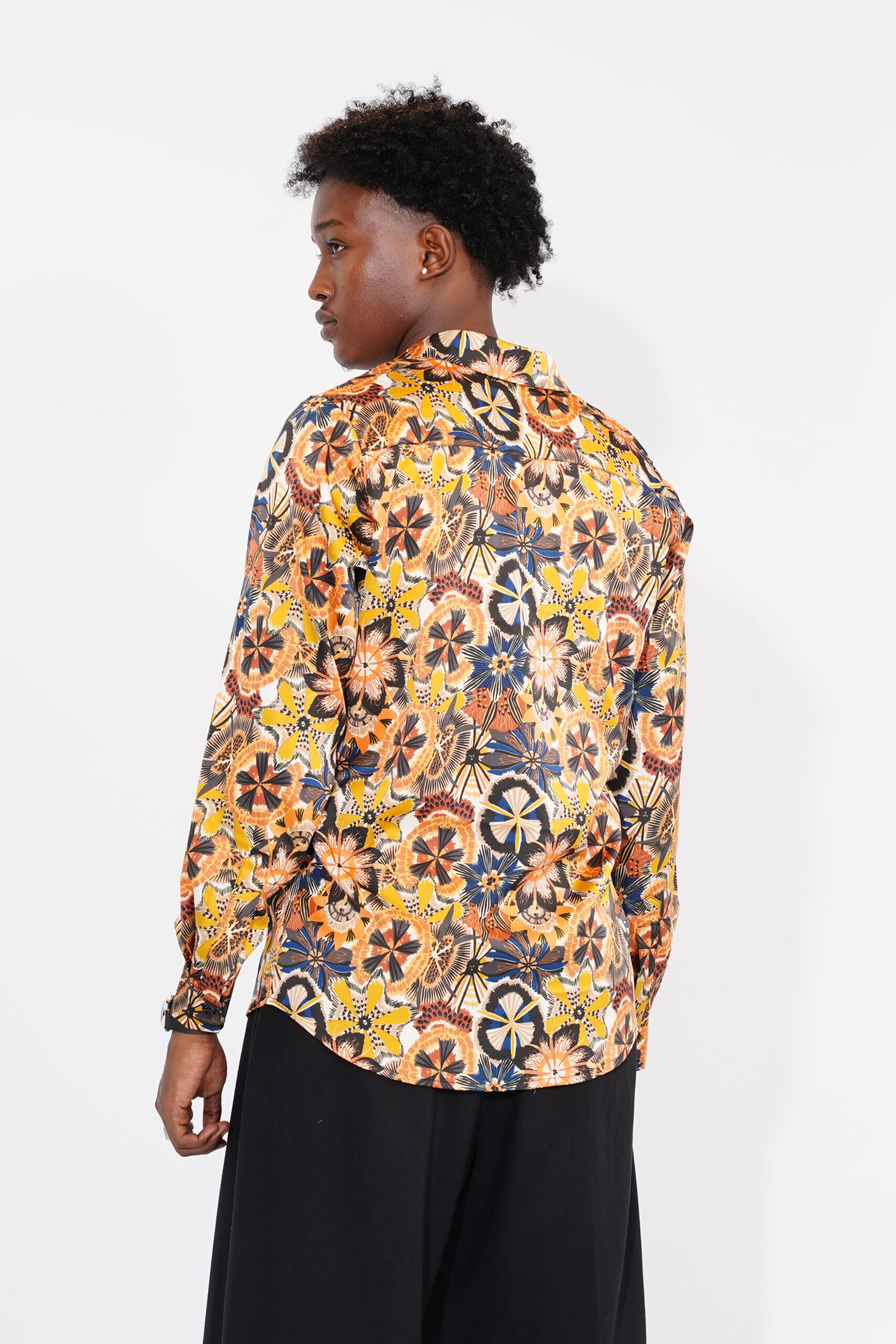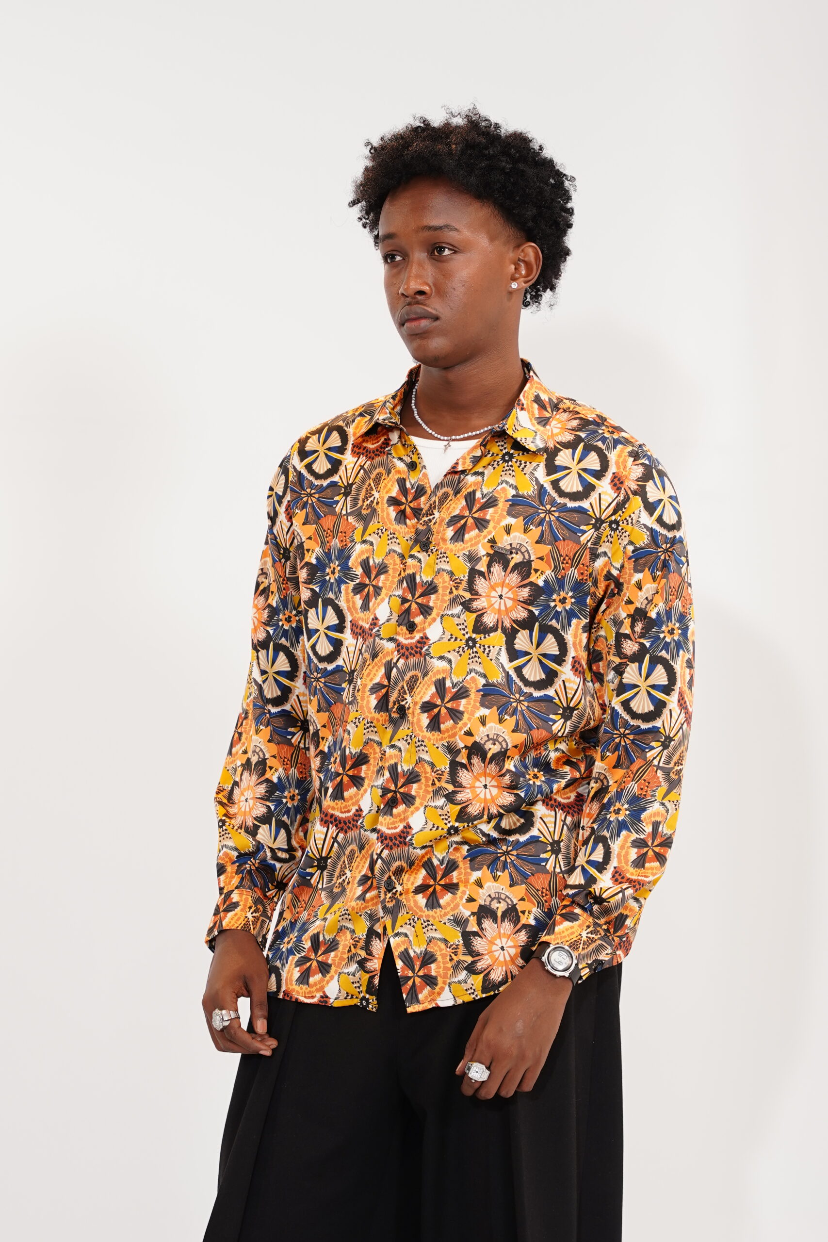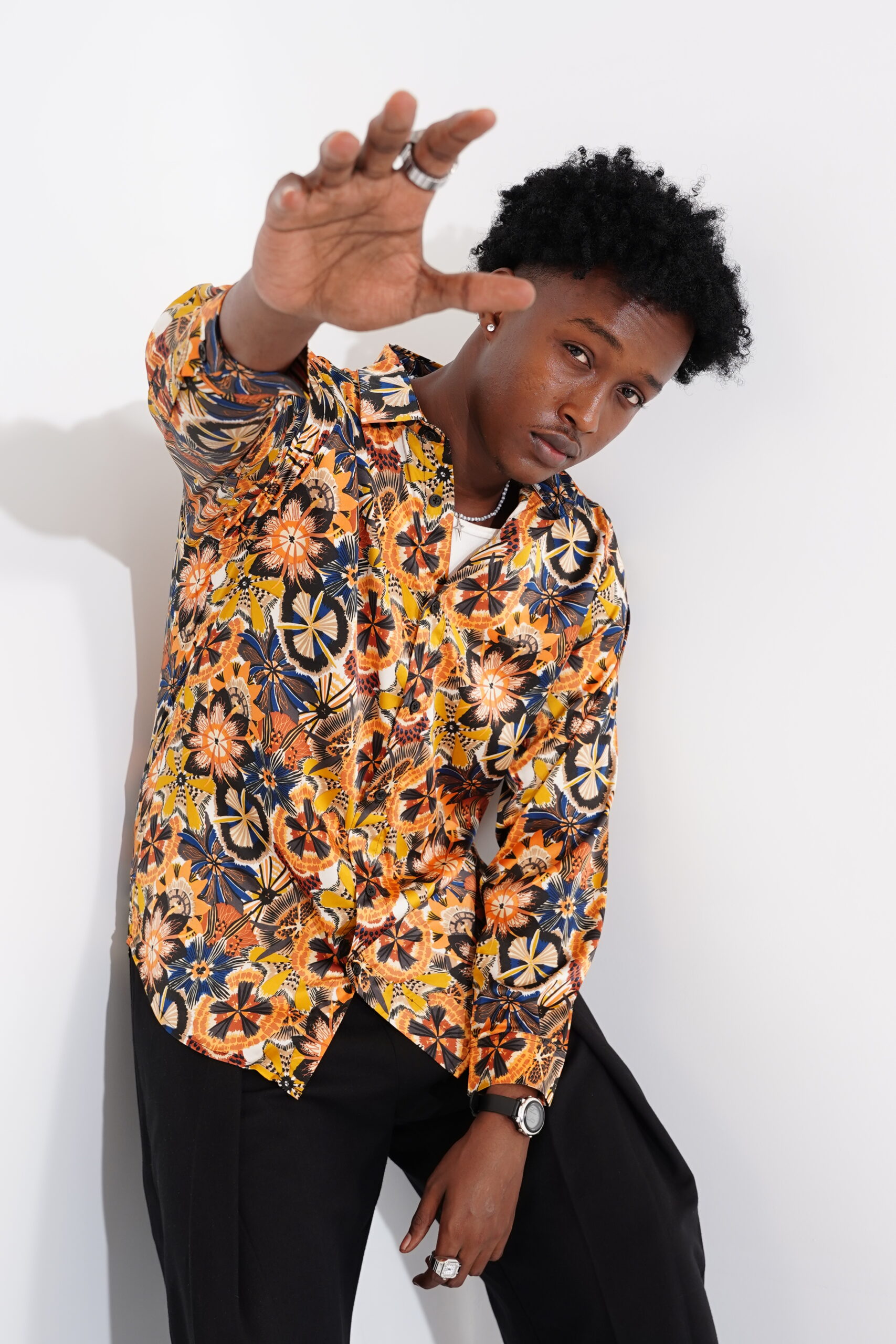 Turn heads wherever you go with this multicolor floral print long-sleeve shirt, designed for men who love bold style and standout confidence. Featuring a striking combination of yellow, navy, and orange floral patterns, this shirt adds a vibrant touch to any outfit.