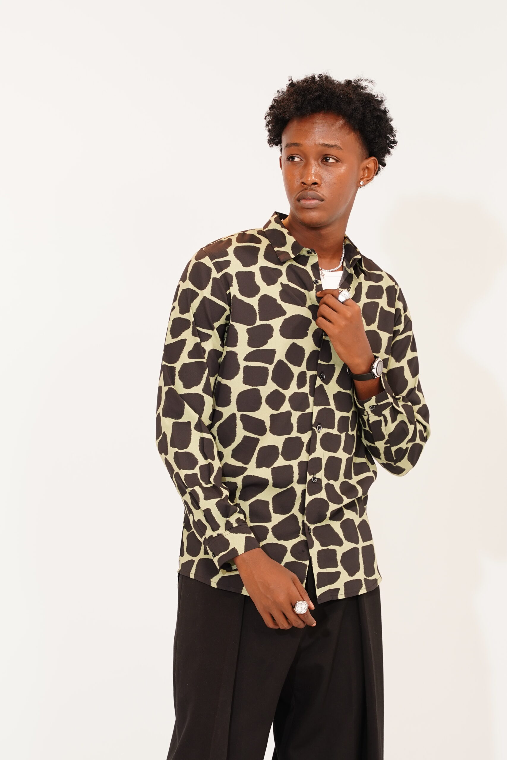 Men’s Abstract Animal Print Shirt Black & Olive Green Casual Button-Up Full Sleeve Top Safari-Inspired Fashion by Amriss