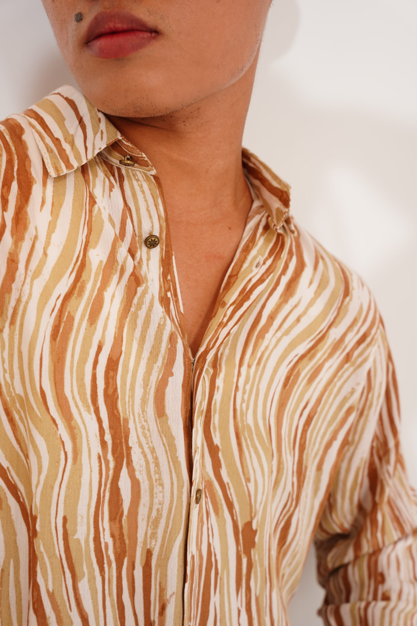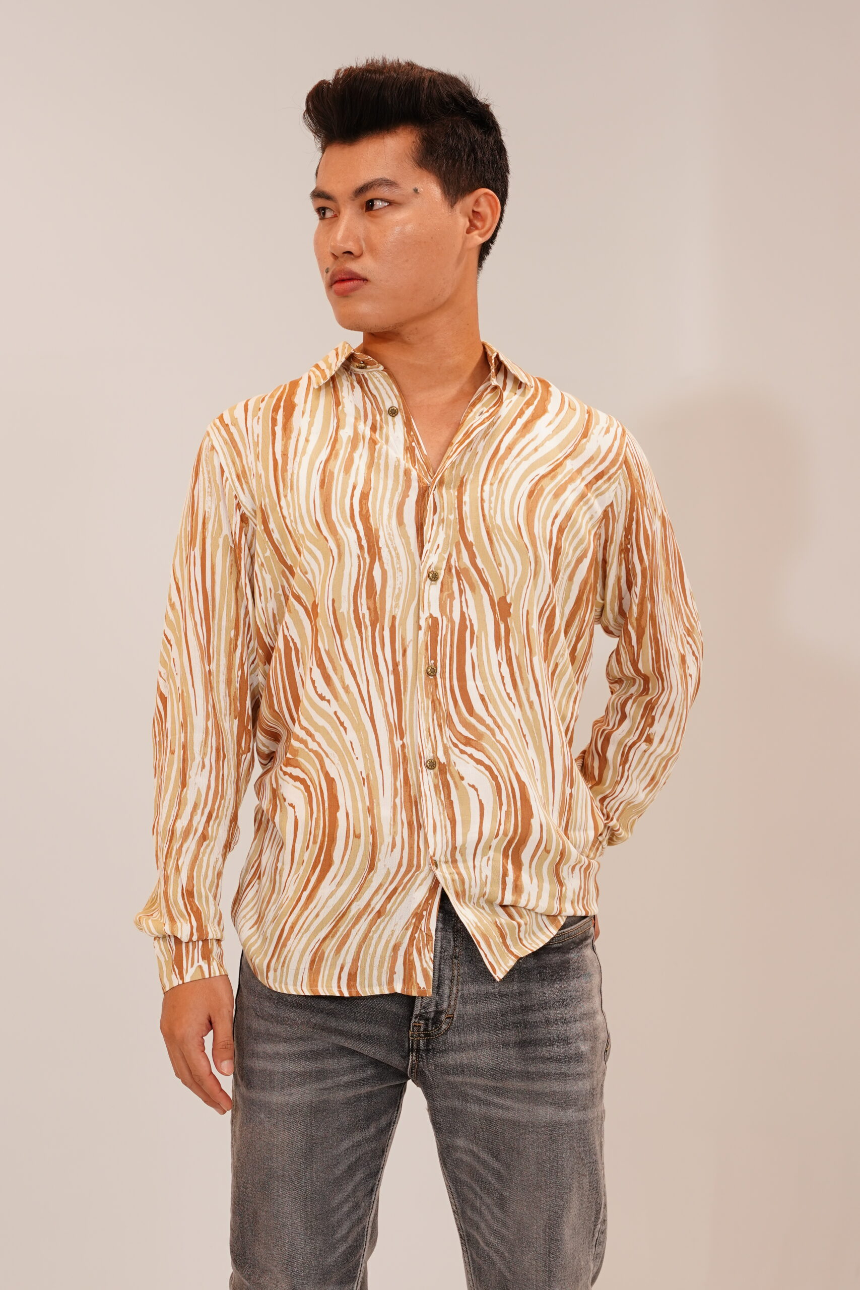 Men’s Beige & Brown Wave Print Shirt Casual Long Sleeve Cotton Button-Up Relaxed Fit Office Wear Shirt