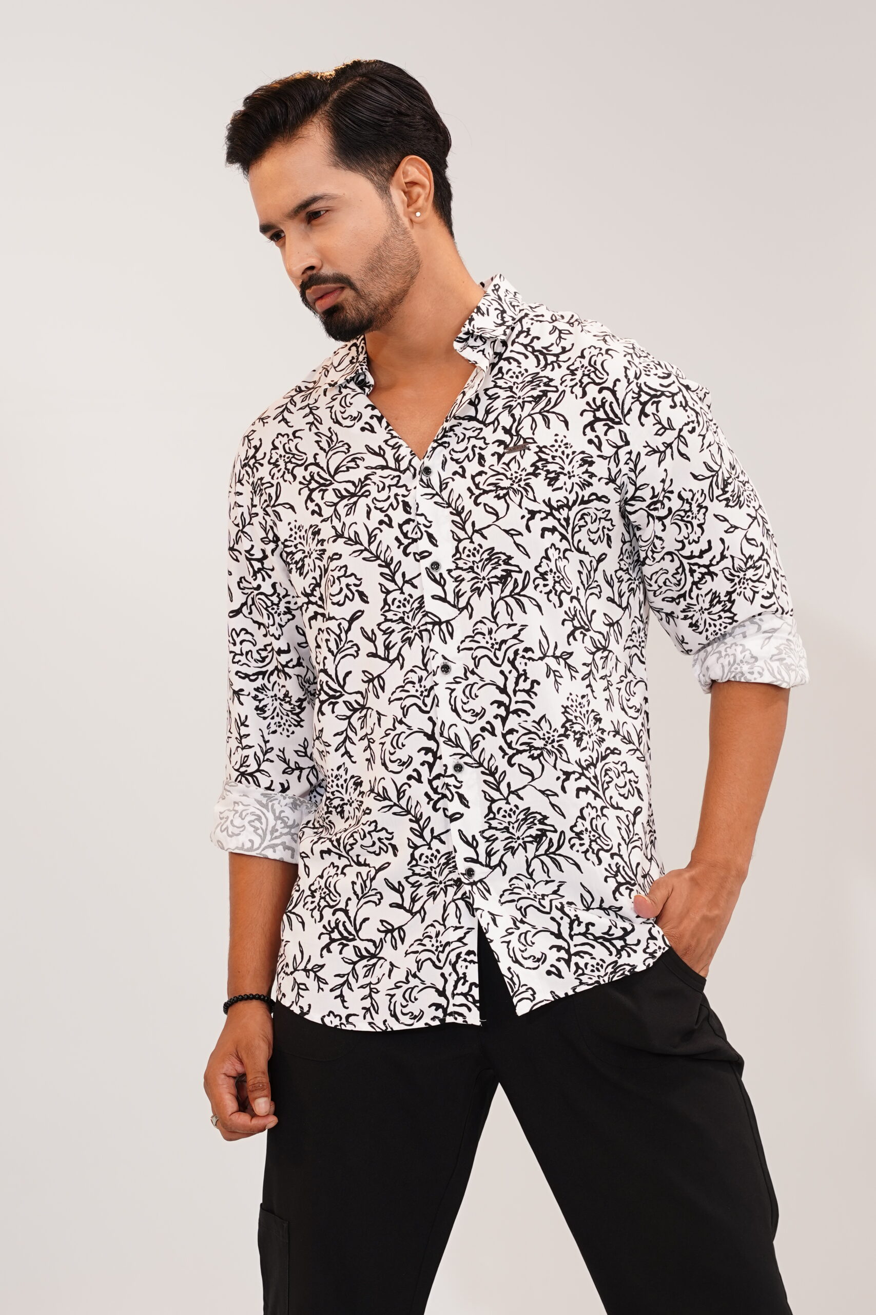 Stay effortlessly stylish with this black and white leaf print men’s shirt, crafted for comfort and versatility. Designed with a crisp white base and artistic black leaf patterns, it gives a bold yet refined look perfect for any occasion.
