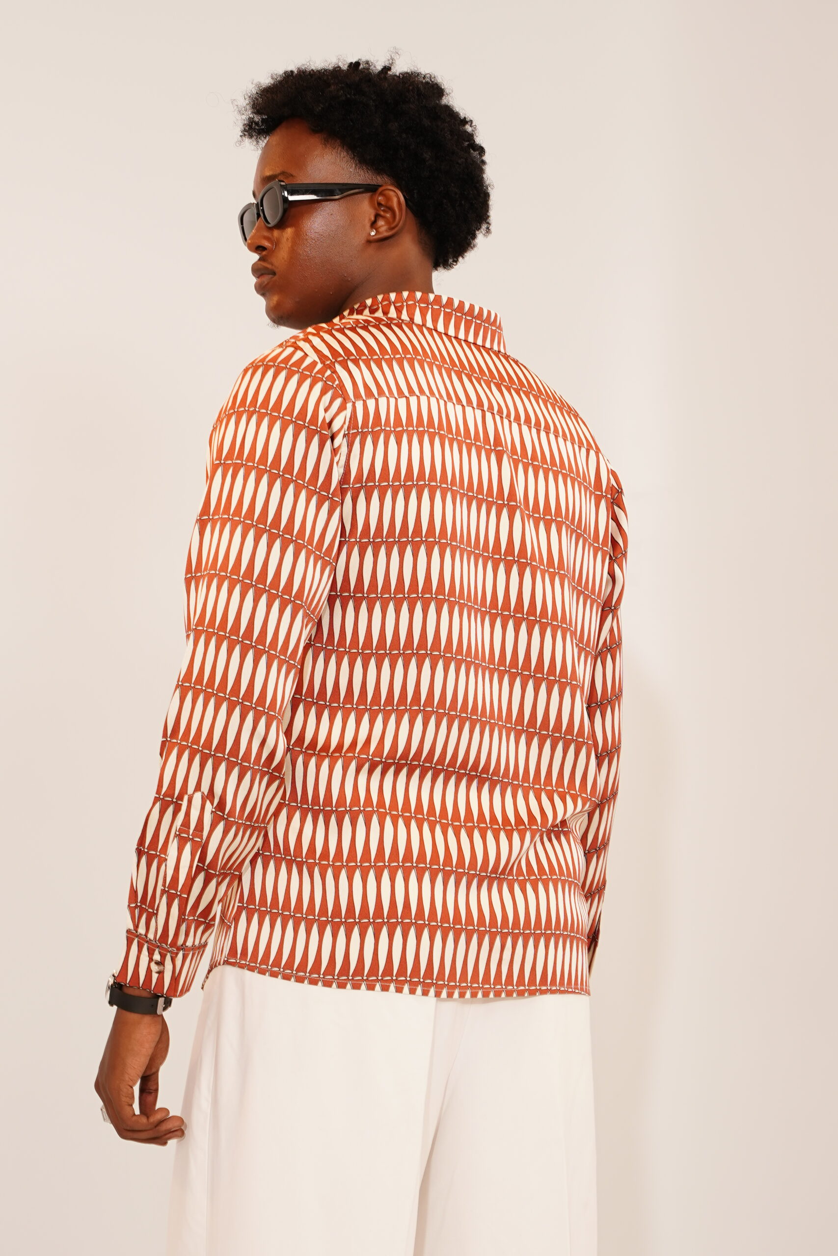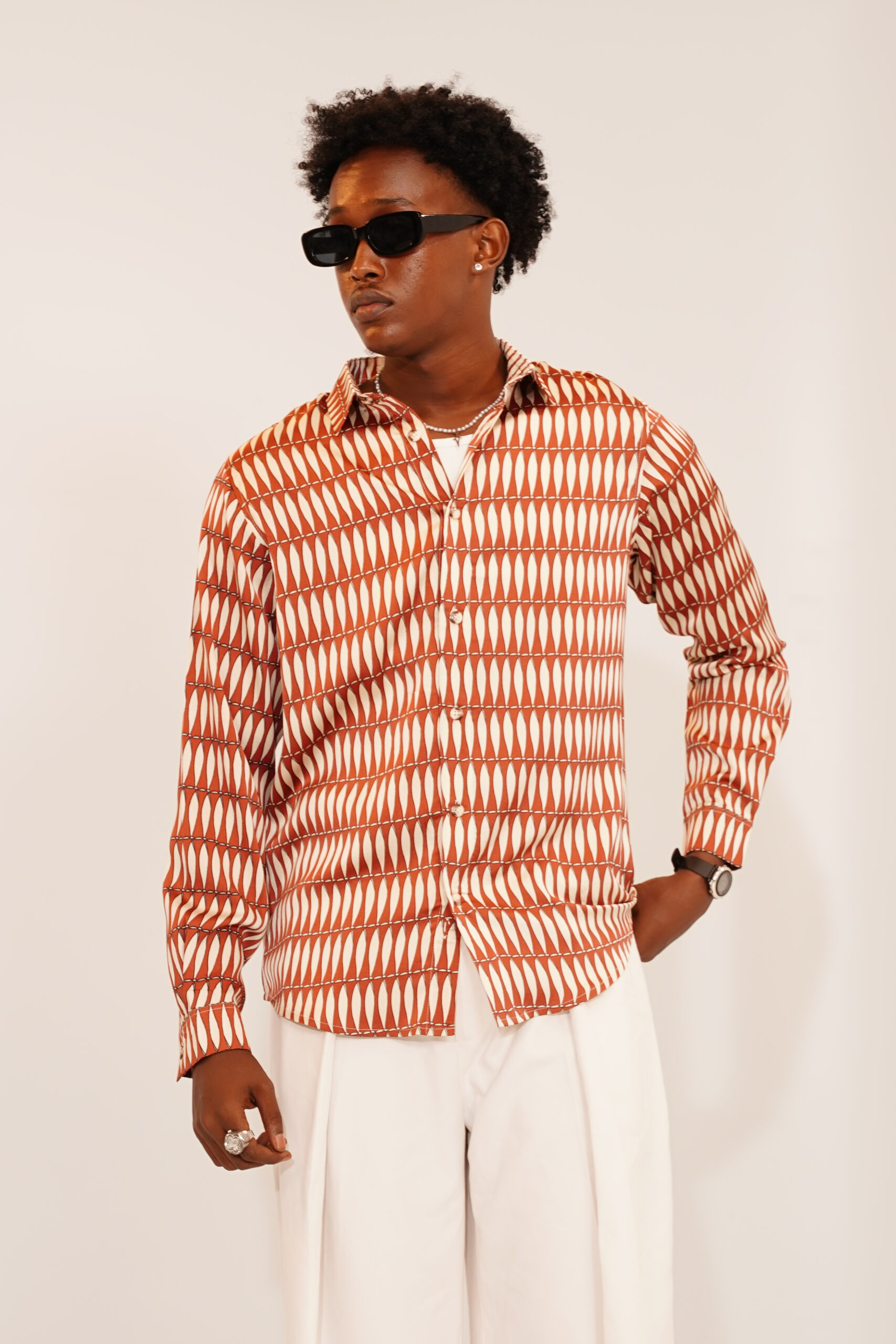 Red and Ivory Geometric Print Sharp Collar Men’s Premium Relaxed Fit Shirt
