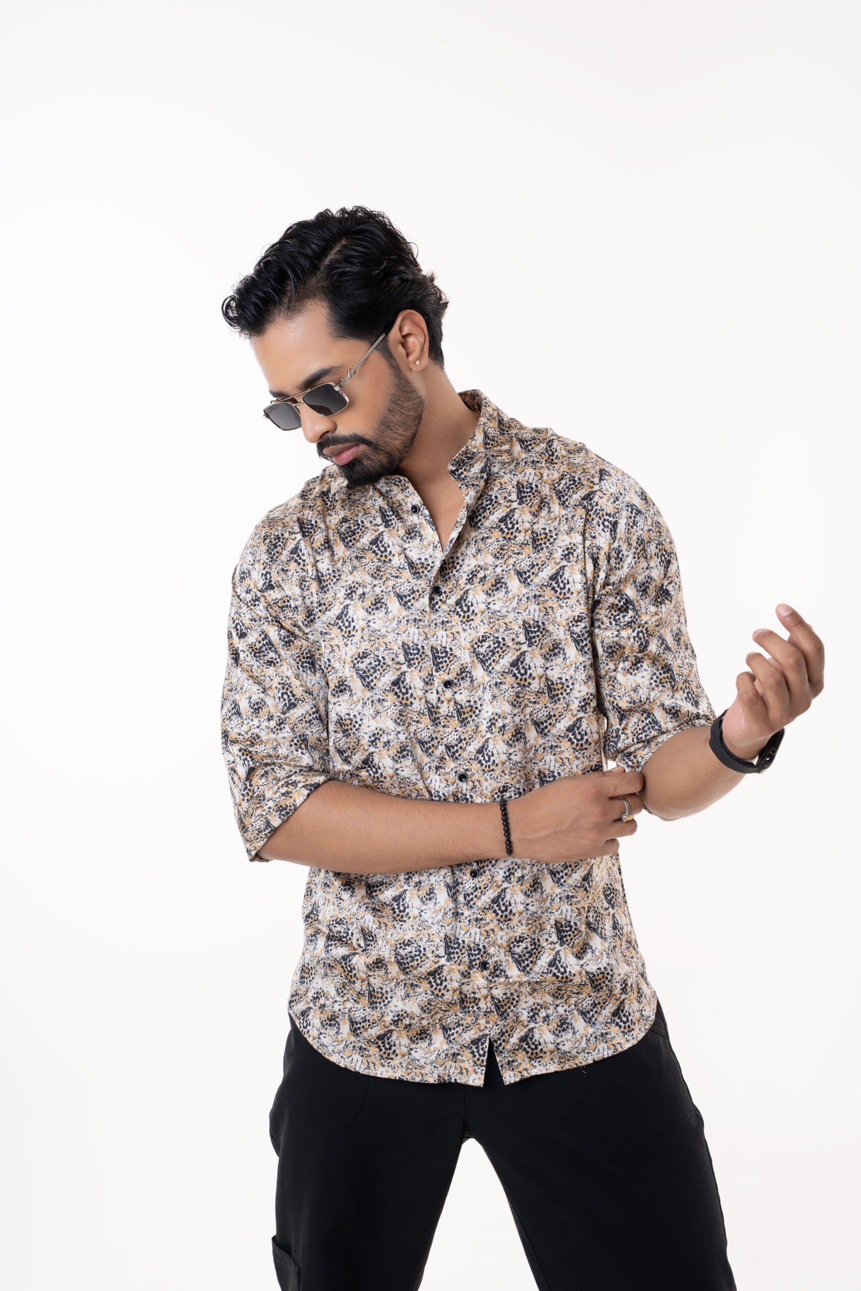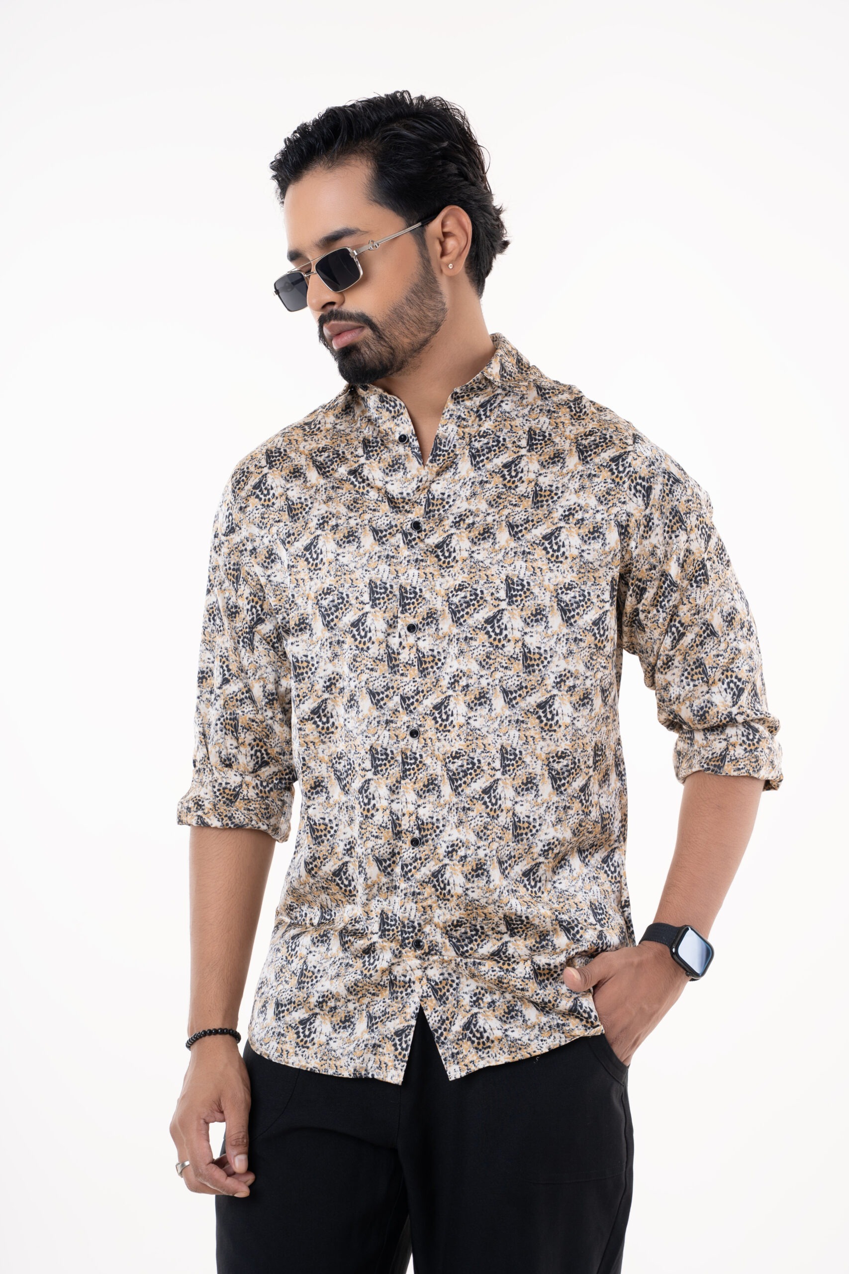 Monochrome floral print shirt crafted from soft cotton-blend fabric, combining bold expression with effortless comfort for any modern occasion.