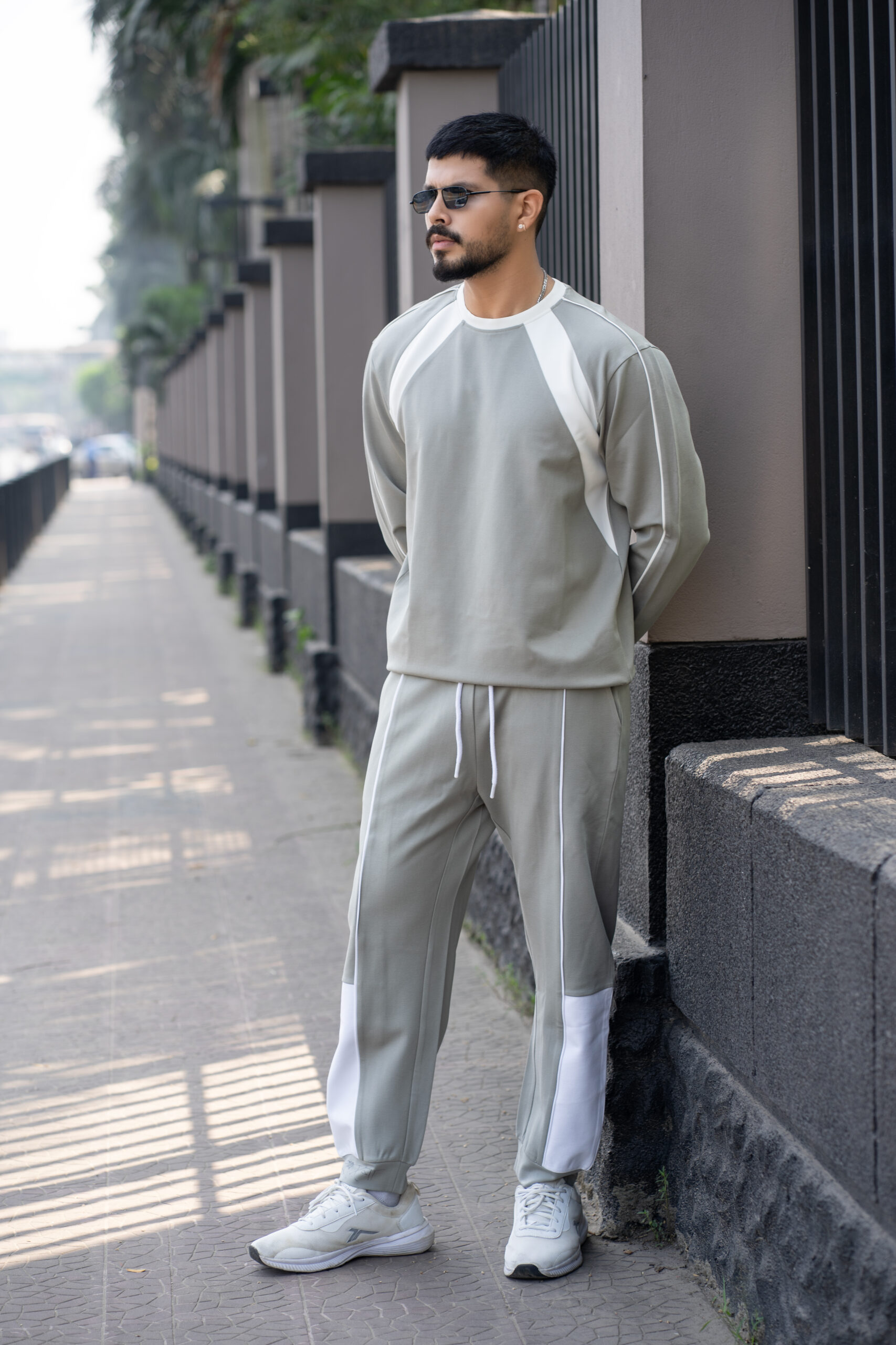Casual Blend Raglan Sweatshirt and Contrast Patchwork Pant Tracksuit Set features soft fabric, raglan sleeves and clean contrast paneling for a refined athletic look.