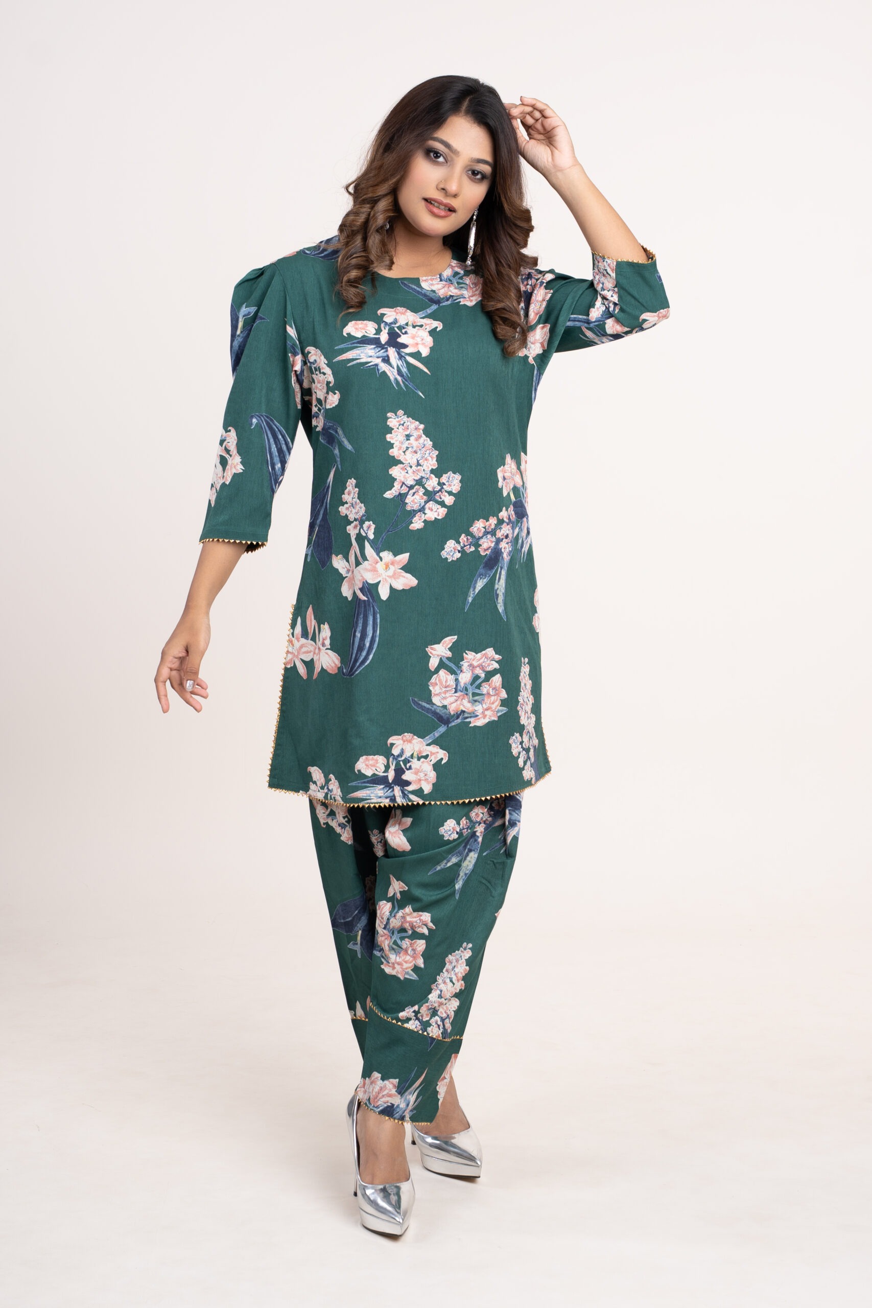 Modern Women Floral Two Piece Set Kurti Top with Matching Pants Soft Fabric Design for Casual Office and Party Wear