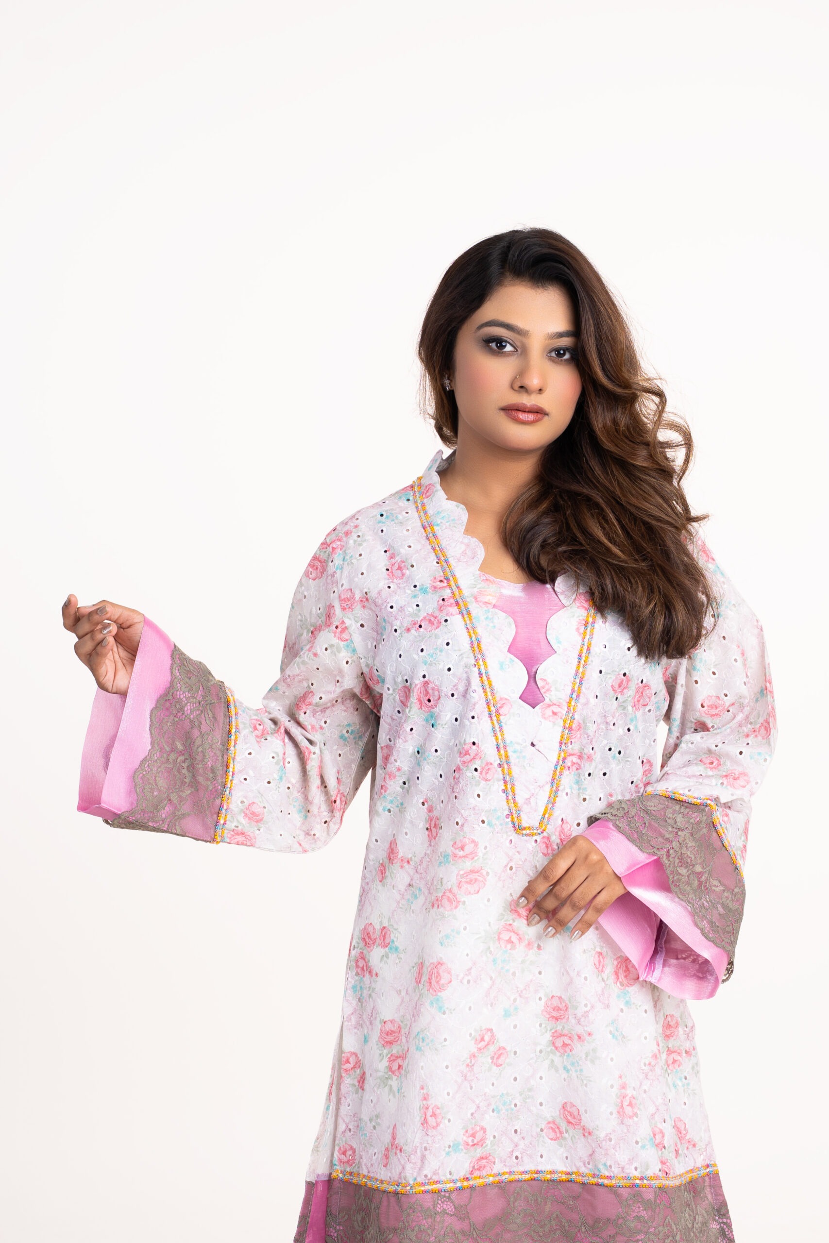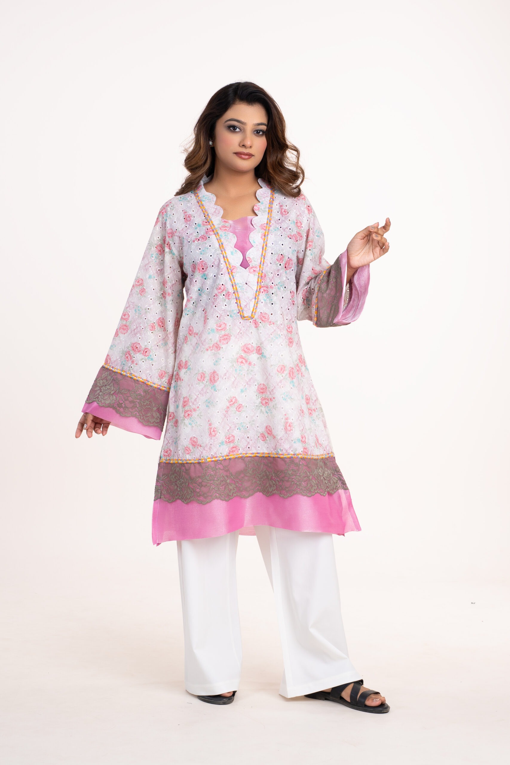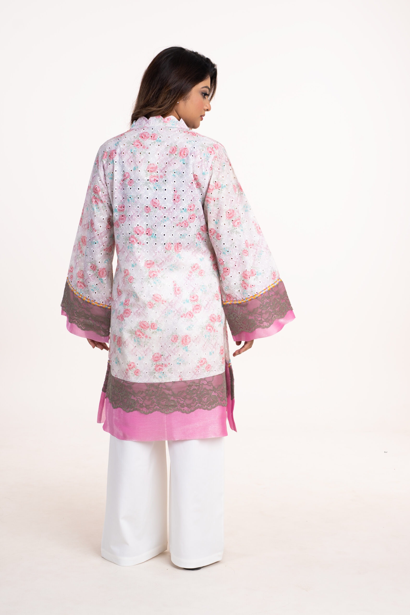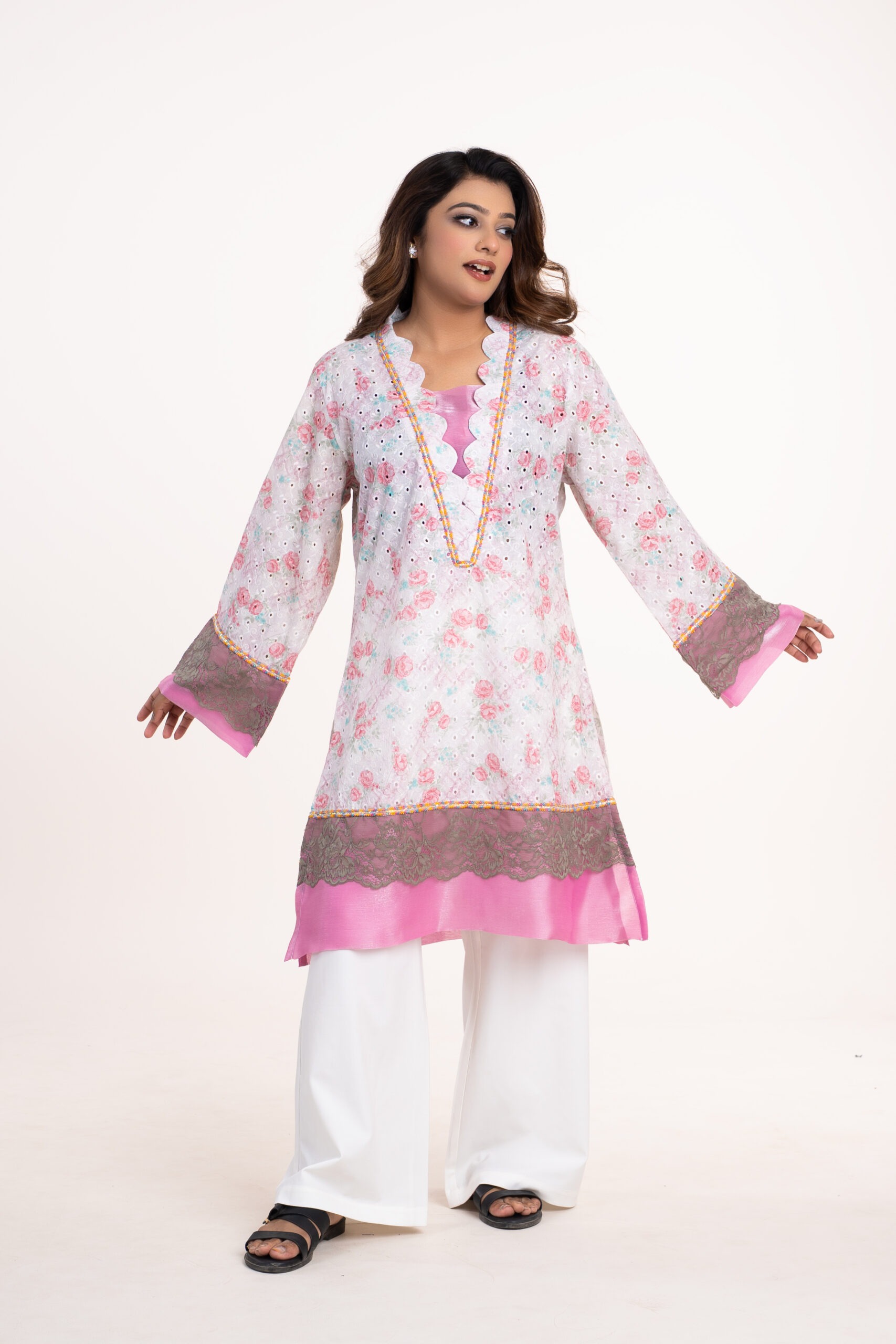 The tunic showcases an all-over floral print on a soft white base, enhanced with delicate pink accents that add a fresh and feminine charm. A scalloped neckline with decorative detailing elevates the overall look, while contrast lace trims at the hem and sleeves introduce a refined luxury finish. The long sleeves provide coverage without compromising comfort, making the piece suitable for extended wear.