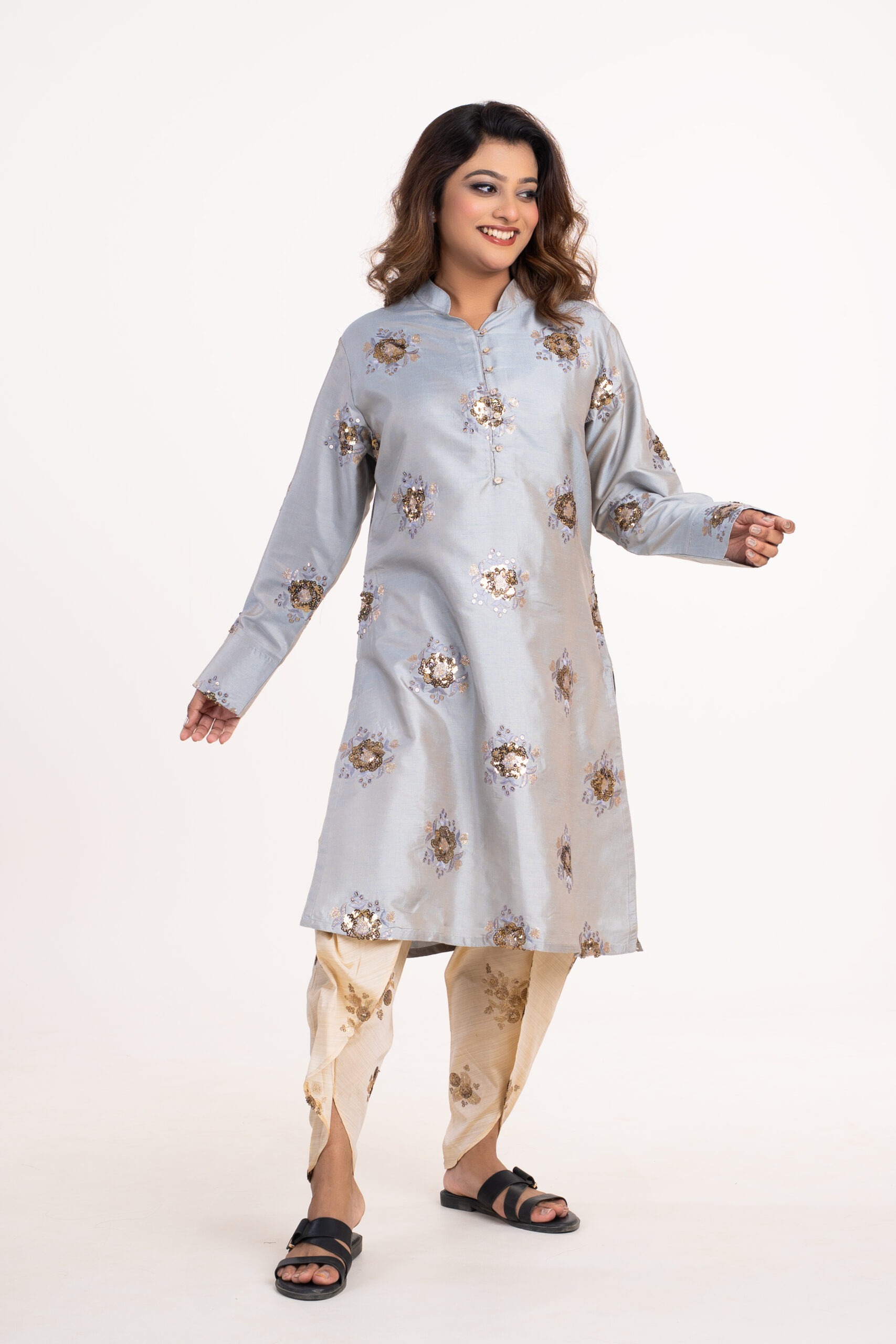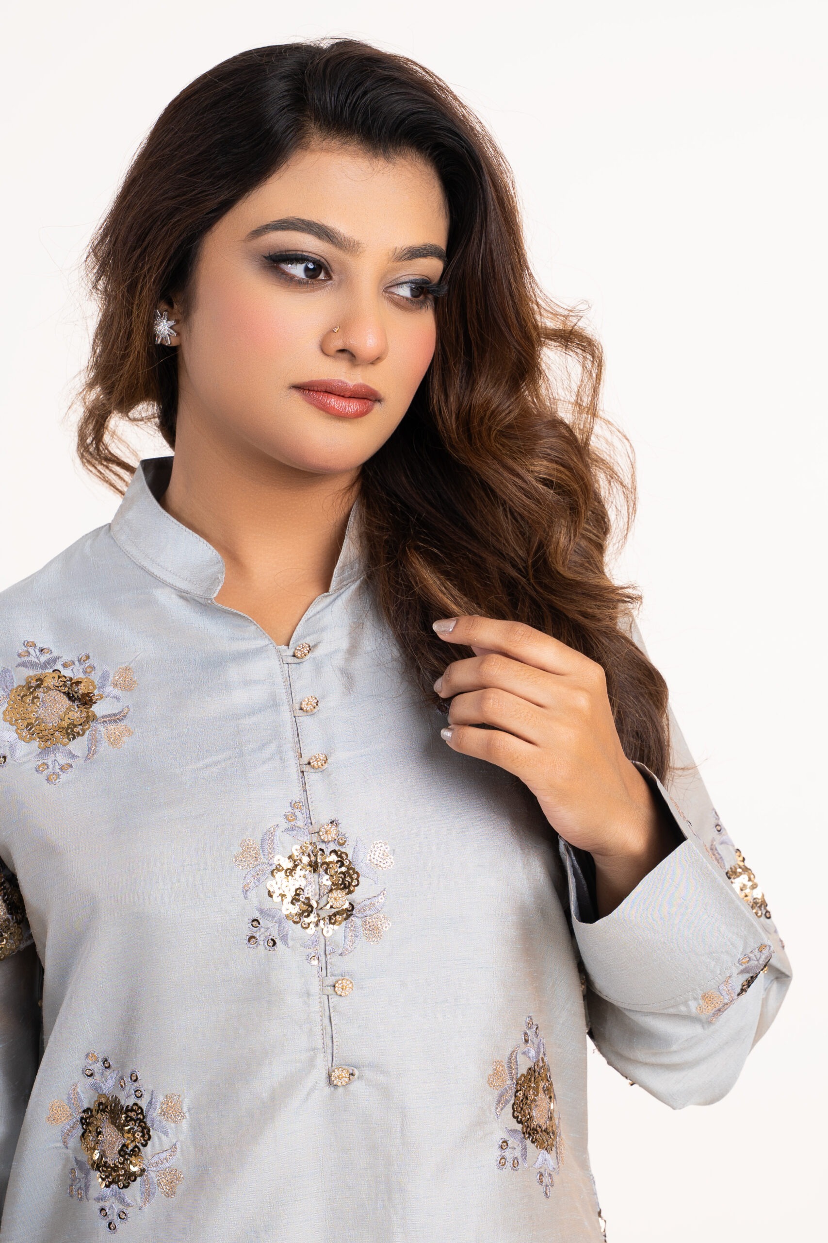 This elegant two-piece co-ord set is designed for women who appreciate refined details and effortless style. Crafted in a smooth silk-blend fabric, the outfit features a graceful light blue base enhanced with delicate gold and ivory embroidery. The subtle sheen of the fabric adds a polished finish, making it suitable for both daytime occasions and evening gatherings.