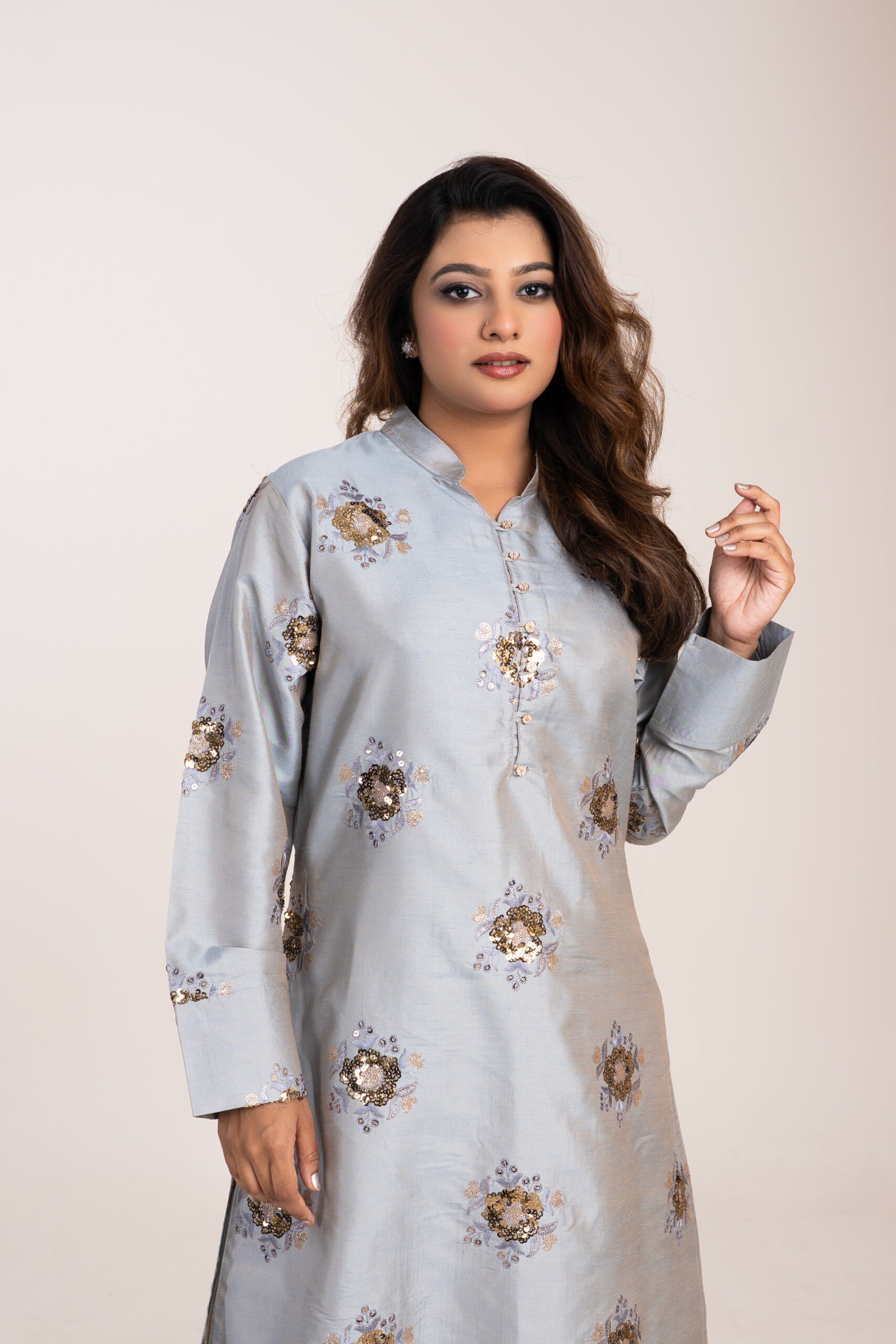 The kurti is tailored in a straight silhouette, offering a flattering drape without compromising comfort. It features a clean, round neckline with a minimal button placket that enhances the front design while maintaining a sophisticated look. The evenly spaced embroidered motifs elevate the overall appearance without appearing heavy, making the piece versatile and timeless.