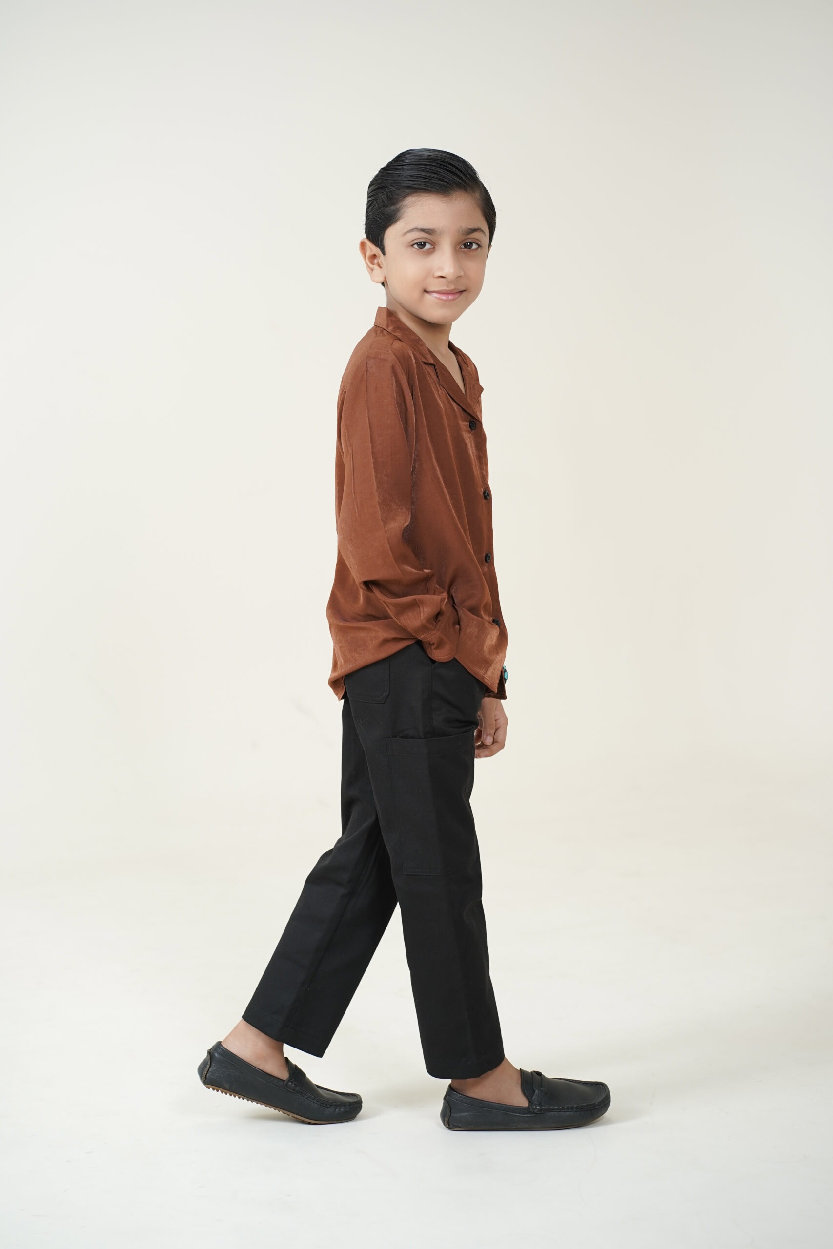 The coffee brown shirt features a classic collar, front button closure, and a relaxed fit, making it perfect for both casual outings and family gatherings. Paired with tailored black trousers featuring a comfortable waistband and straight-cut silhouette, the outfit offers a clean, versatile look that’s both trendy and timeless.