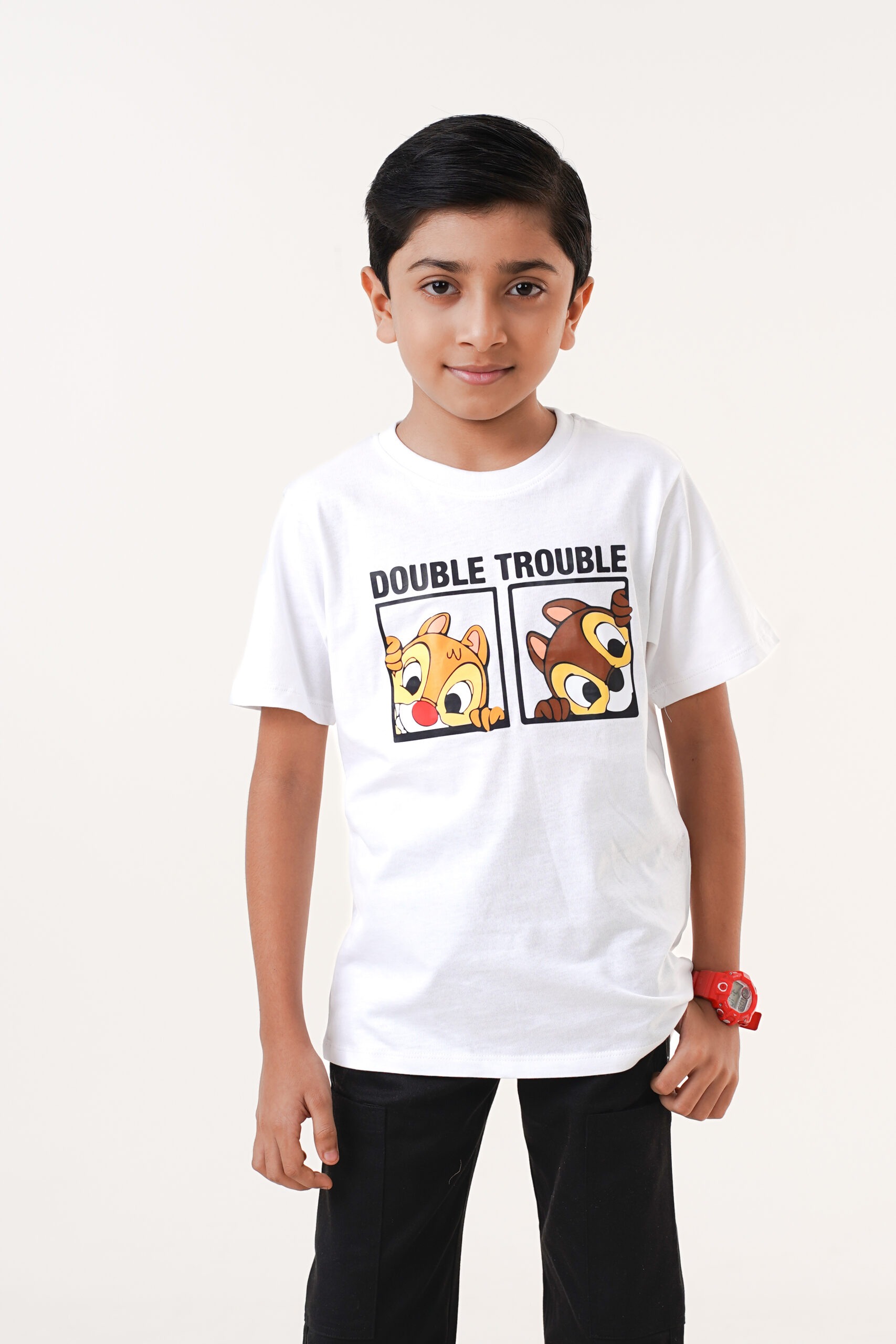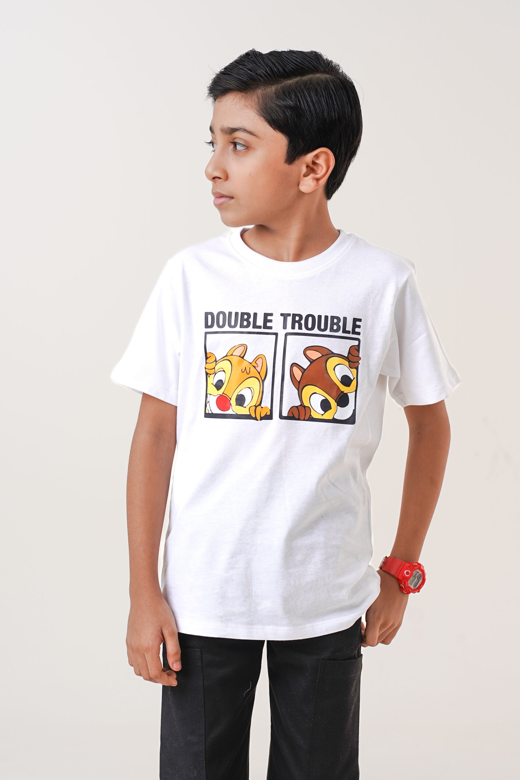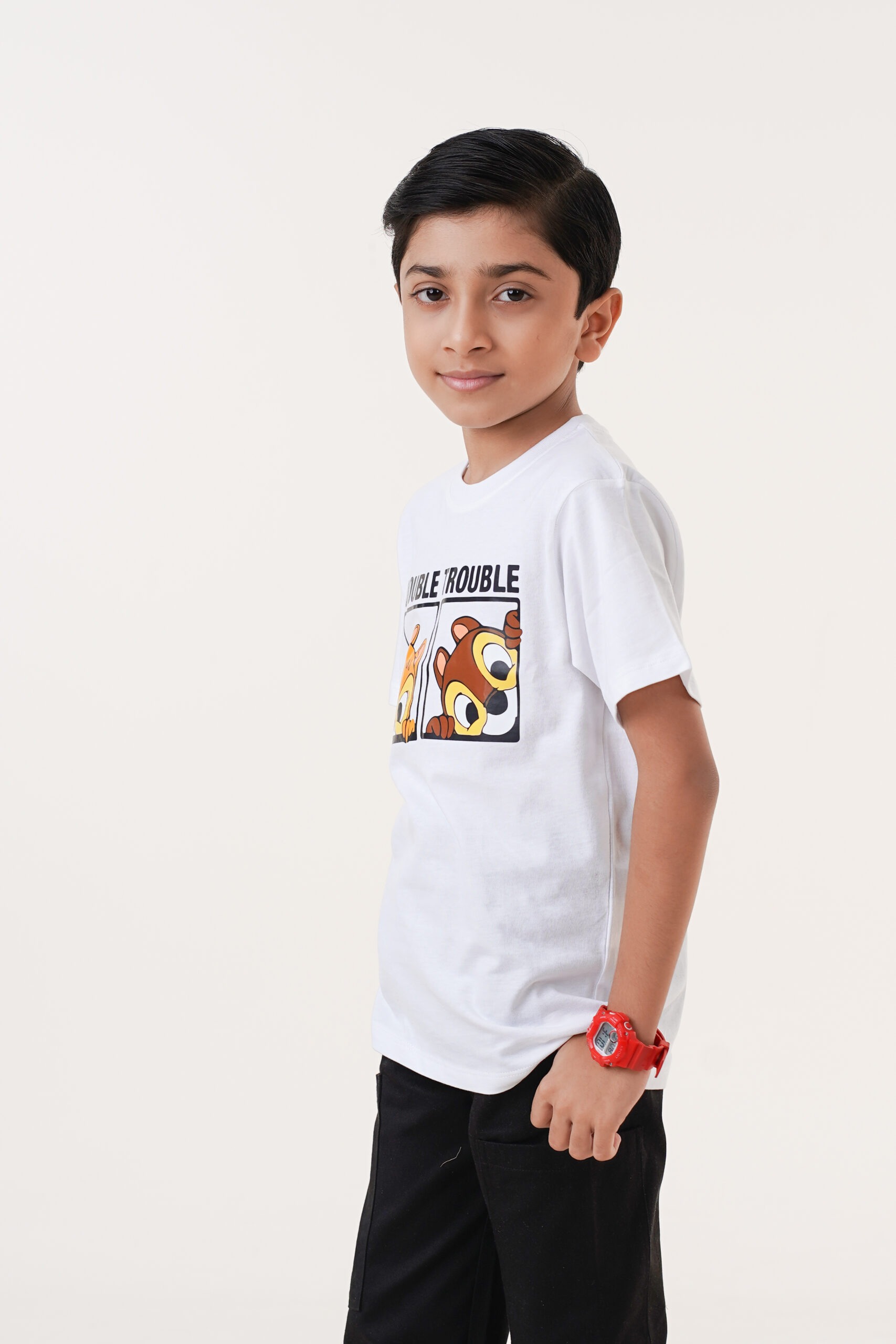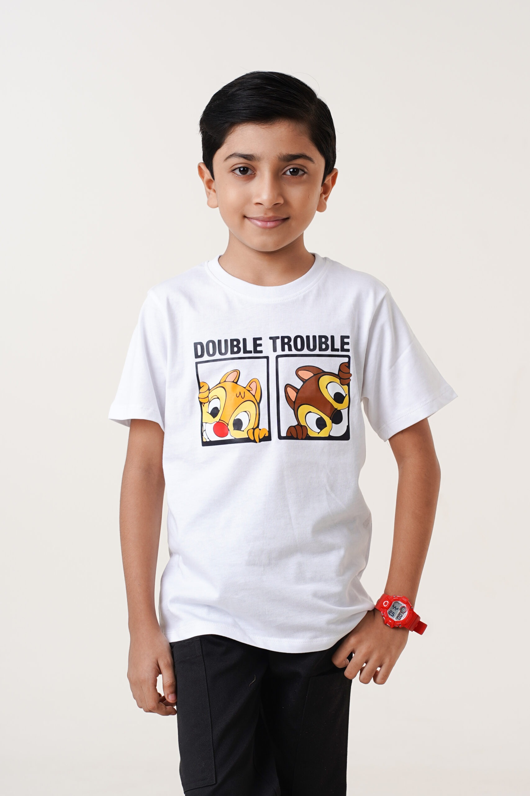 Boys’ Double Trouble Cartoon Print Soft Cotton White Kids Wear T-Shirt
