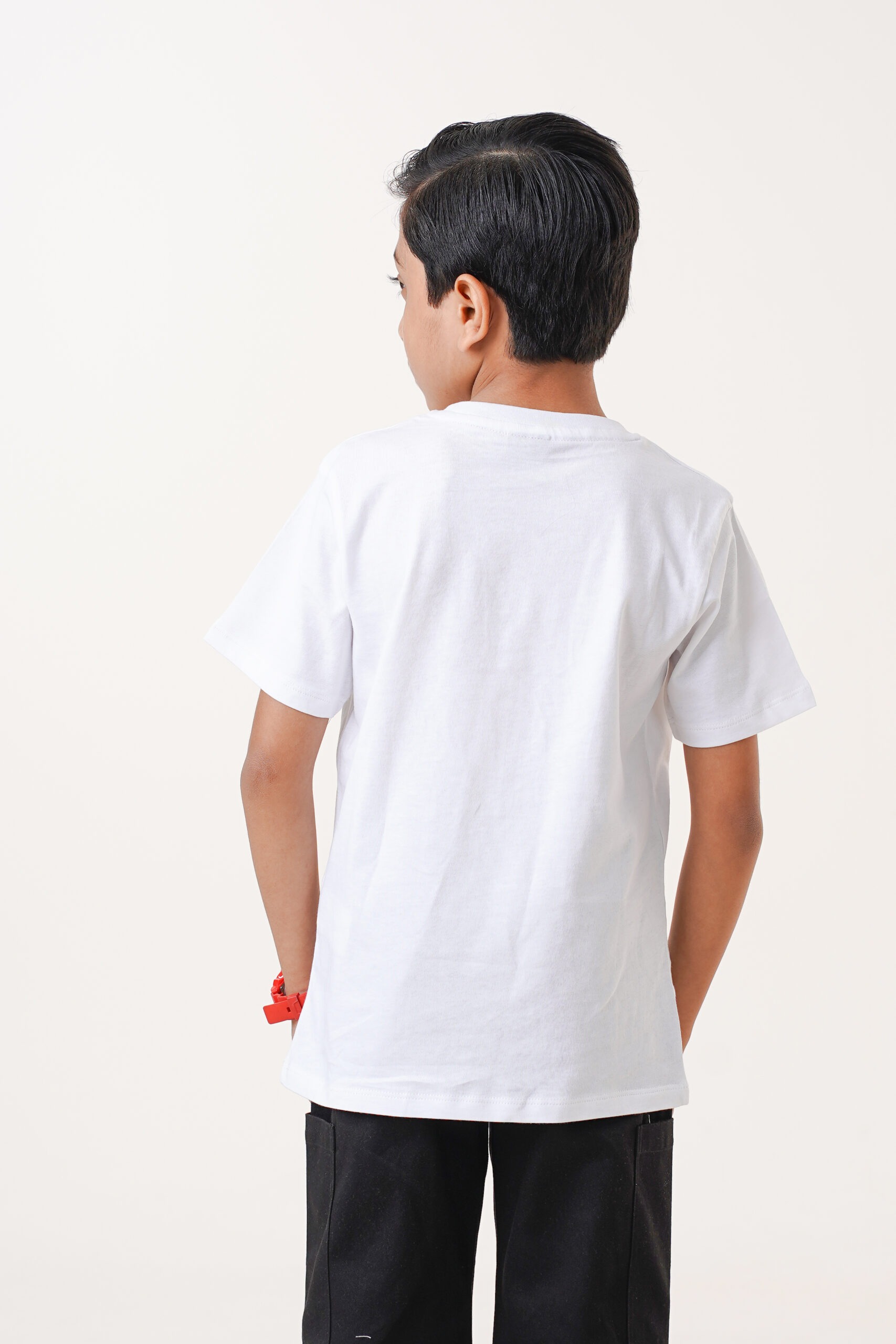 The bold and colorful cartoon character graphic adds a cheerful vibe, while the crisp white base keeps the look fresh and versatile. With a classic round neck and relaxed fit, this T-shirt ensures easy movement and maximum comfort for active kids.