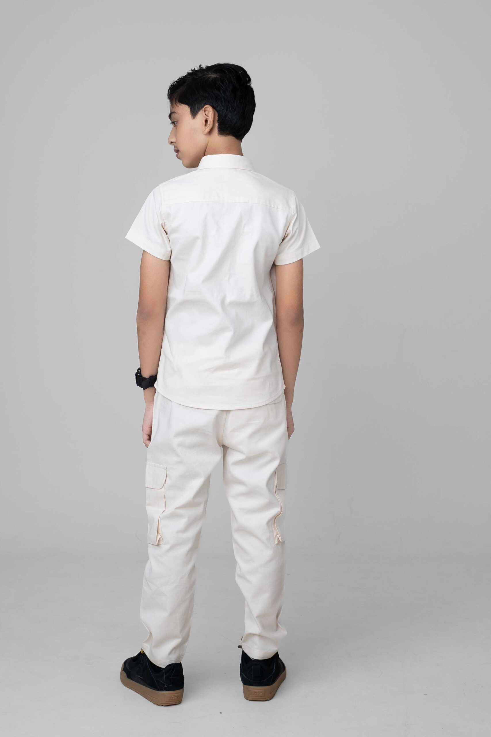 The shirt features a smart collar design paired with dual flap cargo pockets, adding structure and practicality to the look. Its minimalistic stitching and clean silhouette offer a polished appearance while still feeling casual and effortless. The button-down closure allows easy wearing and ensures a secure, comfortable fit. The cargo pant includes multiple flap pockets, providing room for carrying small essentials like toys, accessories, or snacks—making it functional as well as stylish.
