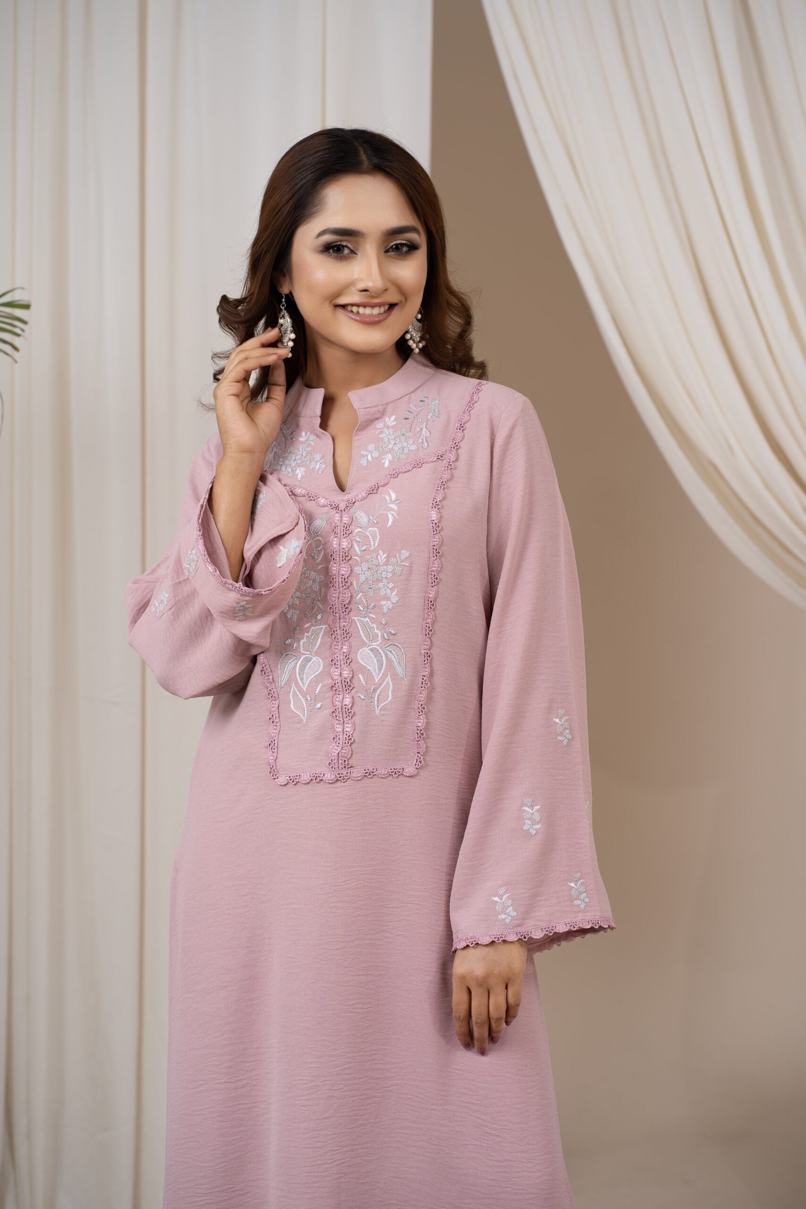 The front panel is enhanced with delicate thread embroidery complemented by lace detailing that adds depth and subtle character to the design. The dusty rose tone brings a calm and sophisticated feel making it suitable for both everyday styling and semi formal occasions.