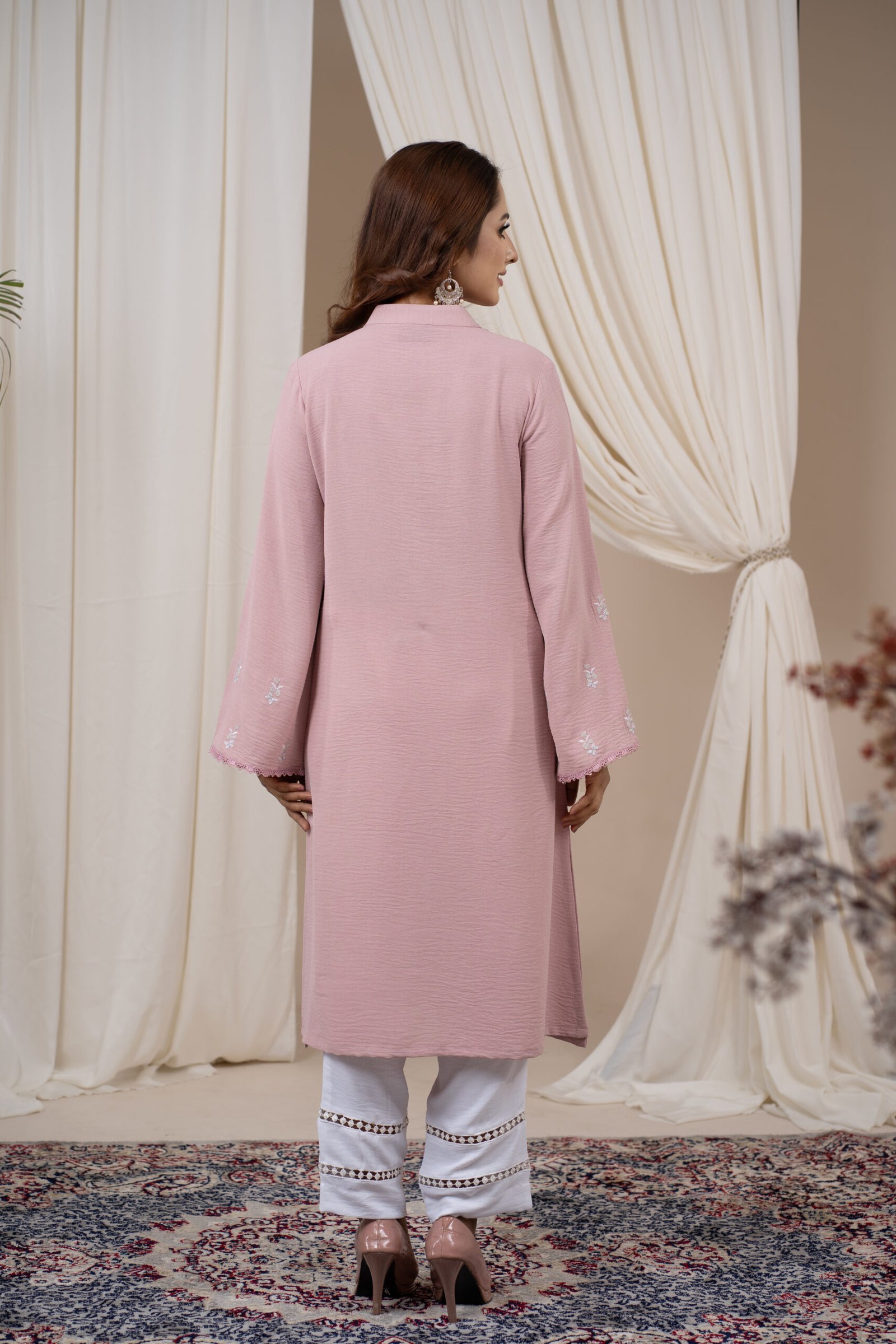 Dusty Rose Embroidered Two Piece Amriss Designer Collection Co-Ord Set with Lace Panel Detail Straight Kurti and Pant Outfit for Women