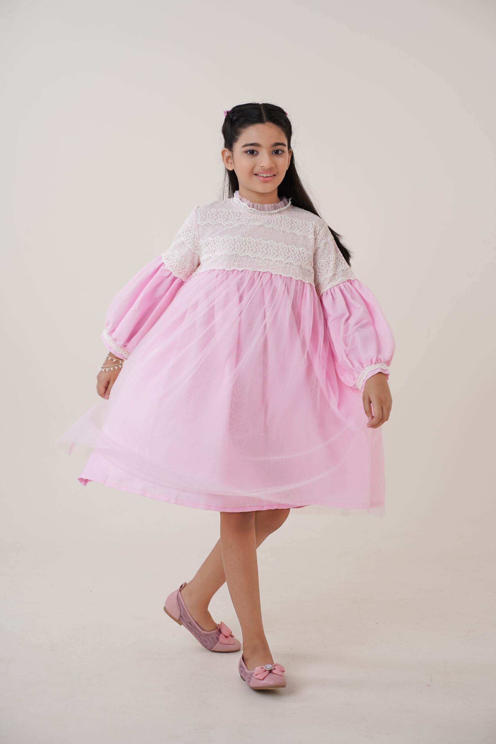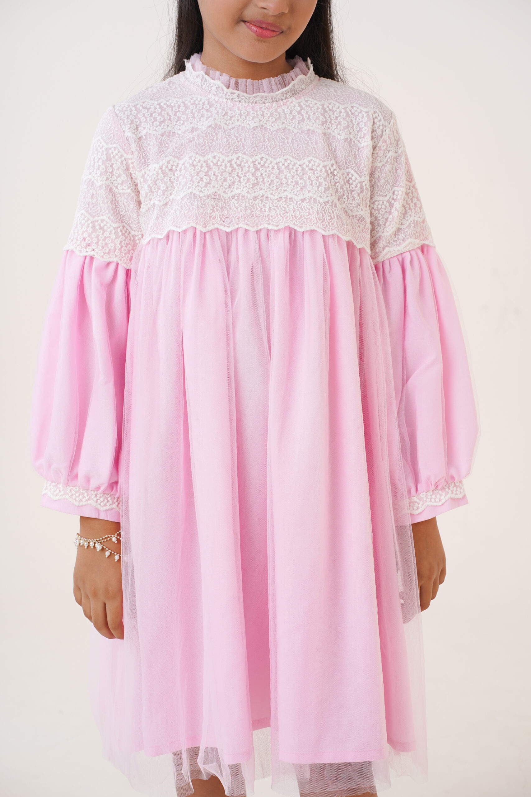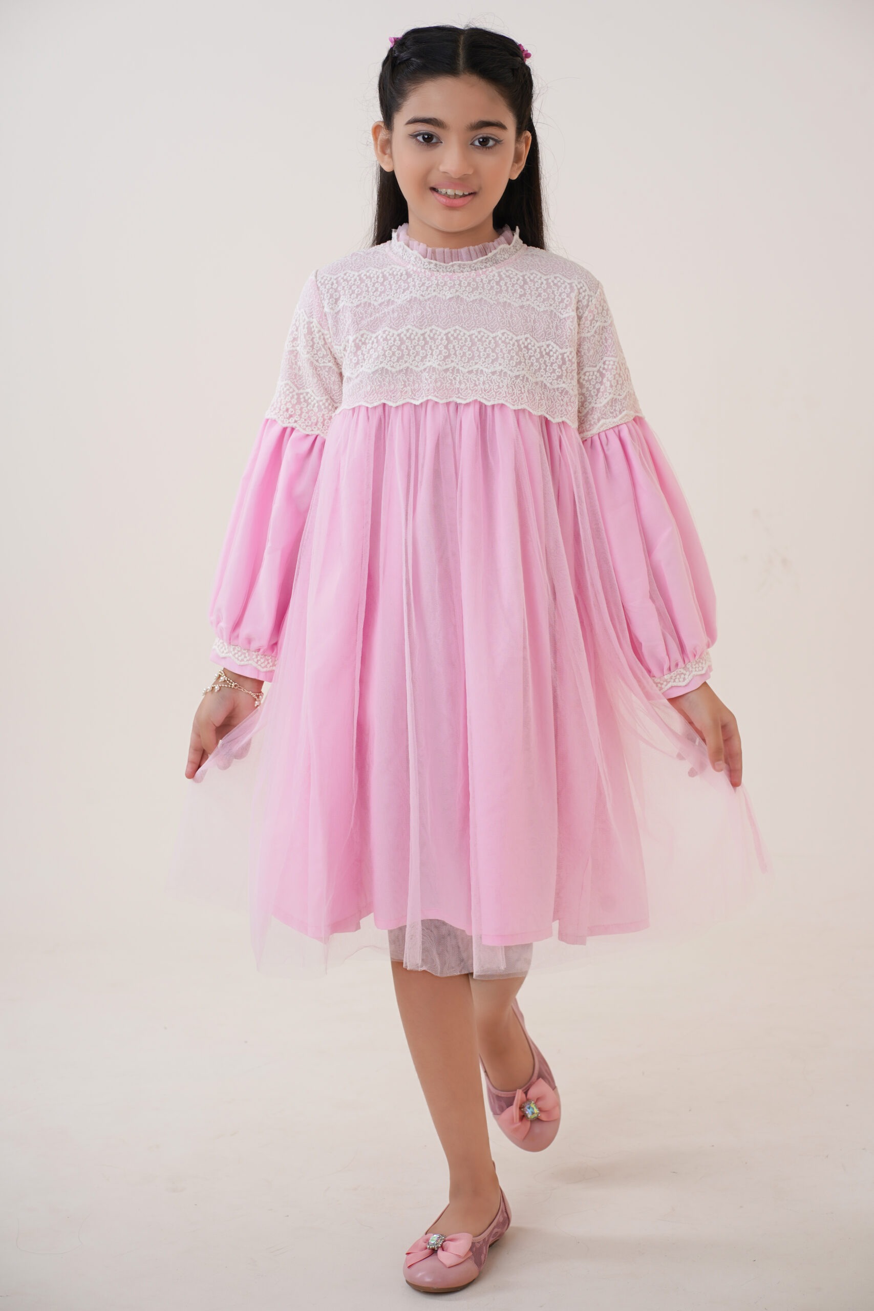 The long puff sleeves with lace-trimmed cuffs add a classic touch, ensuring comfort while maintaining a stylish, graceful appearance. The high neckline with soft ruffle detailing enhances the overall princess-inspired look. The dress is fully lined for modesty and comfort, allowing kids to move freely and play with ease. With its premium-quality fabric and thoughtful construction, this dress promises durability, breathability, and an all-day comfortable fit. Whether she’s twirling around, posing for photos, or standing at the center of attention, this dress ensures she looks adorable and feels confident.