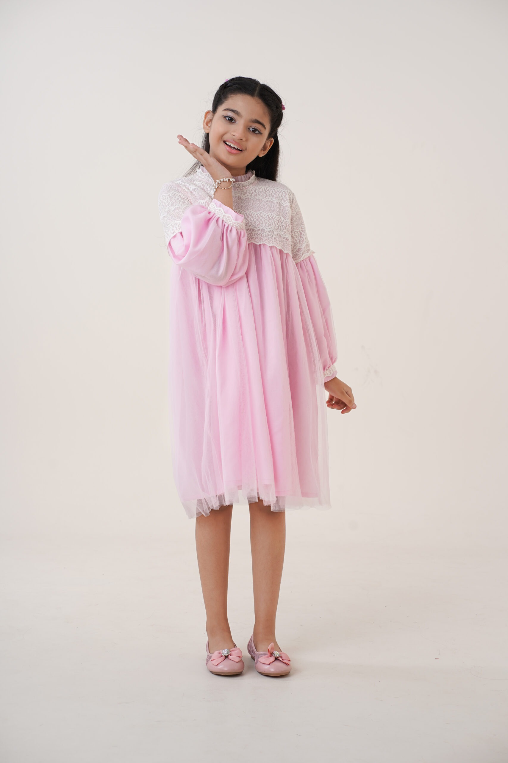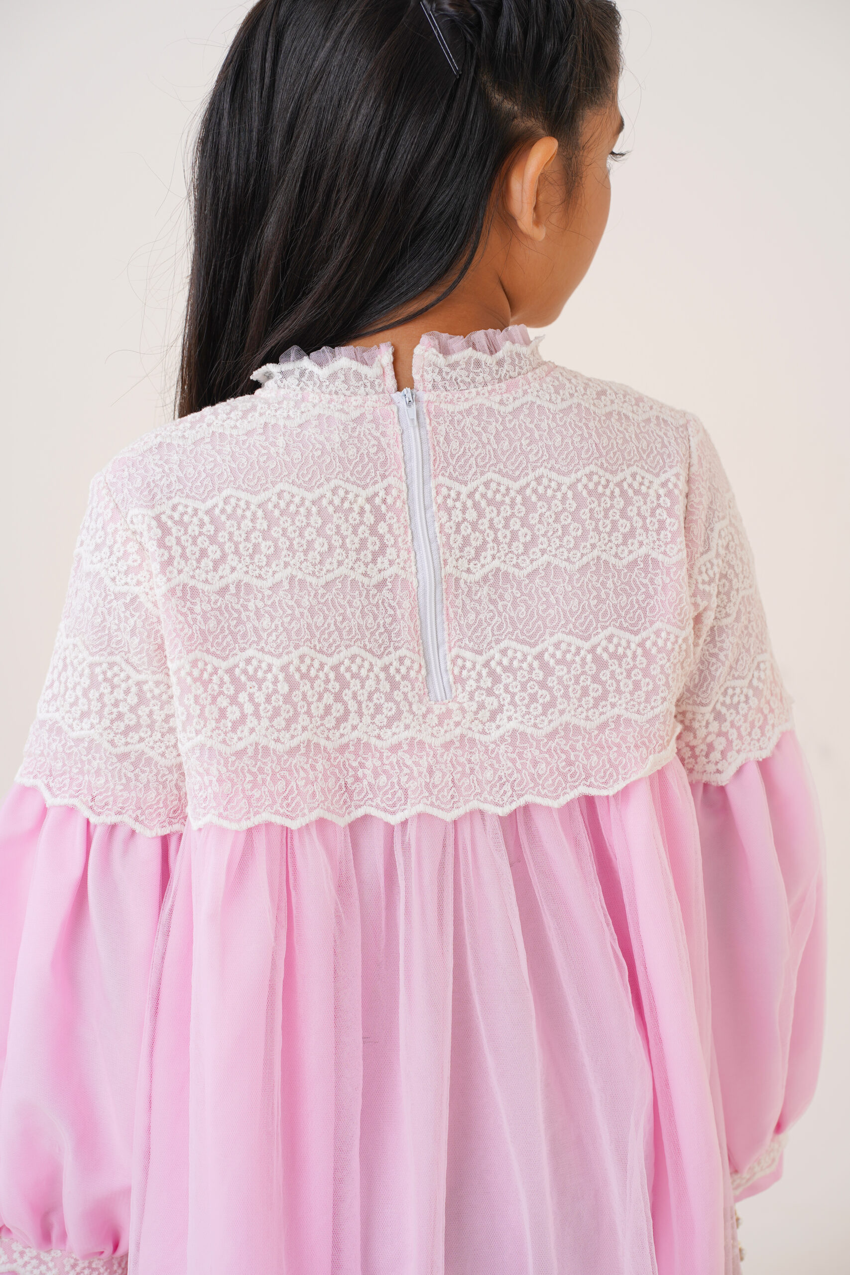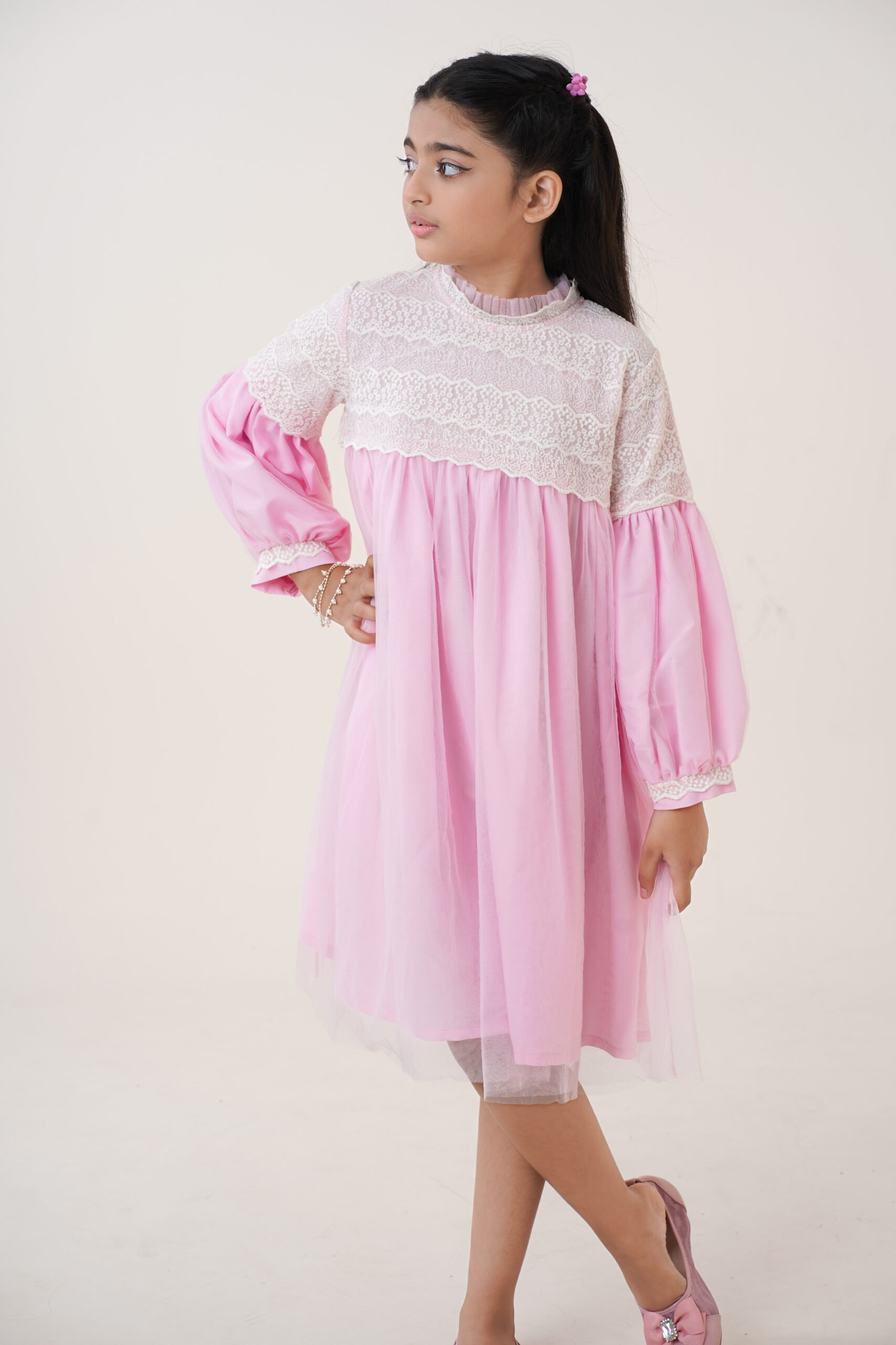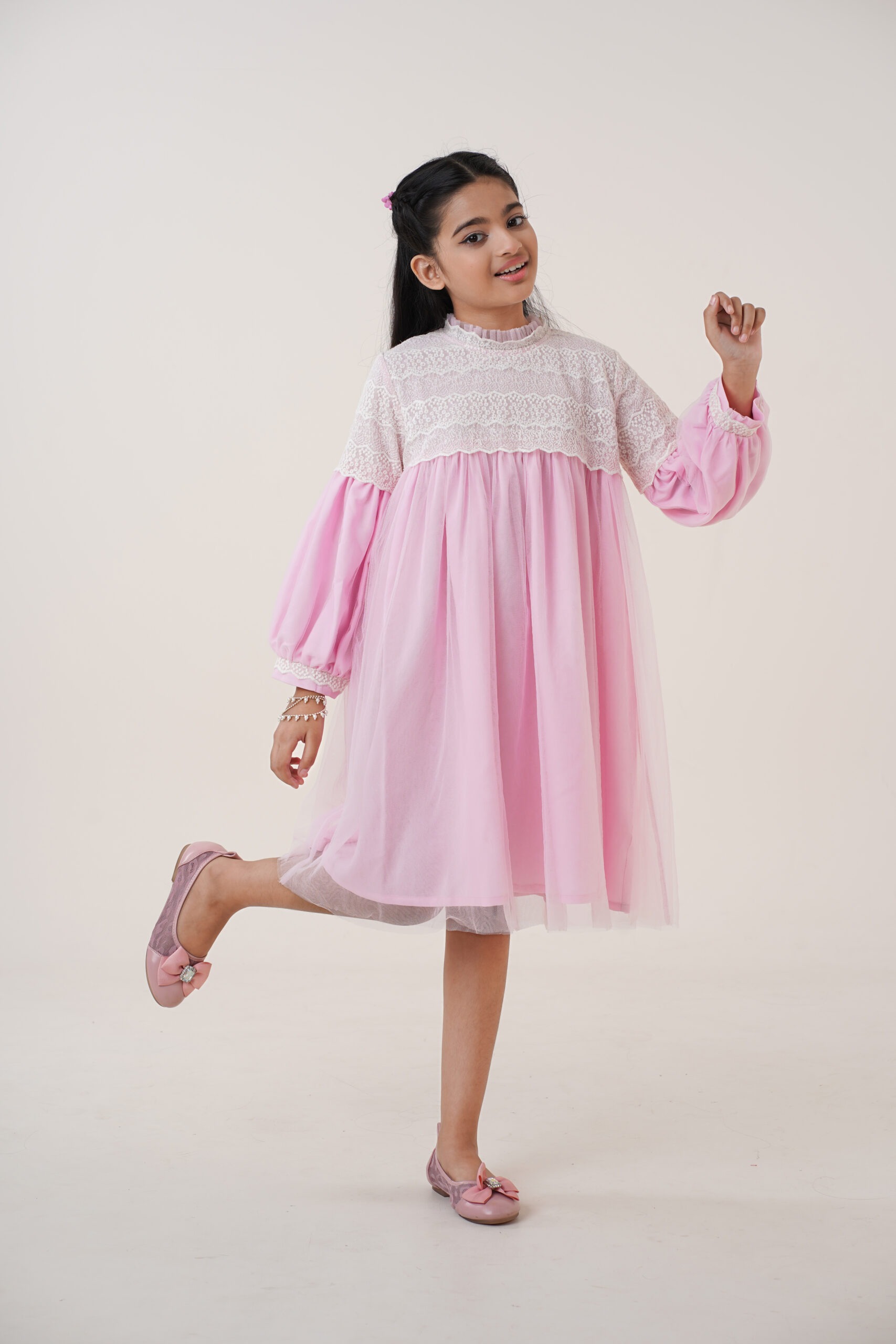 The long puff sleeves with lace-trimmed cuffs add a classic touch, ensuring comfort while maintaining a stylish, graceful appearance. The high neckline with soft ruffle detailing enhances the overall princess-inspired look. The dress is fully lined for modesty and comfort, allowing kids to move freely and play with ease. With its premium-quality fabric and thoughtful construction, this dress promises durability, breathability, and an all-day comfortable fit. Whether she’s twirling around, posing for photos, or standing at the center of attention, this dress ensures she looks adorable and feels confident.