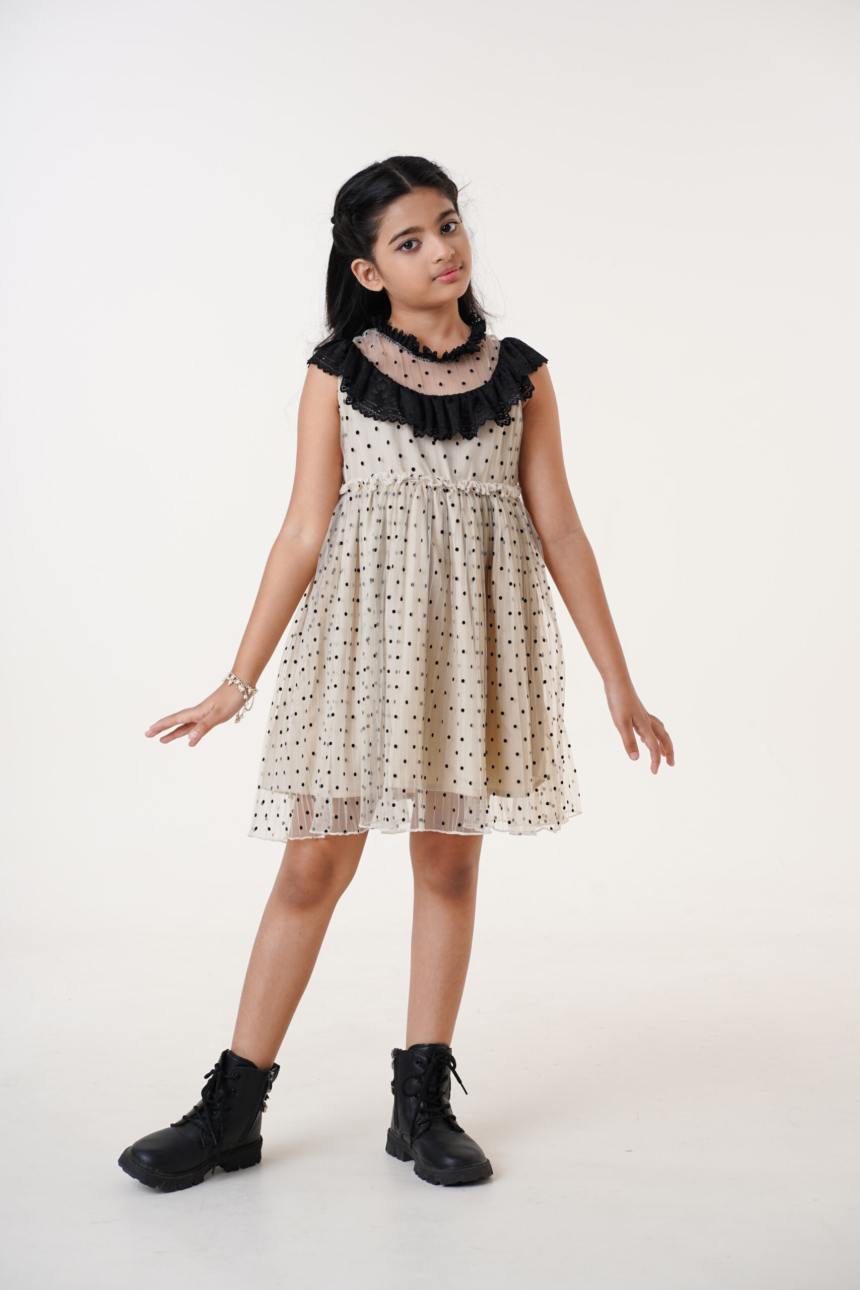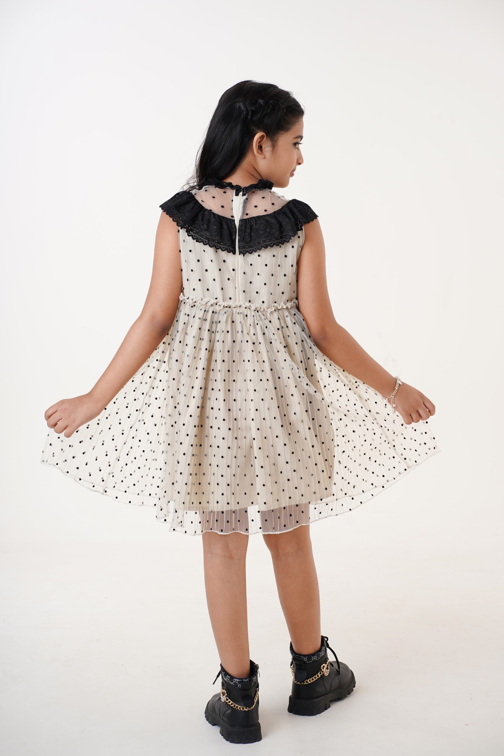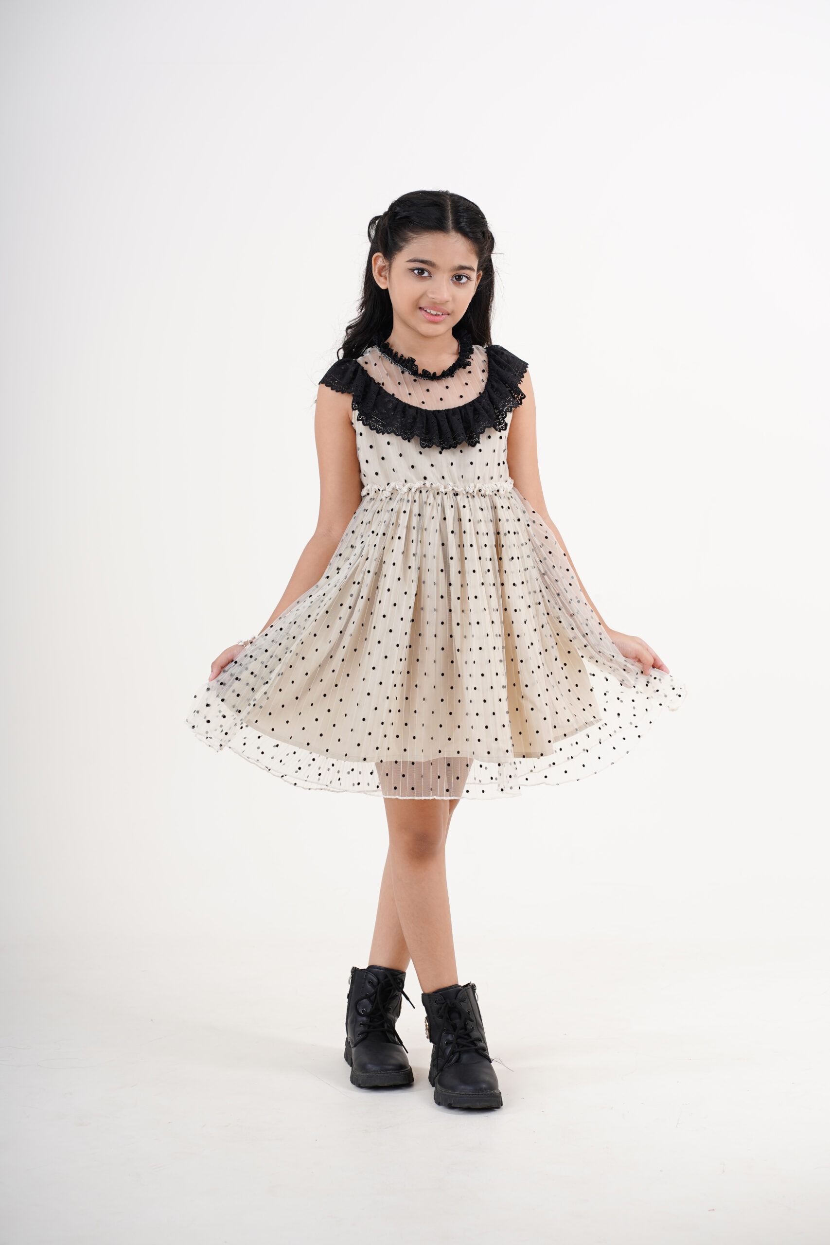 Crafted from a light beige mesh fabric, the frock features classic black polka dots and a lace-ruffled neckline that adds a vintage-inspired charm. The pearl-embroidered waist trim gives a refined and graceful touch, while the flowy skirt ensures easy movement and comfort.