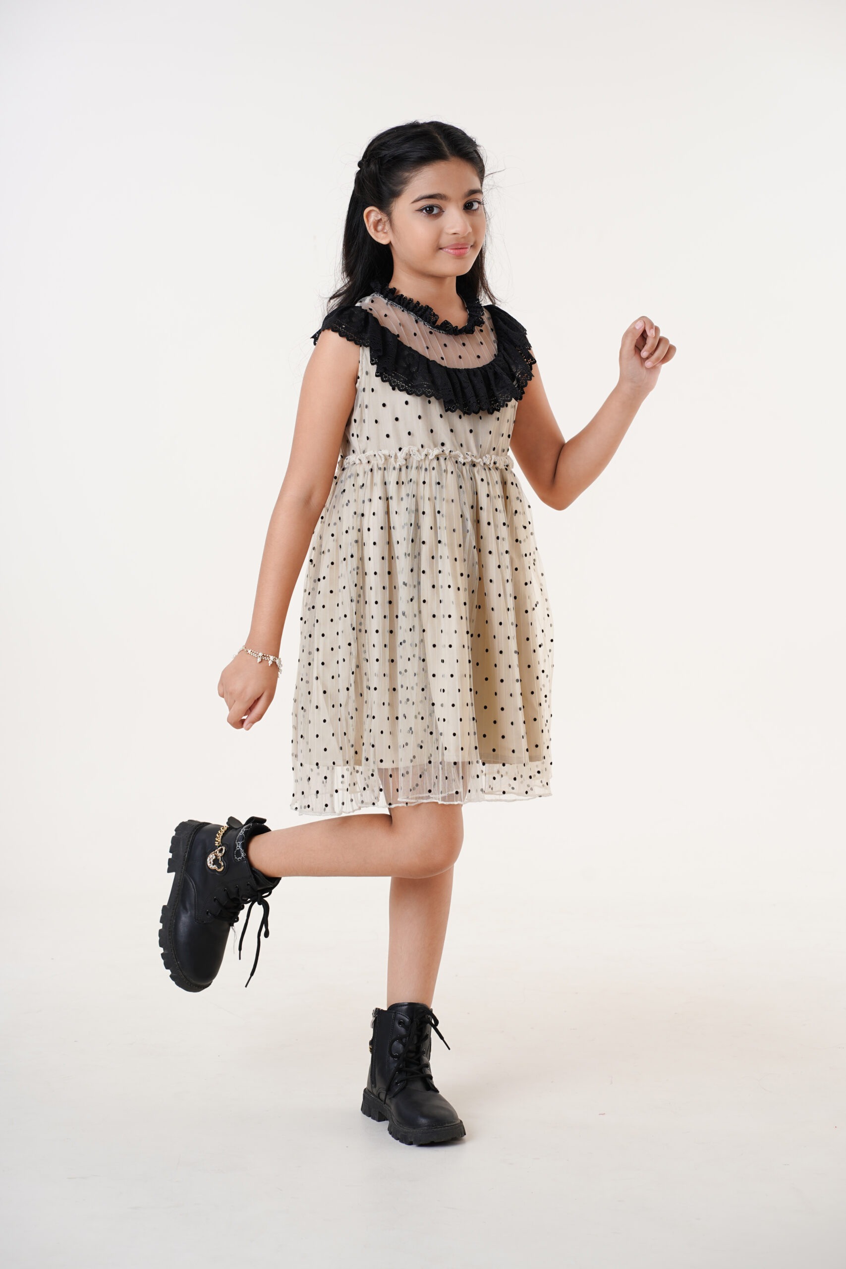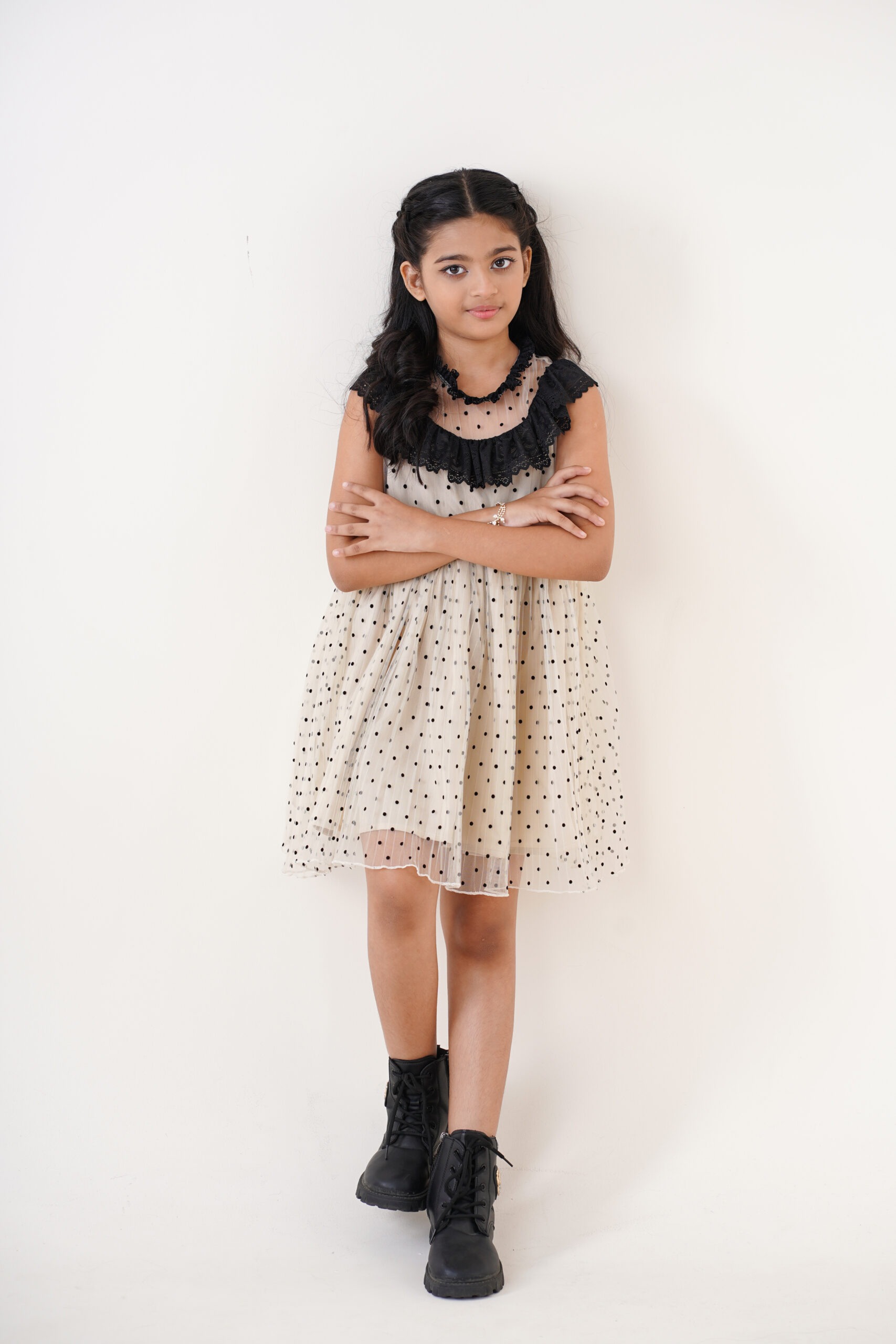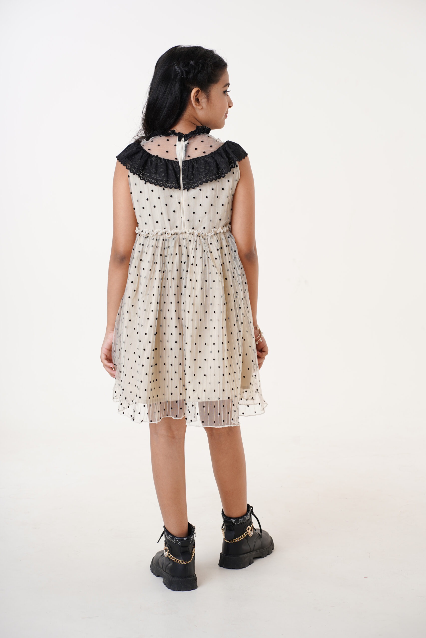 Crafted from a light beige mesh fabric, the frock features classic black polka dots and a lace-ruffled neckline that adds a vintage-inspired charm. The pearl-embroidered waist trim gives a refined and graceful touch, while the flowy skirt ensures easy movement and comfort.