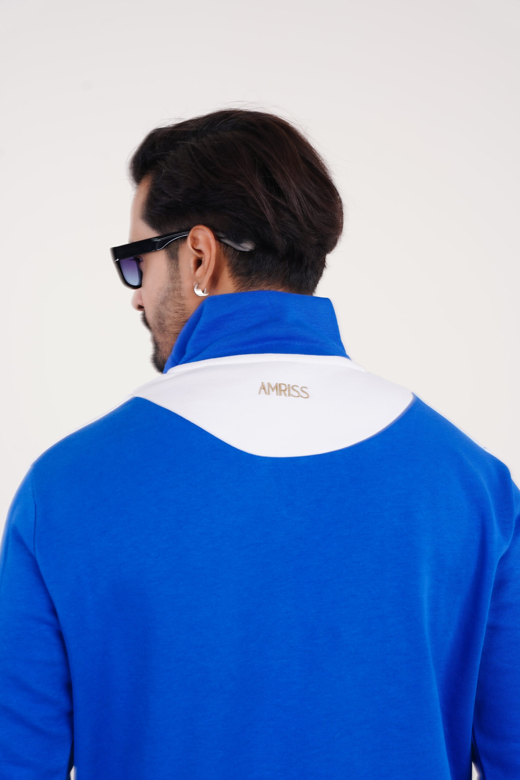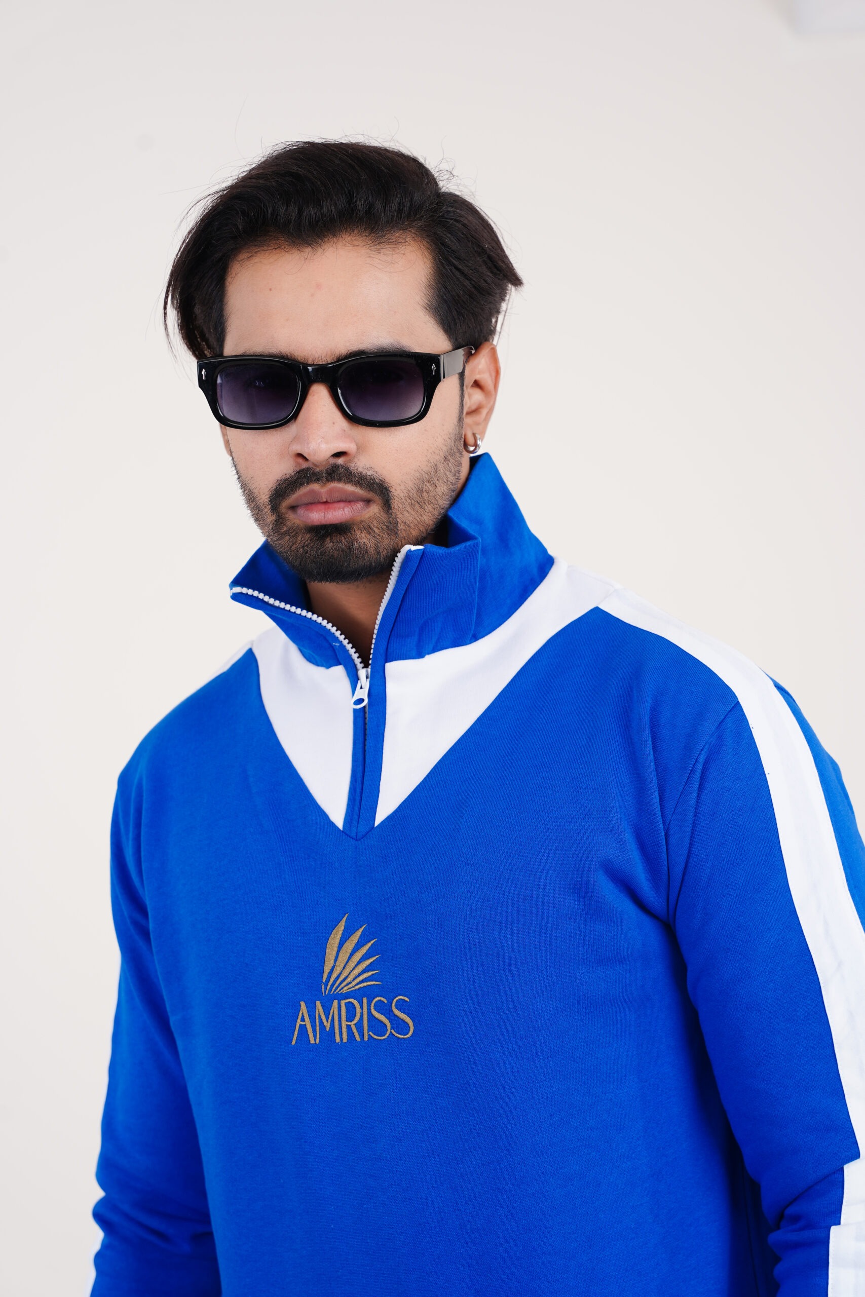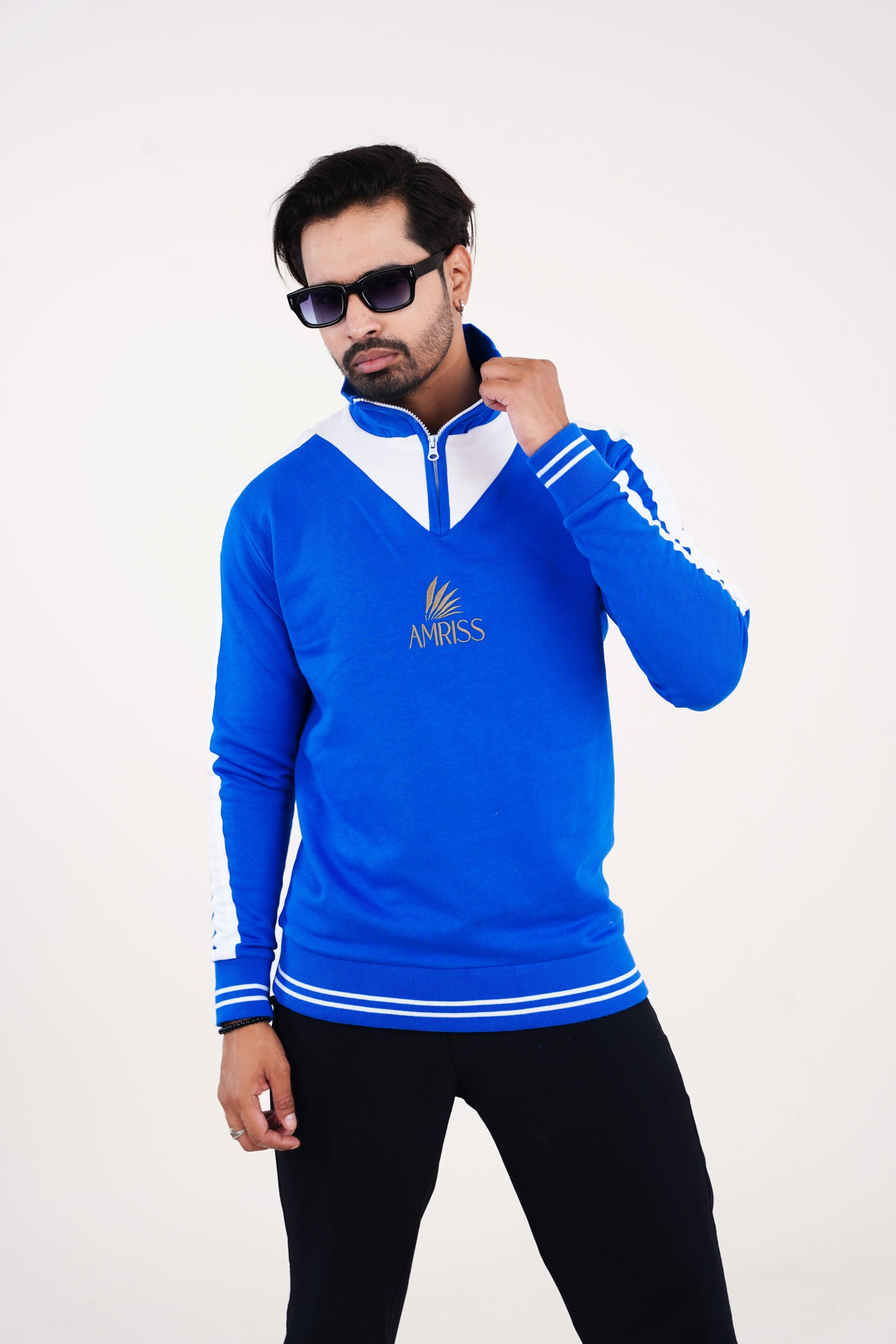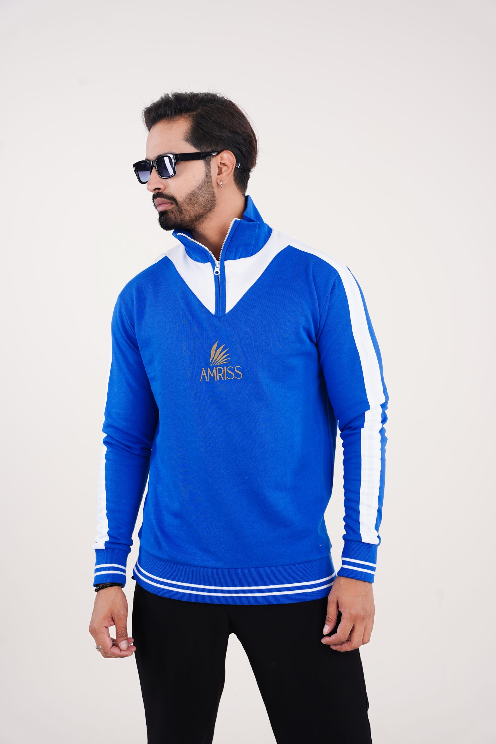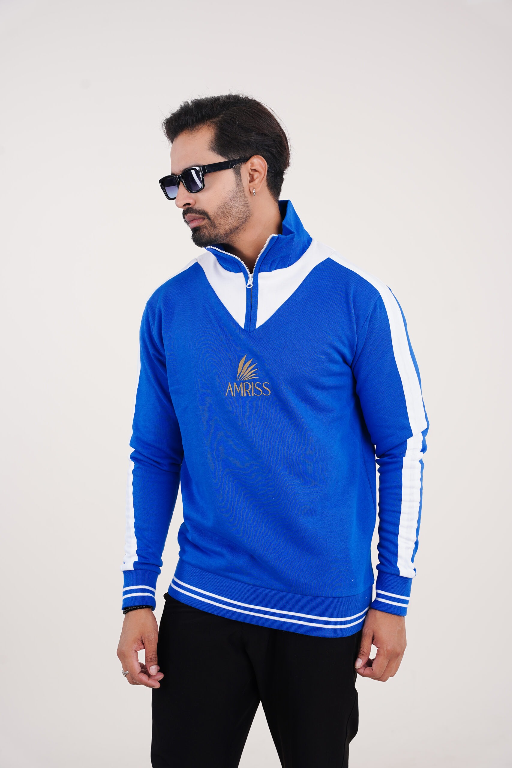 This urban top sweatshirt is designed for men who prefer a sporty yet refined cold-weather look. Crafted in a rich royal blue tone, the sweatshirt features clean white contrast panels along the shoulders and sleeves, creating a bold athletic presence. The half zip front is paired with a structured stand collar offering adjustable warmth and a modern silhouette.