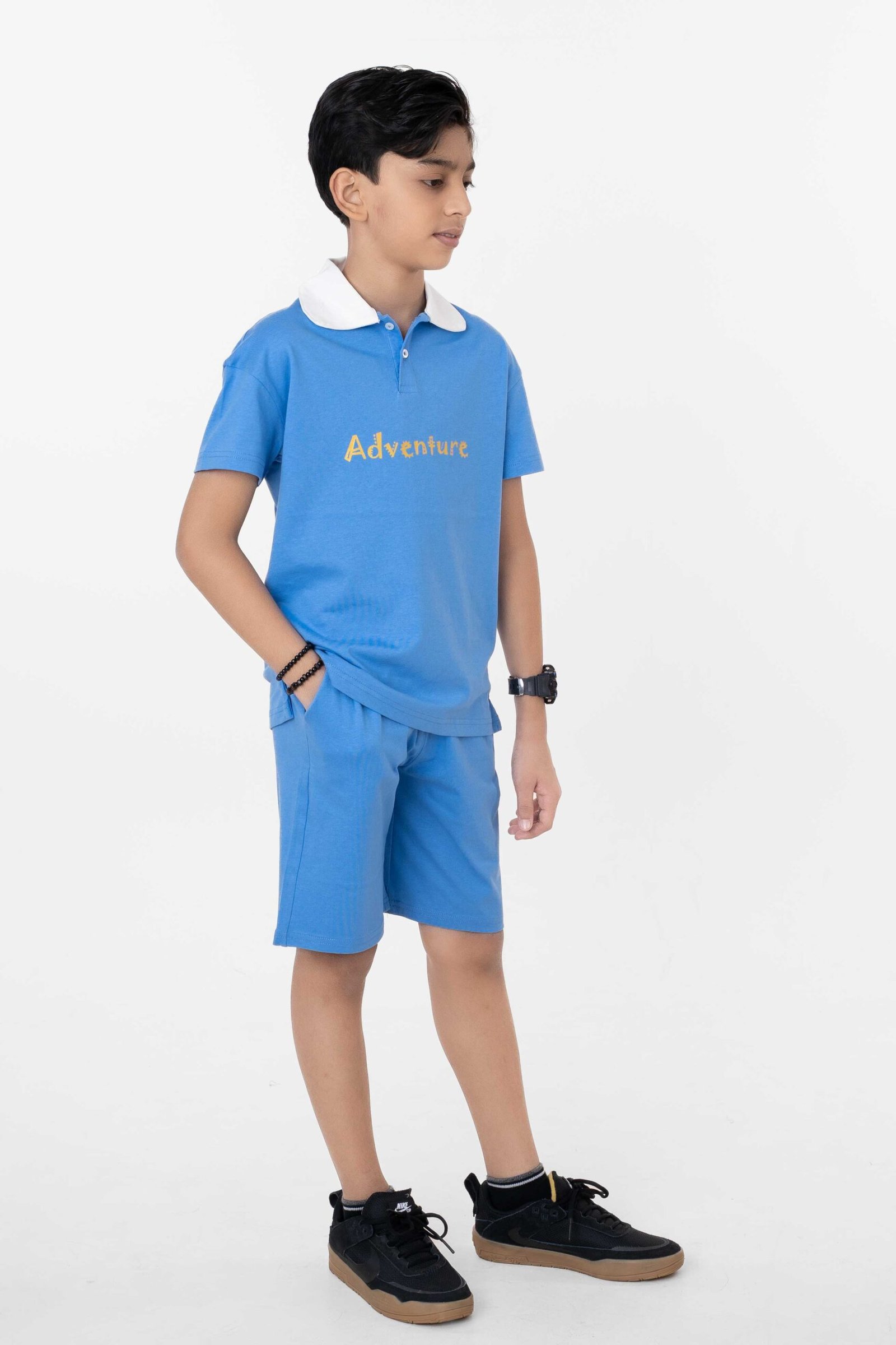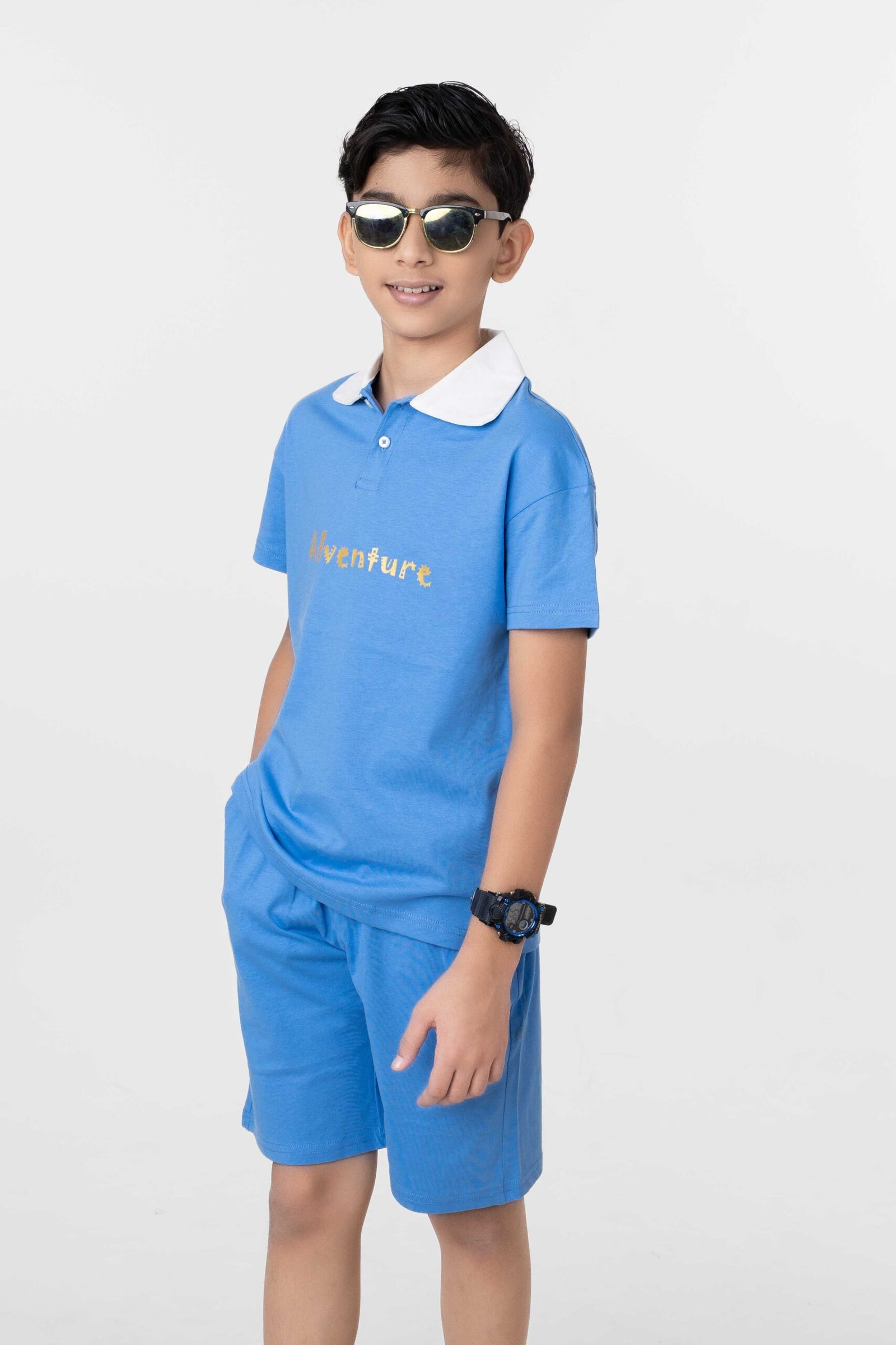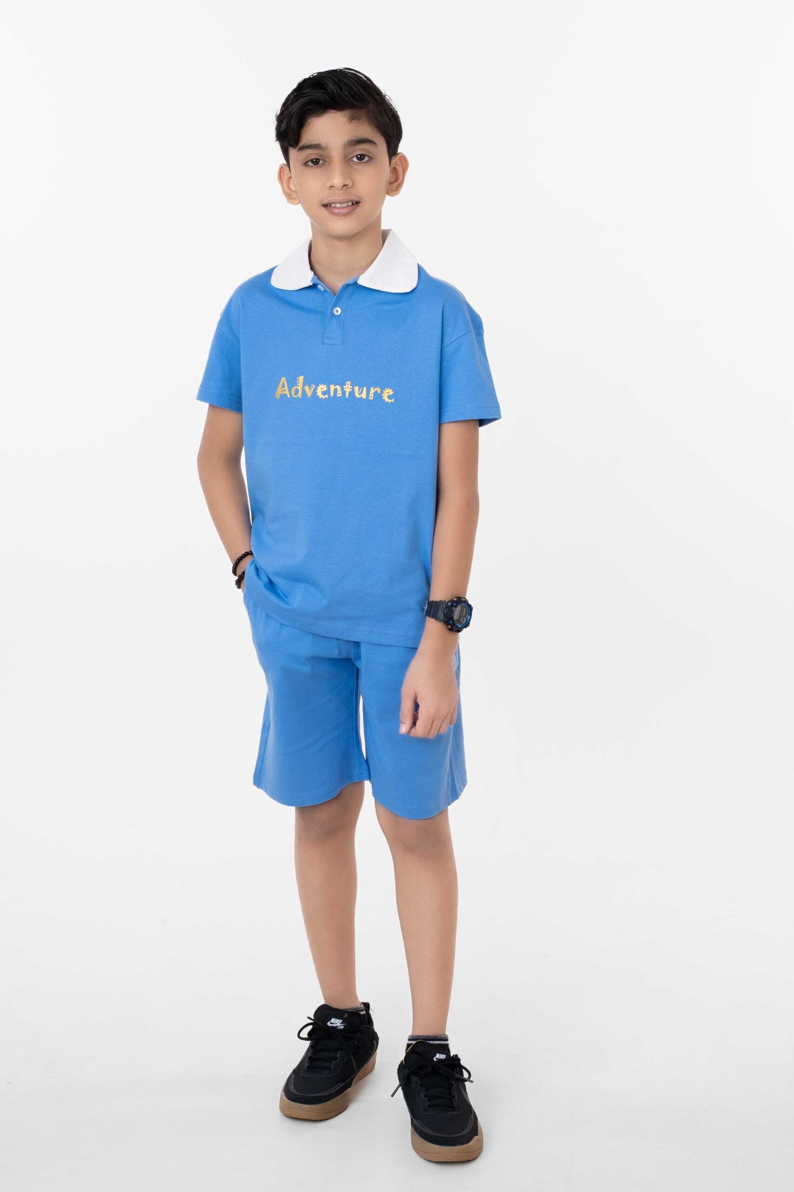 • Design: Polo T-shirt with “Adventure” print, matching comfy shorts