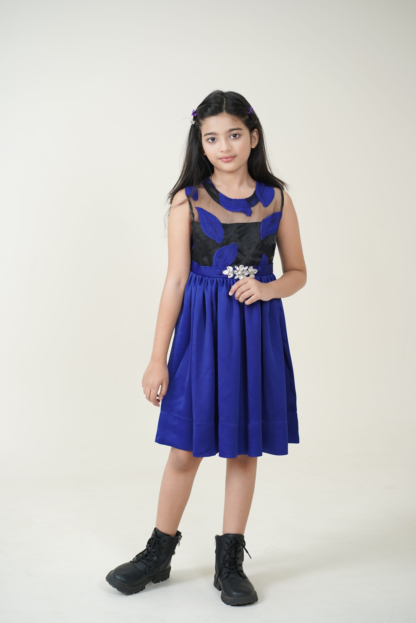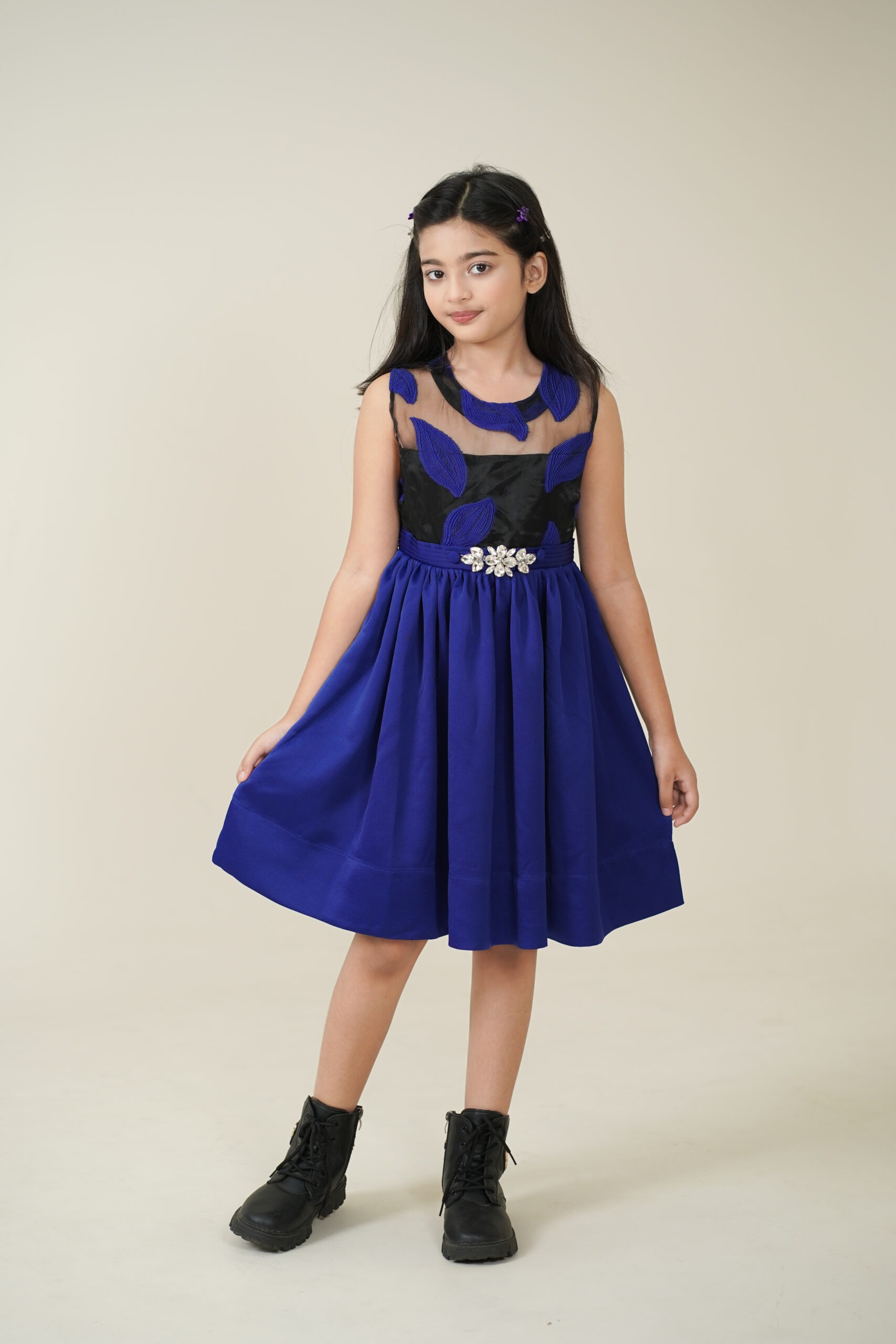 Kids Elegant Occasion Wear Frock Little Girls’ Royal Blue & Black Embellished Party Dress Sleeveless Mesh Bodice