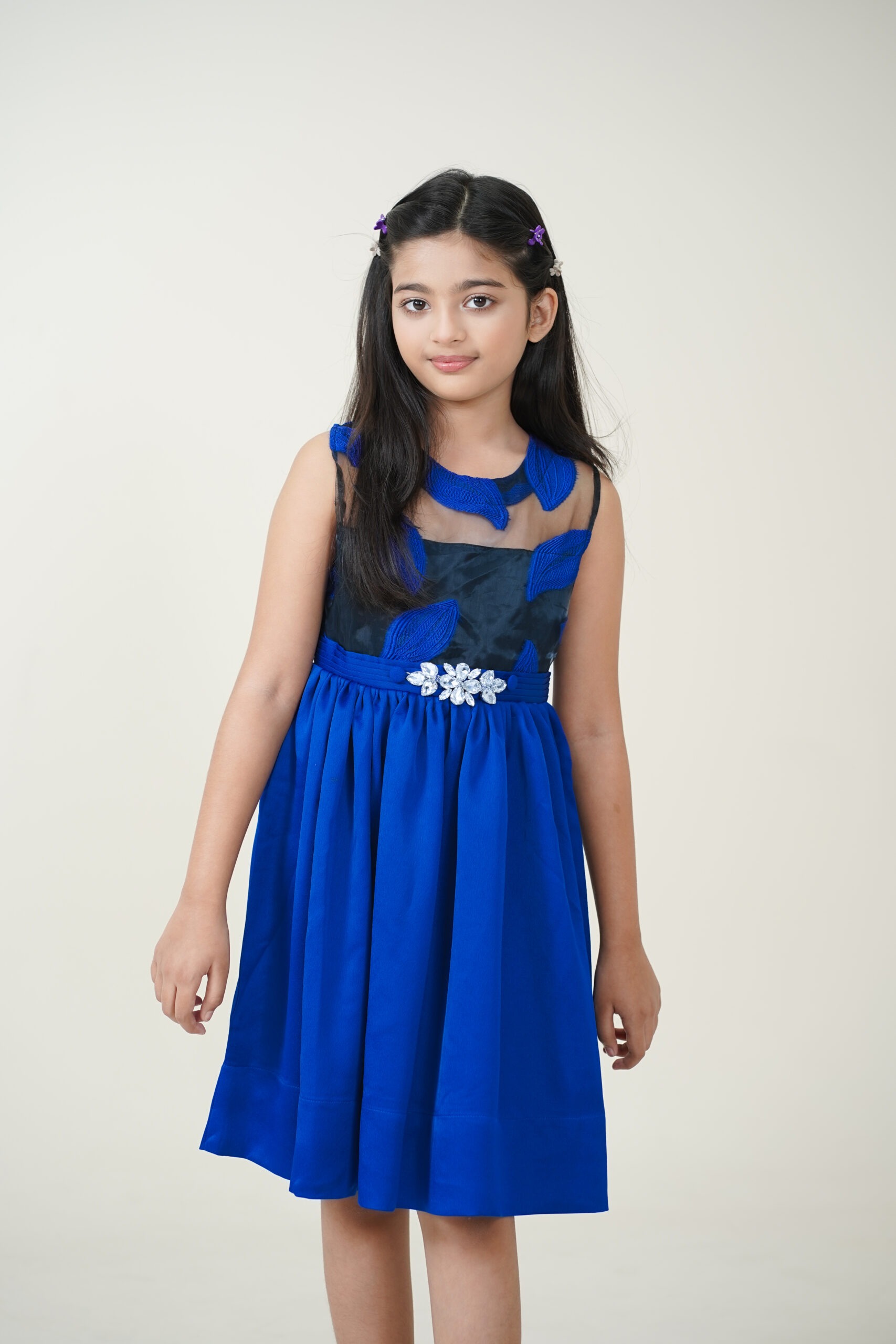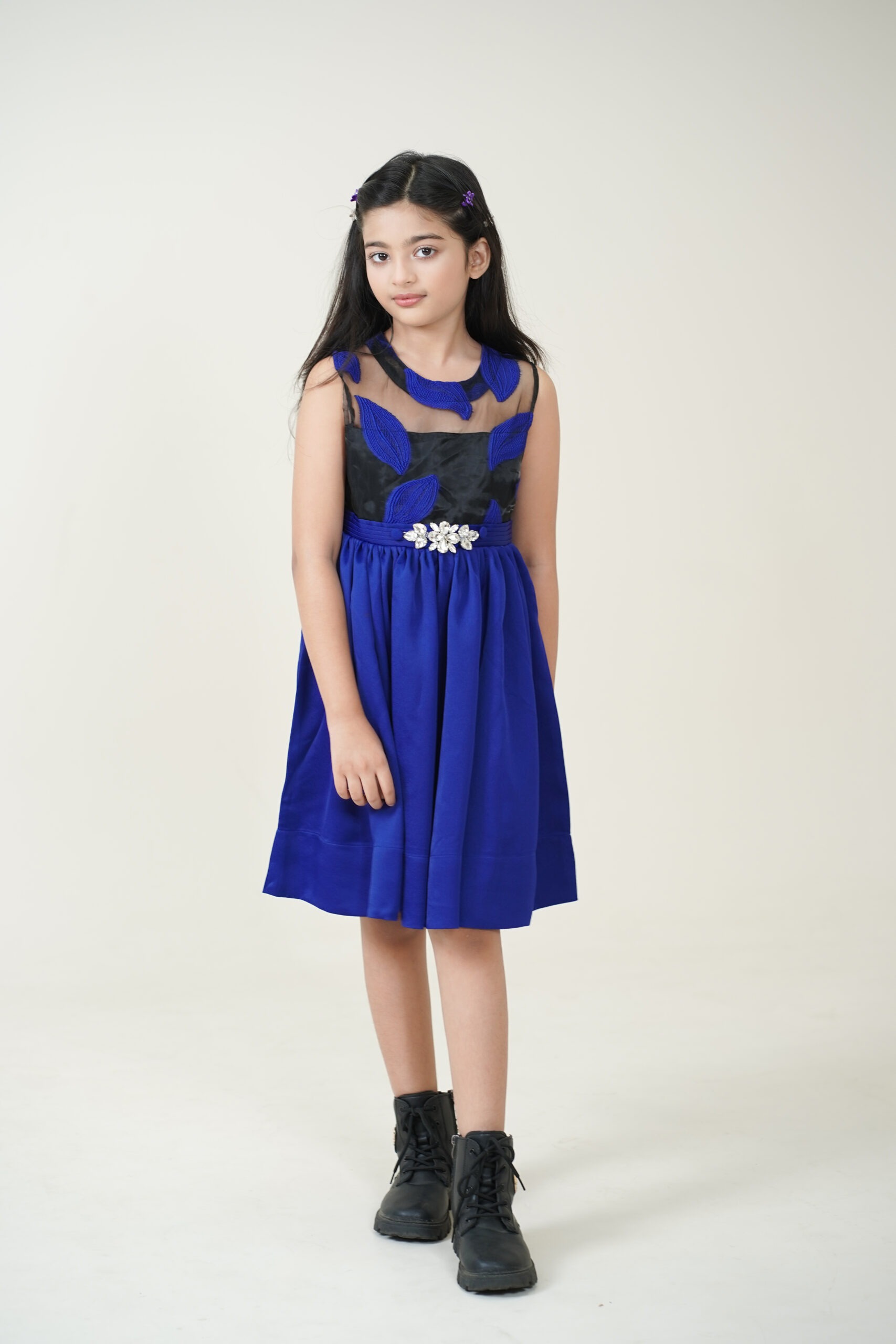Make your little one shine with this Girls’ Royal Blue & Black Embellished Party Dress, a perfect blend of elegance, comfort, and youthful charm. Crafted from premium satin and mesh fabrics, this sleeveless dress is designed for effortless grace — ideal for birthday parties, festive gatherings, or special celebrations.