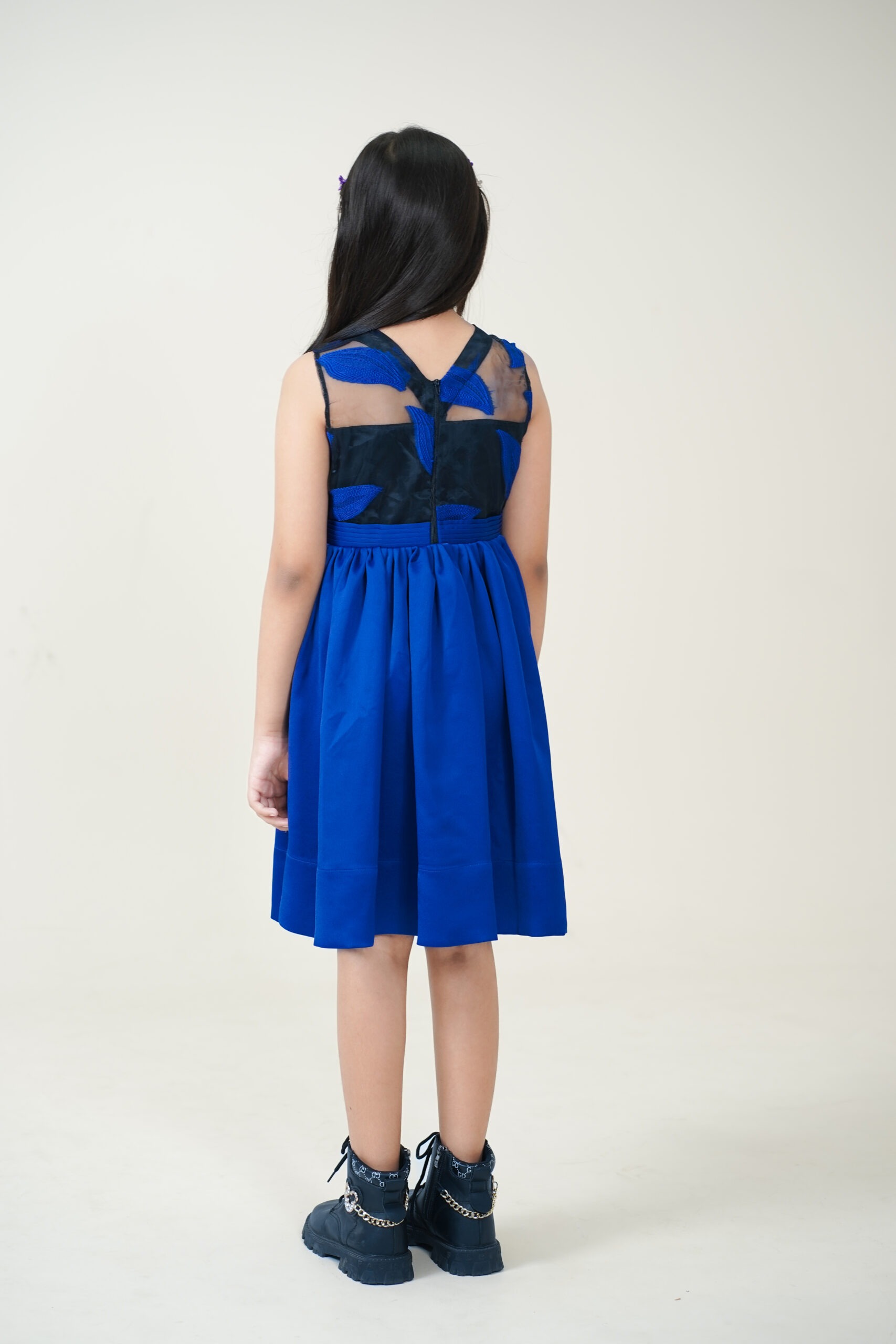 The black mesh bodice is adorned with textured blue leaf appliqués, creating a striking, artistic look. A sparkling crystal brooch cinches the waist, adding a hint of glamour, while the royal blue pleated skirt flows beautifully for a picture-perfect finish.