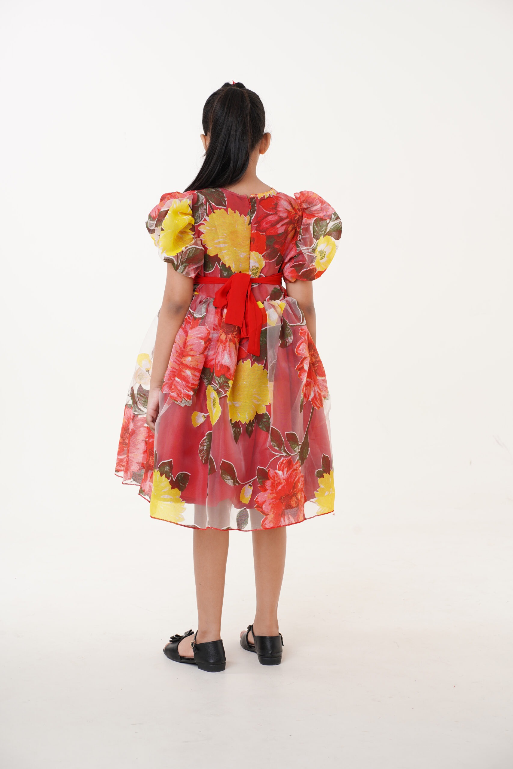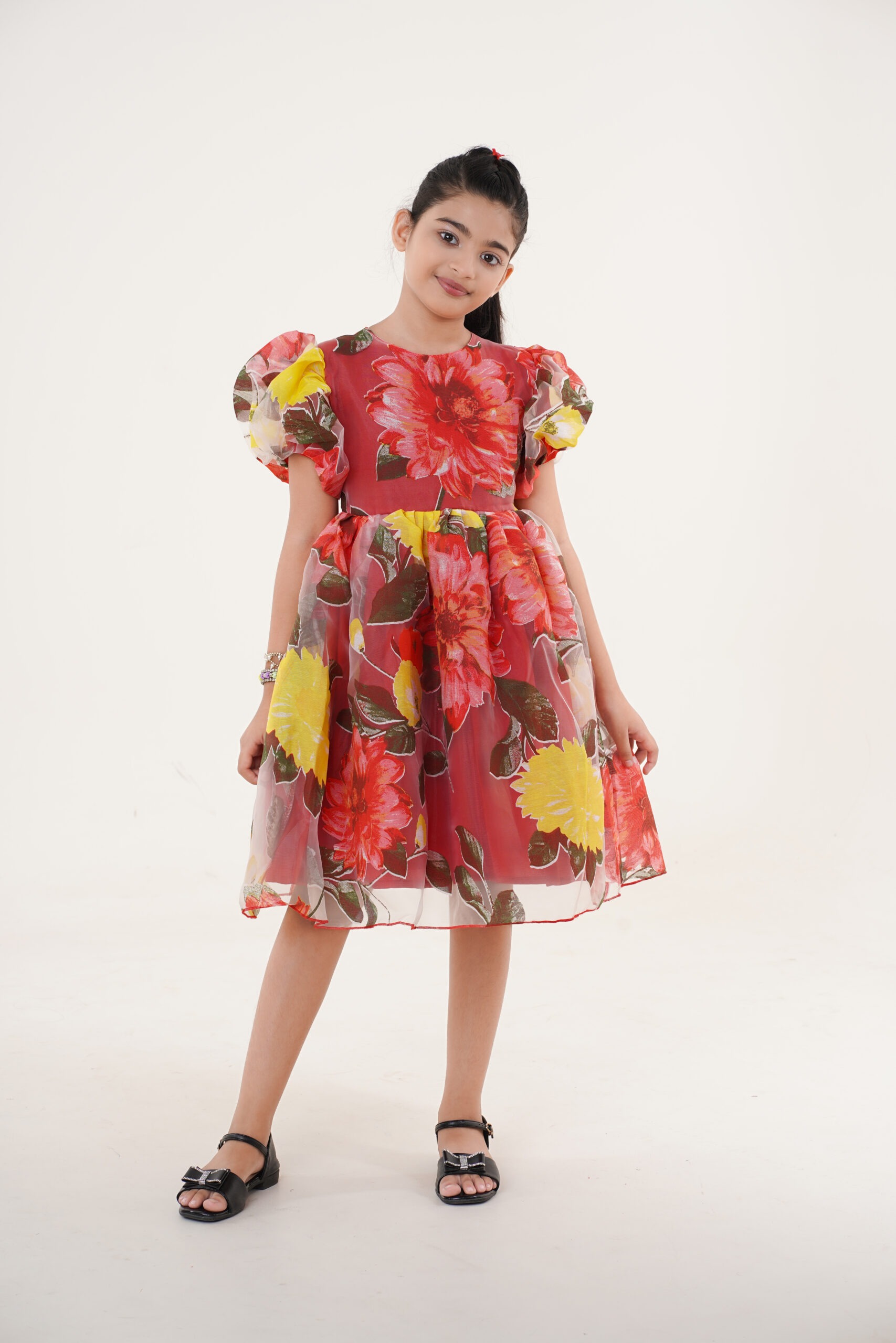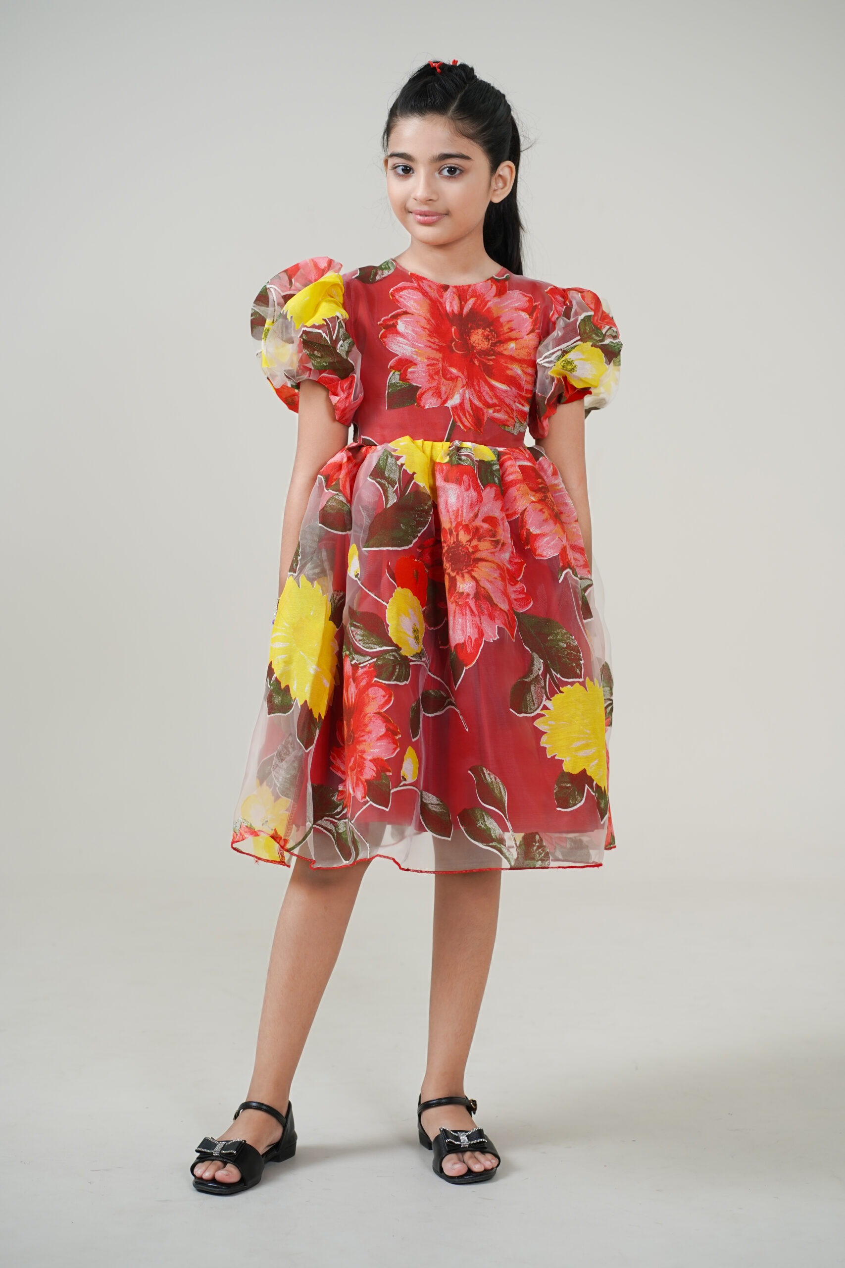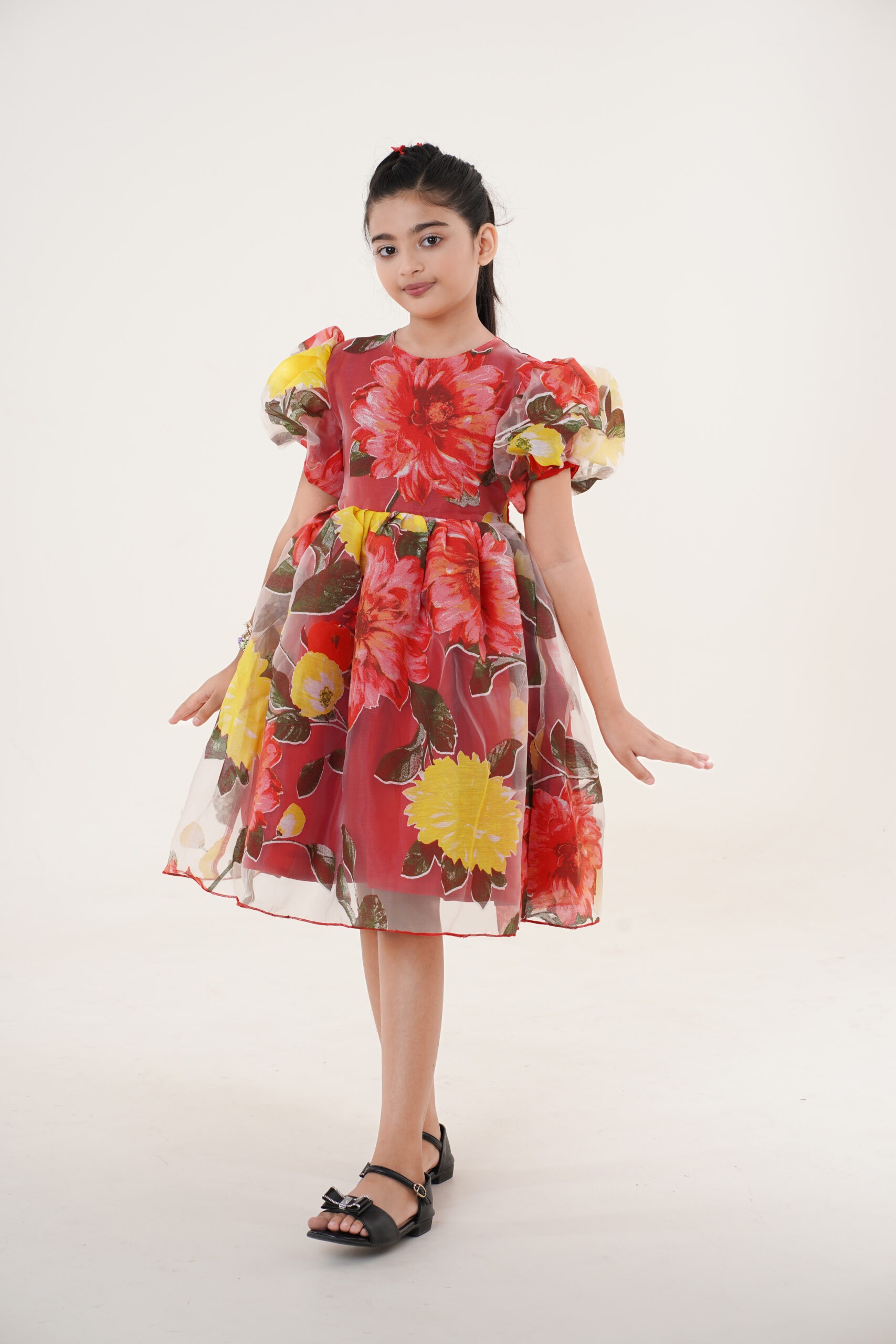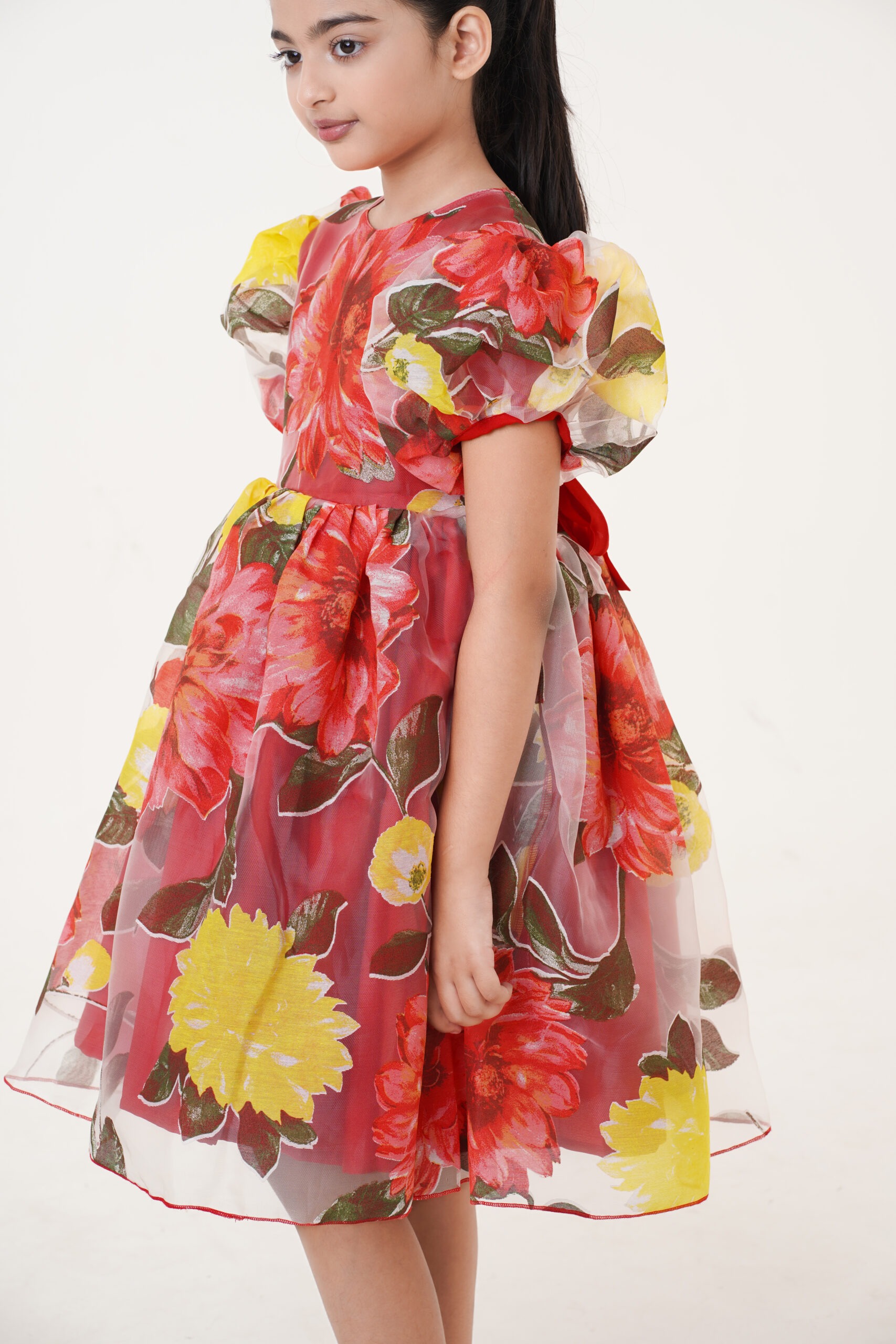 Crafted from lightweight organza fabric, it features a vibrant floral print in shades of red, yellow, and green, giving it a cheerful yet graceful appeal. The puffed sleeves and flared knee-length skirt add volume and sophistication, making it perfect for festive celebrations, birthdays, or special family gatherings.