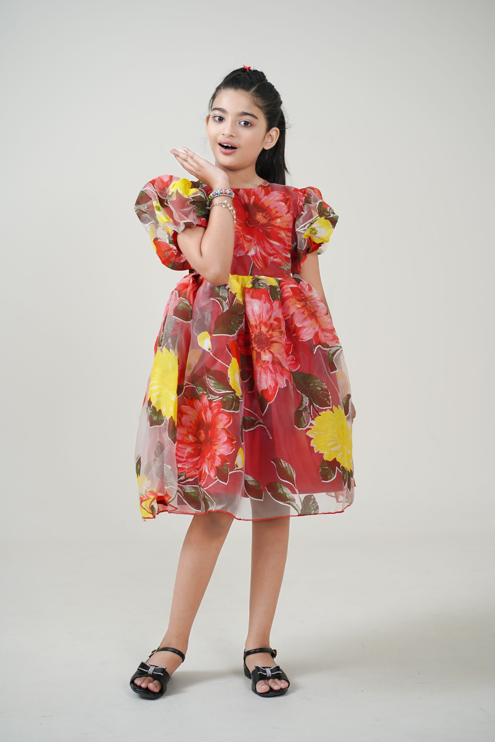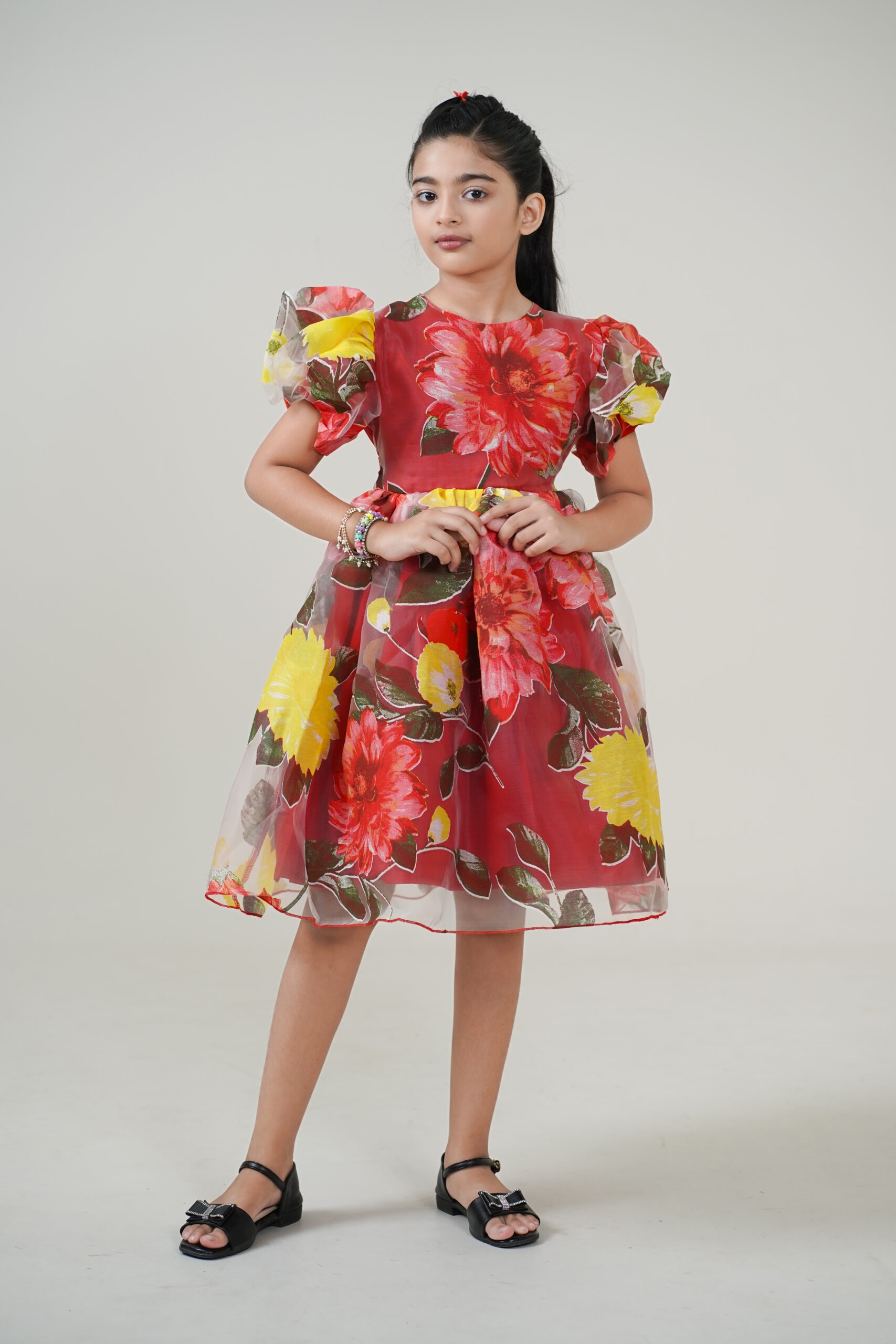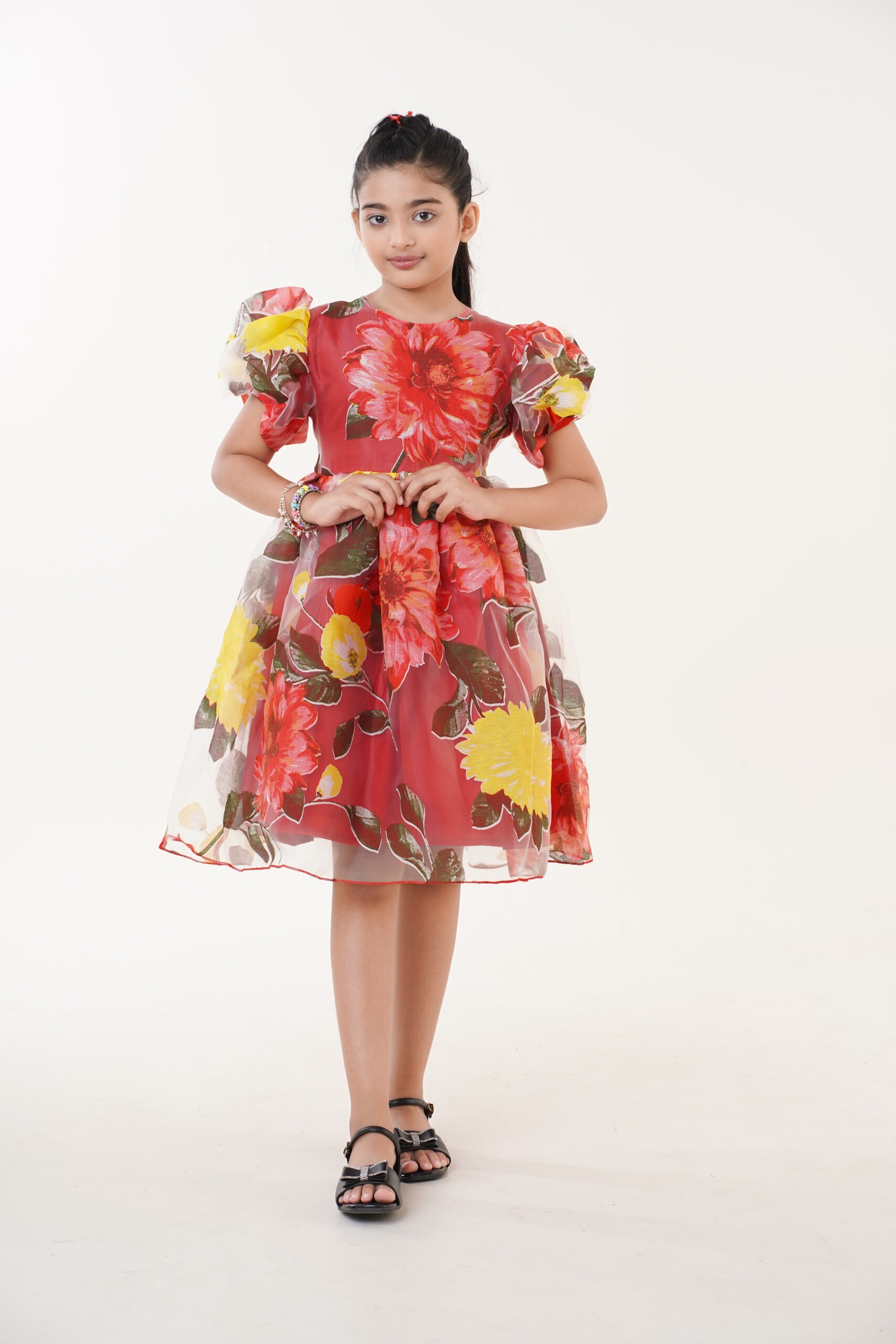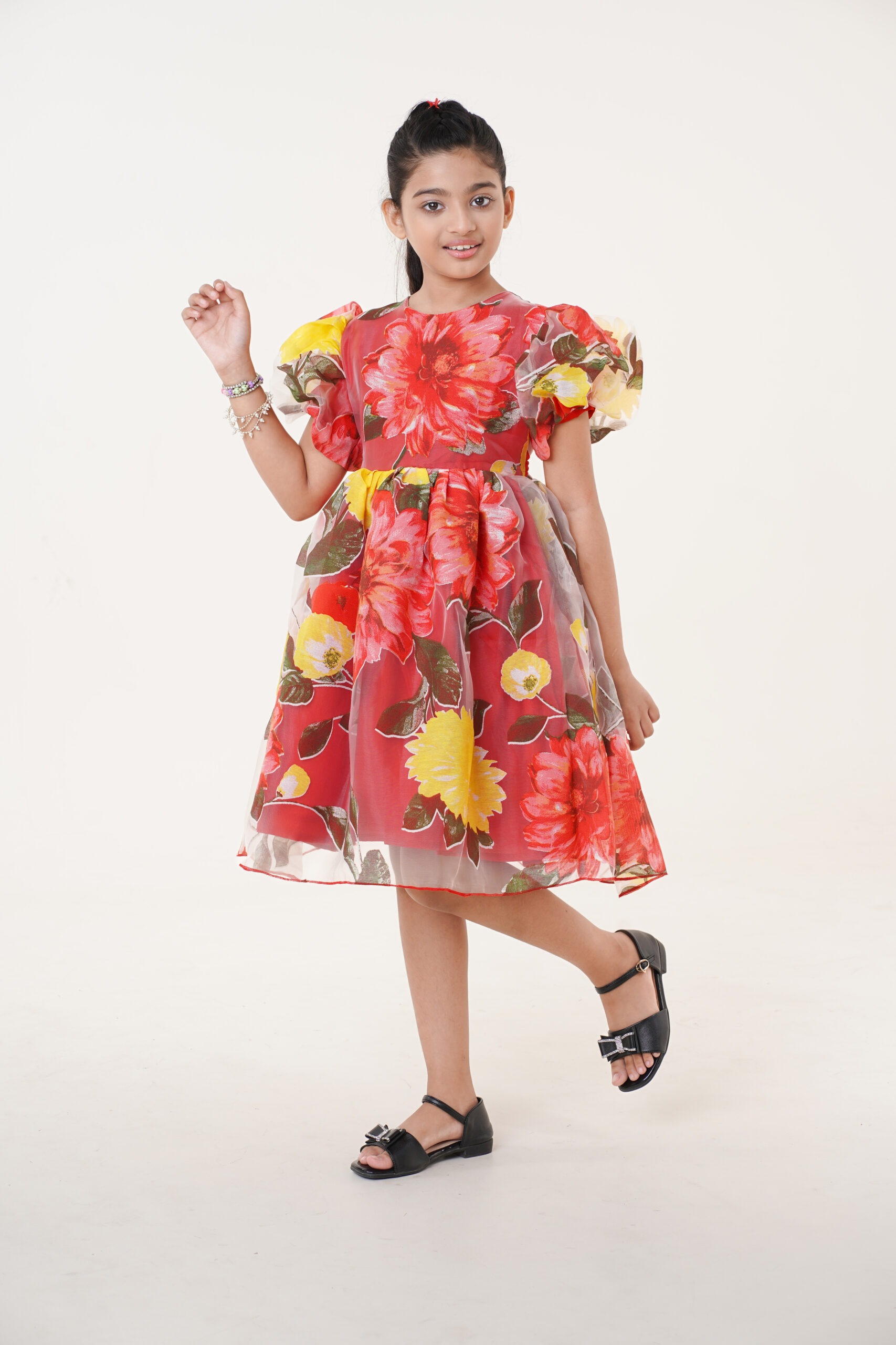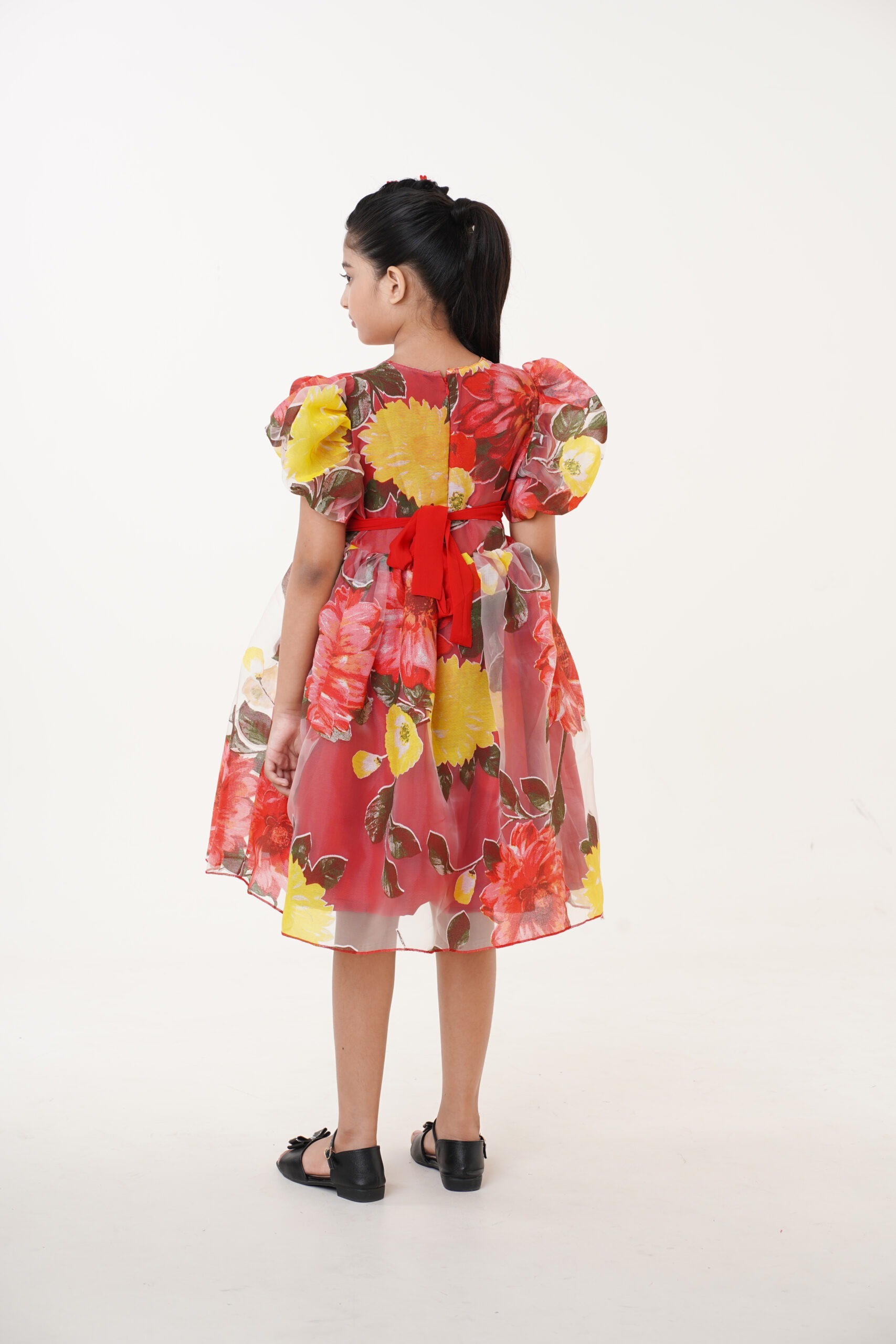 Crafted from lightweight organza fabric, it features a vibrant floral print in shades of red, yellow, and green, giving it a cheerful yet graceful appeal. The puffed sleeves and flared knee-length skirt add volume and sophistication, making it perfect for festive celebrations, birthdays, or special family gatherings.