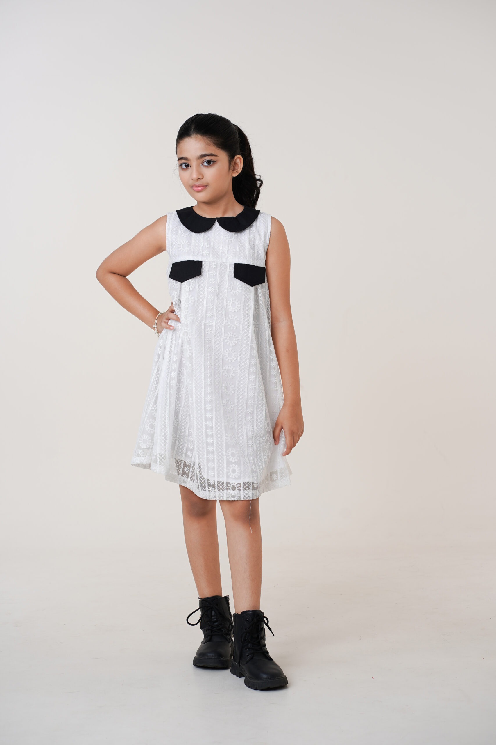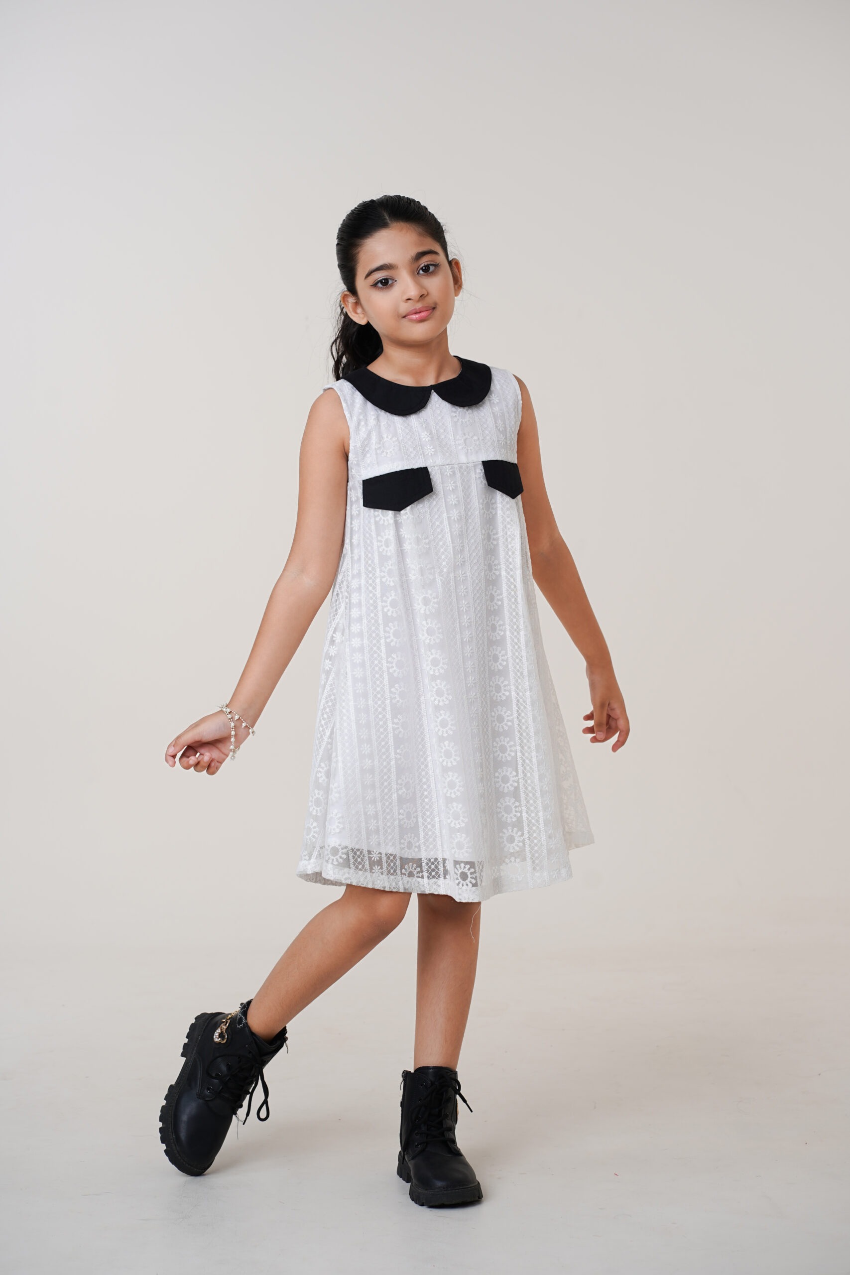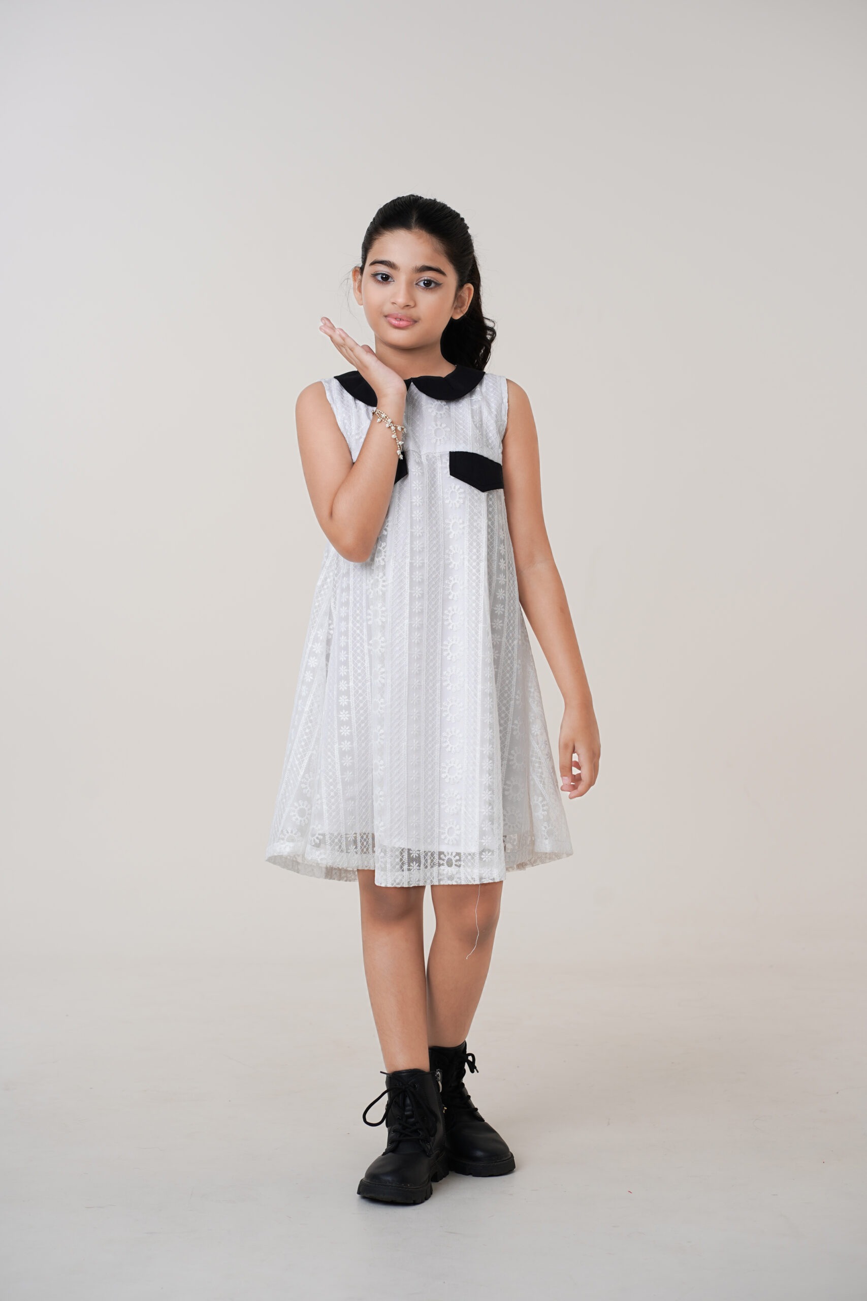 Little Girls’ White Lace A-Line Dress with Black Collar & Bow Detail Frock Kids Party Wear