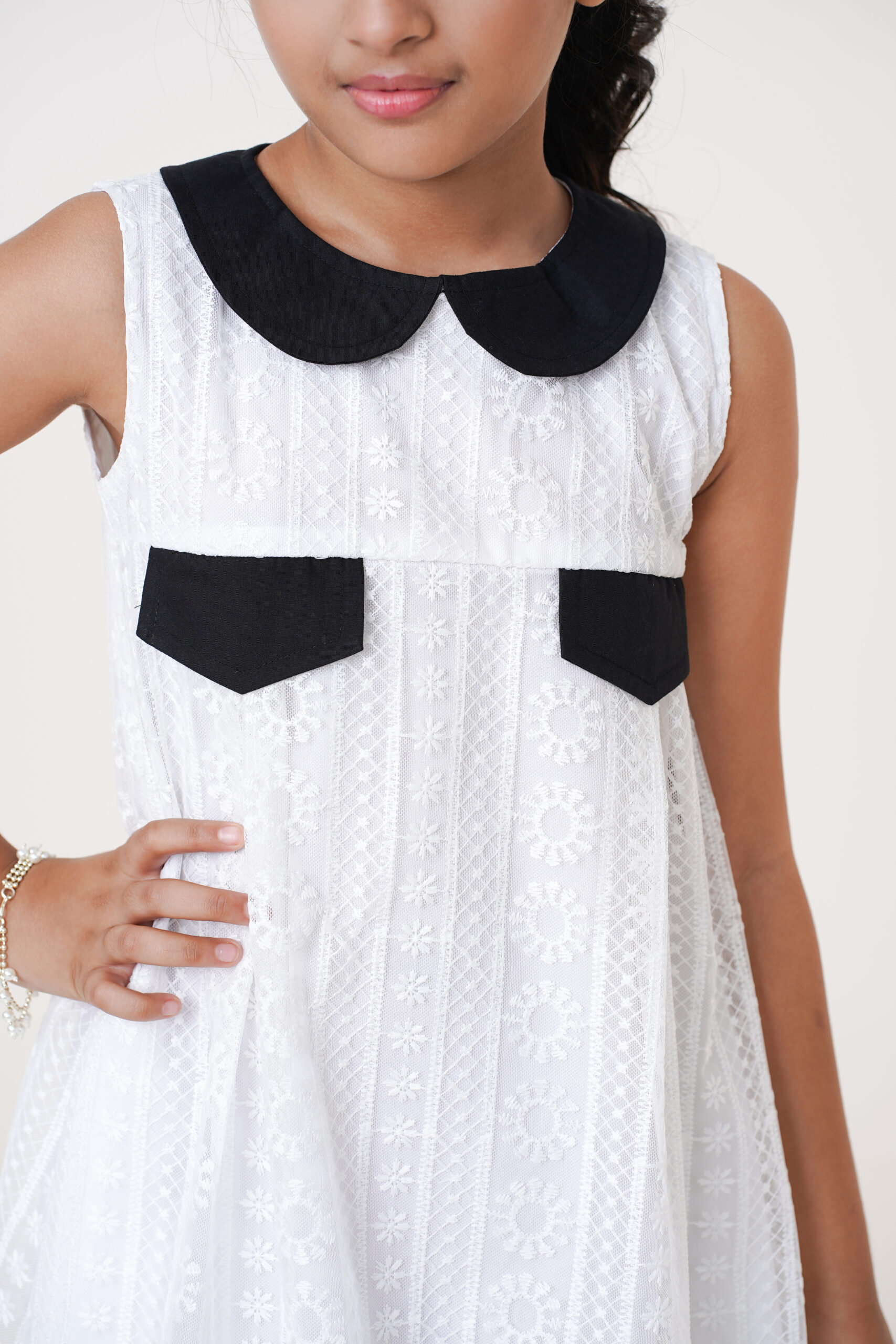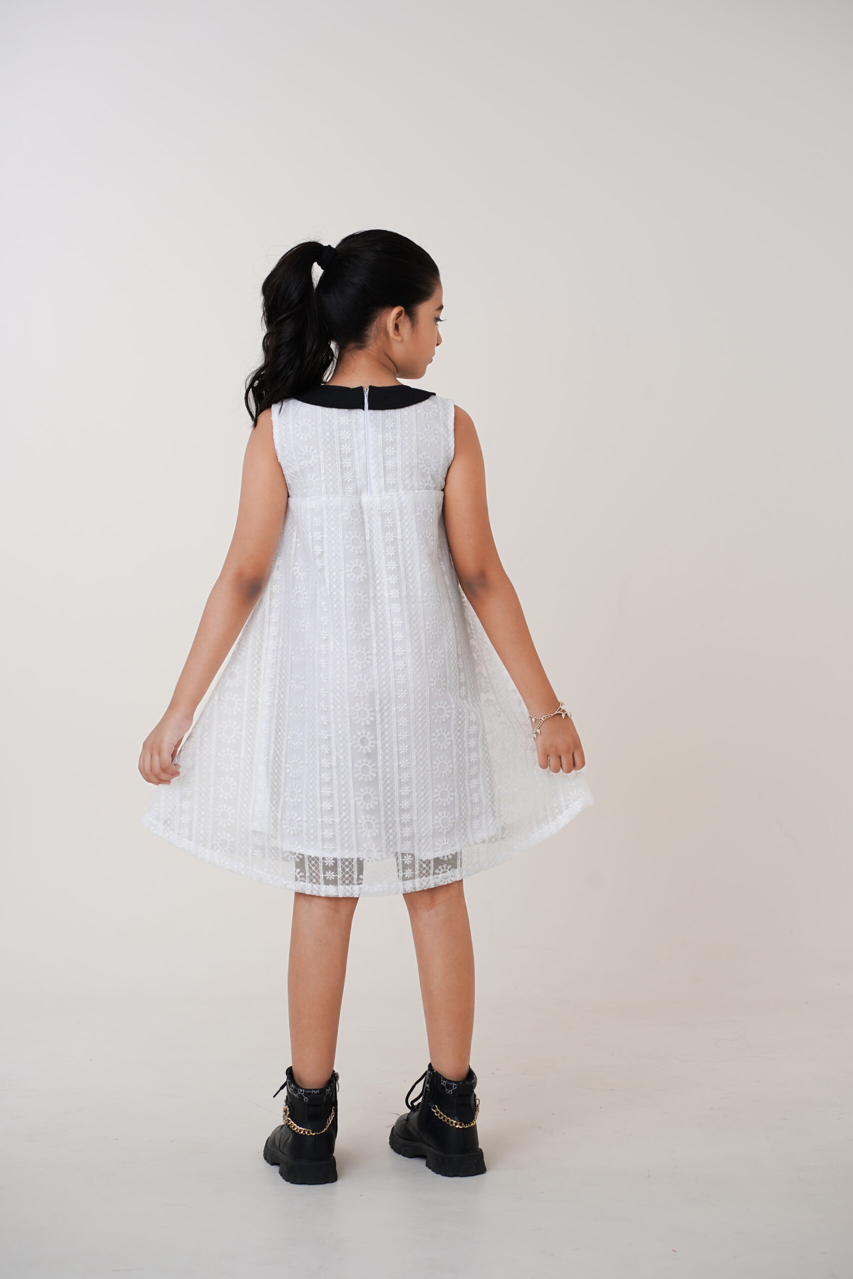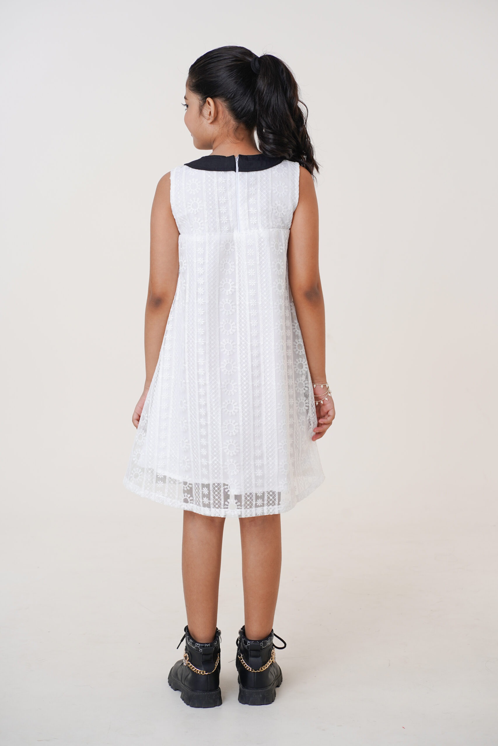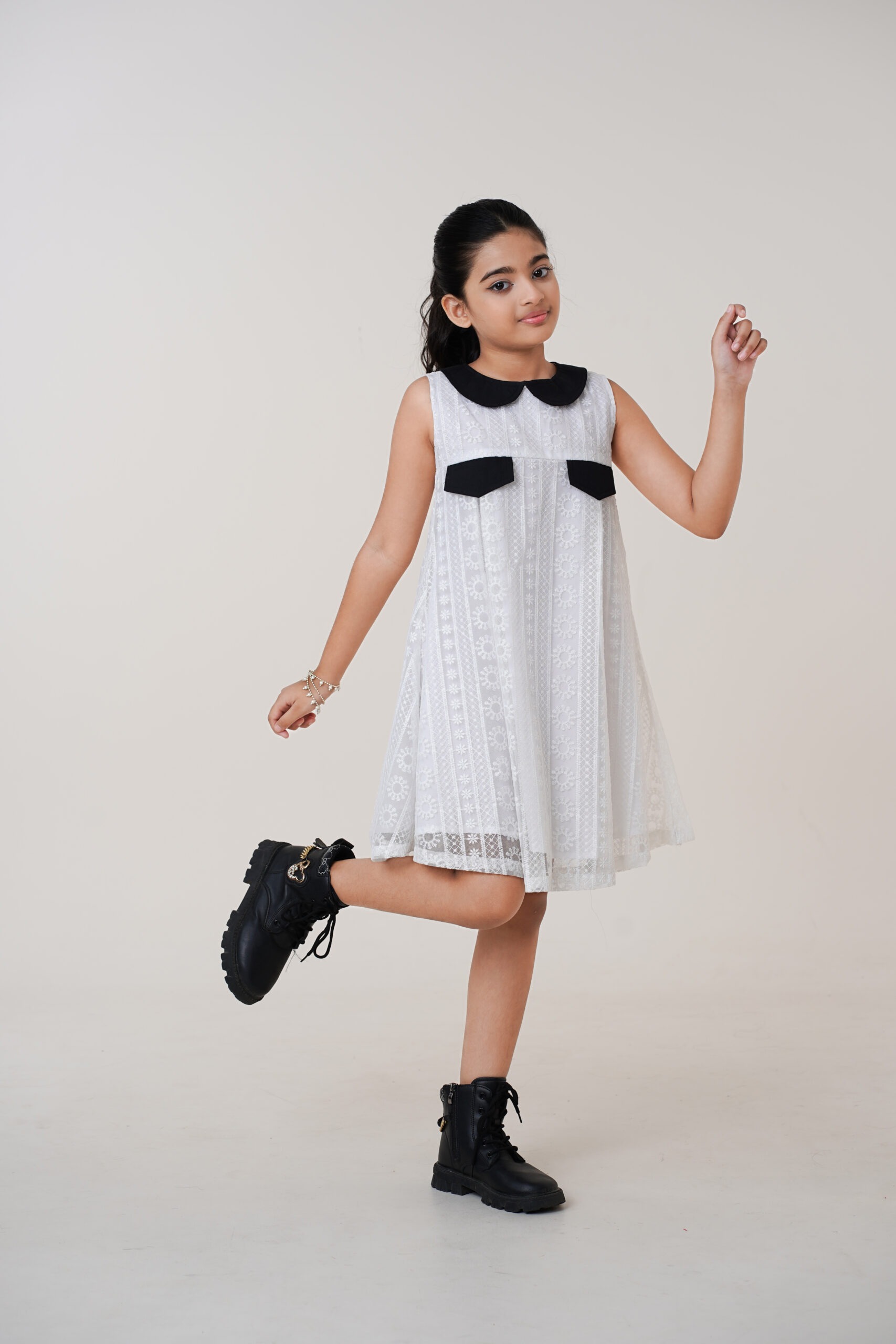 Little Girls’ White Lace A-Line Dress with Black Collar & Bow Detail Frock Kids Party Wear
